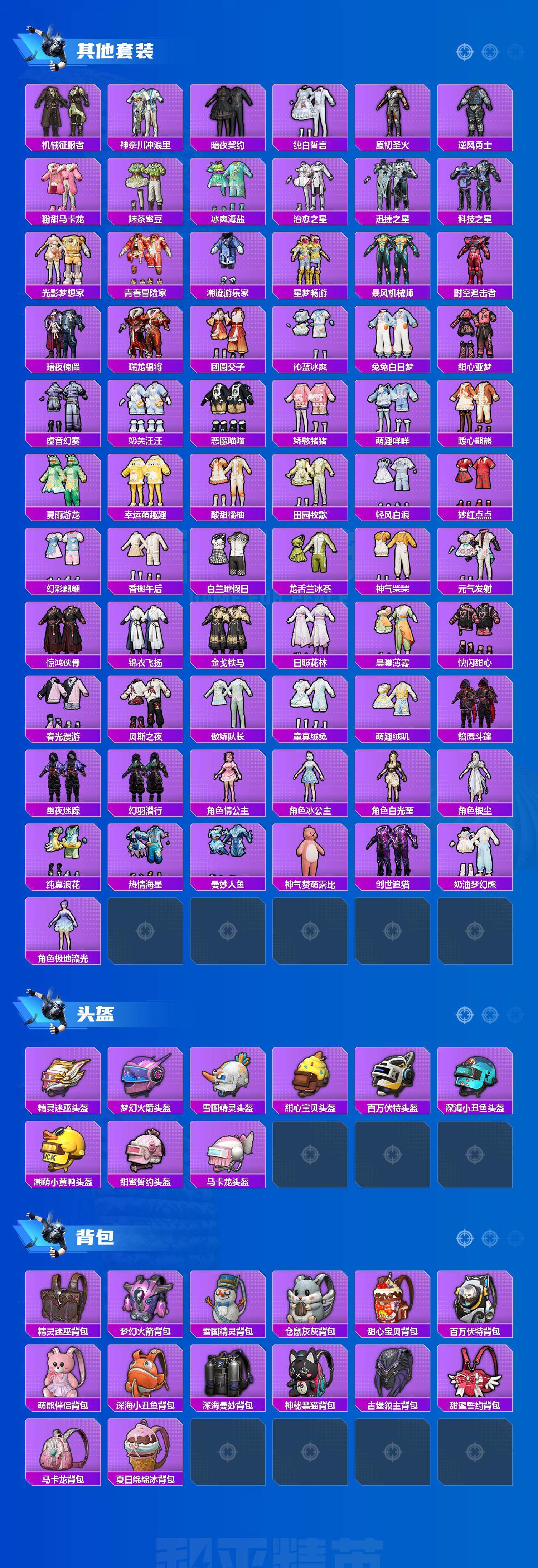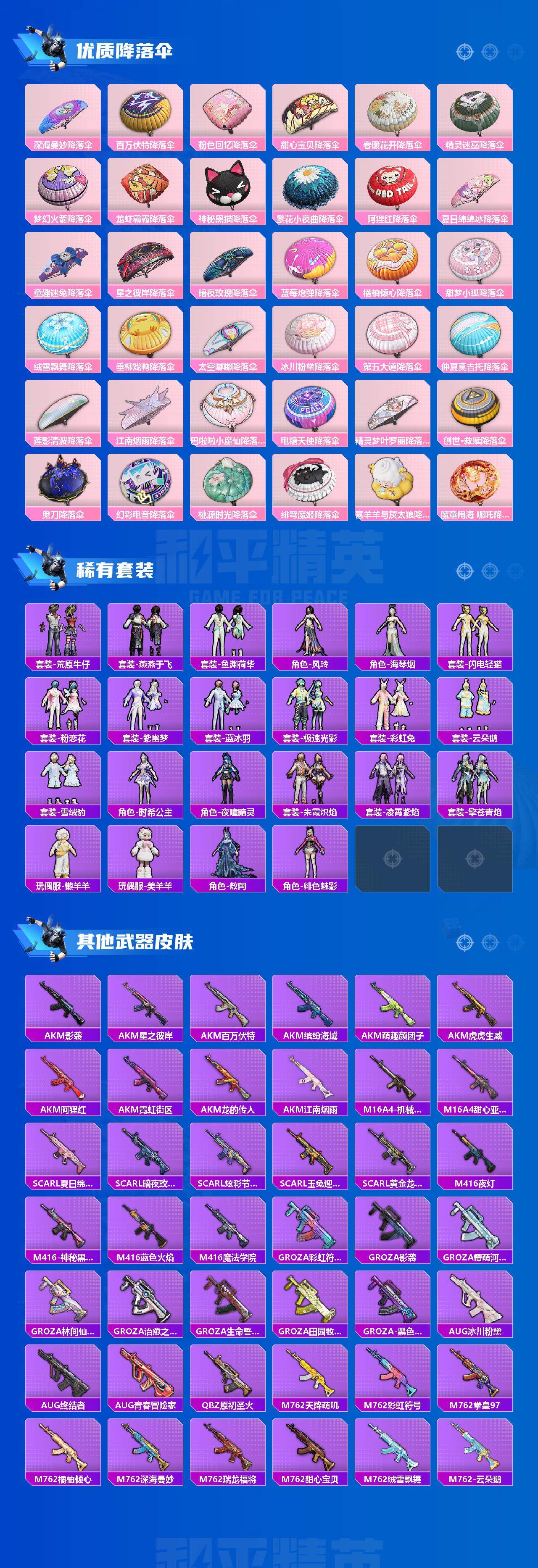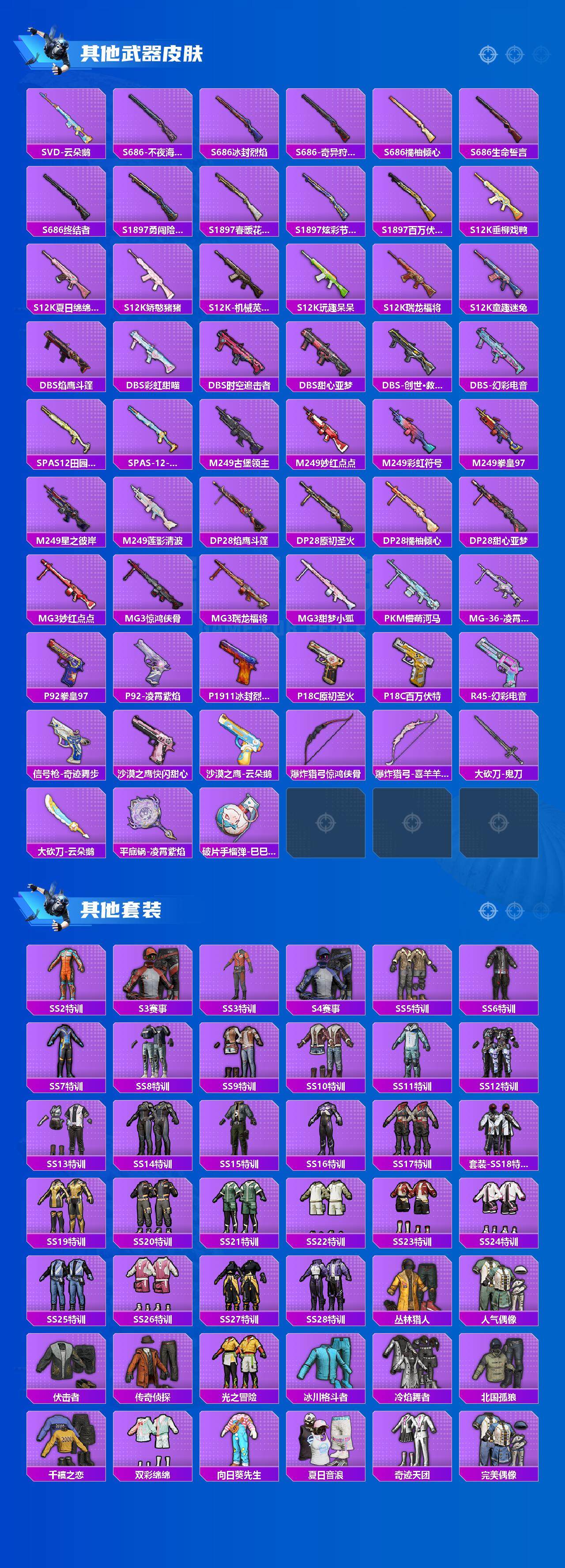 - [11822996]1粉装 4特效枪 可二次 可修改实名 优质装备:MG3洛神天依,M762甜蜜誓约,M416心之恋语,M249彩虹甜喵(M249-彩虹甜喵) 热门装扮:呆萌星弥,鹰眼刺客 五级特效枪:五级M416-心之恋语 四级特效枪:四级M762-甜蜜誓约,四级MG3-洛神天依 一级特效枪:一级M249-彩虹甜喵 紫色装扮:SS22特训,冰川特警,银白舞王,SS13特训,治愈之星,科技之星,SS14特训,萌趣颜团子,SS19特训,SS17特训,长空猛禽,耀眼新星,蓝色守护者,飞行日记,魅力单车,黄色运动,龟仙人,战地督导,白色伏地魔,牛气冲天,牛气满满,特战装甲,特殊使命,特训学院,镭射皇者,冰公主,竞技名士,神气柴柴,懵萌河马,SS24特训(SS24特训套装),SS25特训,丝绸行者,青龙圣者,朱雀圣者,白虎圣者,原初圣火,初火先锋,逆风勇士,SS12特训,纯白誓言,暗夜契约,萌黄之夏 优质战备:天星战神降落伞,甜蜜誓约降落伞,四圣焕新降落伞