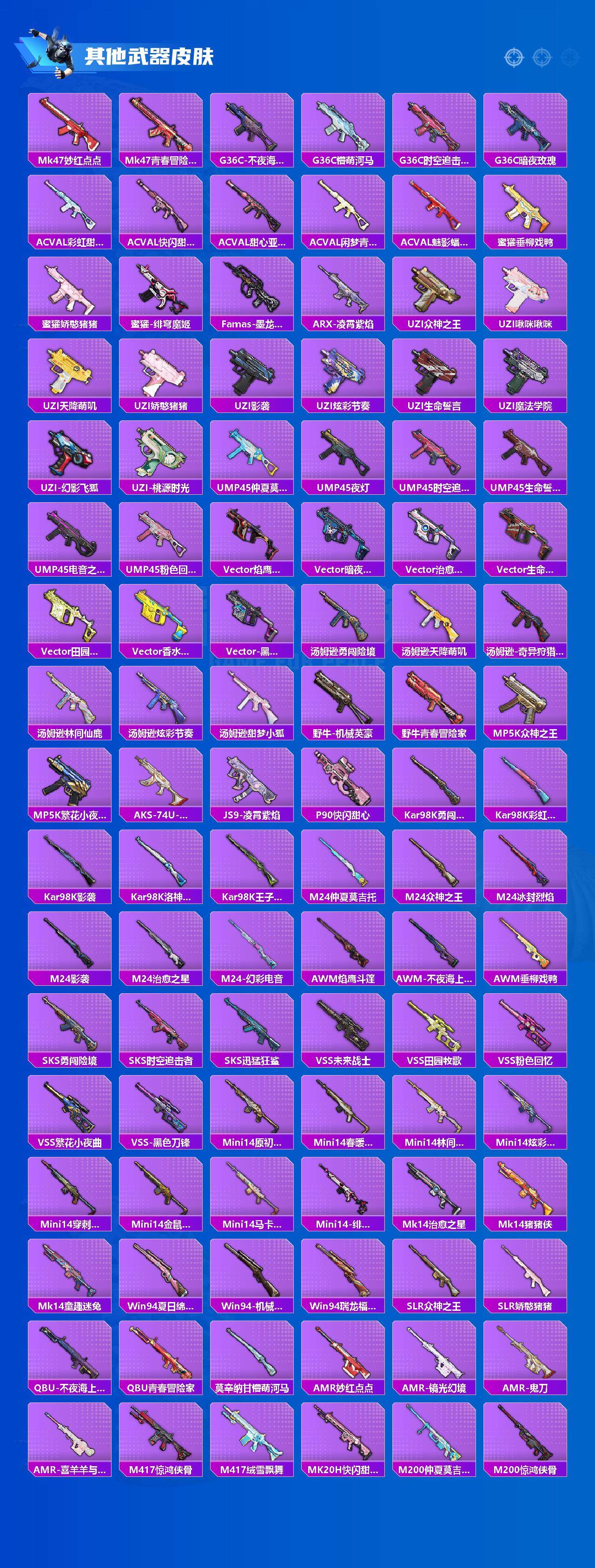 【粉色枪皮】:AKM-甜心宝贝,M16A4-垂柳戏鸭,SCAR-L-童趣迷兔,SCAR-L-机甲封神,M416-心之恋语,GROZA-巴啦啦小魔仙,AUG-甜心首席,M762-鬼刀,Vector-灵感创作师,P90-电糖天使,Kar98K-巳巳如意,Mk14-精灵梦叶罗丽,AMR-鸢尾晶梦,M200-梦海之灵,SPAS-1