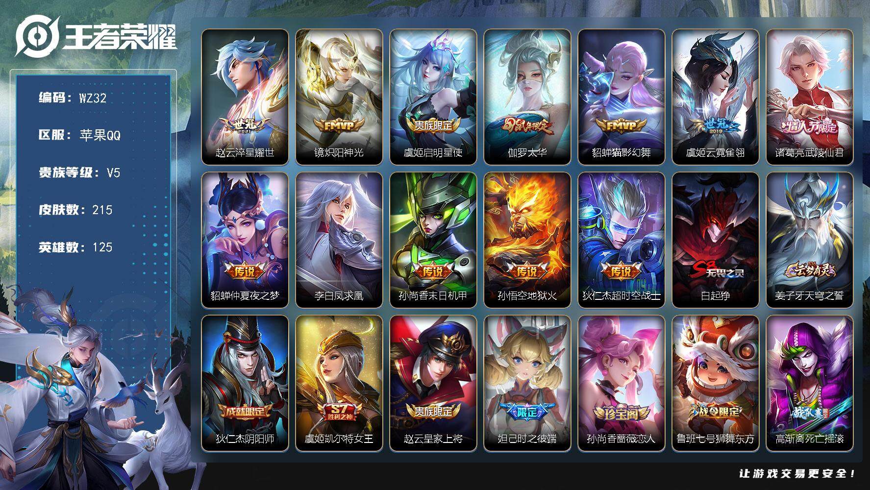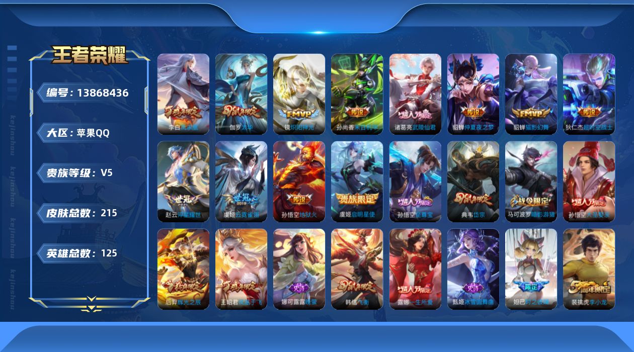 [13868436]苹果Q-V5-215皮肤-12传说-52史诗 【英雄全皮】:空空儿全皮 【传说皮肤】:赵云淬星耀世,镜炽阳神光,虞姬启明星使,伽罗太华,貂蝉猫影幻舞,虞姬云霓雀翎,诸葛亮武陵仙君,貂蝉仲夏夜之梦,李白凤求凰,孙尚香末日机甲,孙悟空地狱火,狄仁杰超时空战士 【限定皮肤】:白起狰,姜子牙天穹之誓,狄仁杰阴阳师,虞姬凯尔特女王,赵云皇家上将,妲己时之彼端,孙尚香蔷薇恋人,鲁班七号狮舞东方,高渐离死亡摇滚,孙膑妖精王,扁鹊炼金王,白起夜都怪侠,芈月重明,周瑜赤莲之焰,夏侯惇朔风刀,甄姬游园惊梦,曹操烛龙,典韦穷奇,典韦岱宗,马可波罗暗影游猎,狄仁杰魔术师,狄仁杰万华元夜,达摩沙漠行僧,项羽海滩派对,老夫子醍醐杖,程咬金演武夺筹,露娜一生所爱,韩信飞衡,王昭君凤凰于飞,兰陵王驯魔猎人,兰陵王金庭之子,孙悟空至尊宝,孙悟空大圣娶亲,牛魔御旌,后羿辉光之辰,李元芳银河之约,李元芳云中旅人,虞姬启明星使,钟馗神迹守卫,钟馗驱傩正仪,女娲朔望之晖,雅典娜单词大作战,太乙真人饕餮,太乙真人华丽摇滚,鬼谷子原初探秘者,鬼谷子五谷丰年,诸葛亮武陵仙君,弈星混沌棋,沈梦溪星空之诺,沈梦溪大漠名商,明世隐疑决卦,裴擒虎李小龙,裴擒虎擒涛扼浪,狂铁御狮,米莱狄御霄,云中君纤云弄巧,伽罗太华,盾山御銮,猪八戒西部大镖客,上官婉儿梁祝,蒙犽狂想玩偶喵,张良古海寻踪,高渐离燃音魔法,妲己灵卜魔法,鬼谷子天穹祈灯,刘邦剑破天穹,镜青焰无极,项羽苍威无极,周瑜熔金海岸 【年限皮肤】:王昭君凤凰于飞,李白凤求凰,后羿辉光之辰,伽罗太华,韩信飞衡,典韦岱宗 【赛季限定】:孙膑妖精王,扁鹊炼金王,白起狰,芈月重明,夏侯惇朔风刀,曹操烛龙,典韦穷奇,狄仁杰万华元夜,达摩沙漠行僧,老夫子醍醐杖,程咬金演武夺筹,兰陵王金庭之子,张良古海寻踪,牛魔御旌,李元芳云中旅人,虞姬凯尔特女王,钟馗驱傩正仪,太乙真人饕餮,鬼谷子原初探秘者,弈星混沌棋,沈梦溪大漠名商,明世隐疑决卦,裴擒虎擒涛扼浪,狂铁御狮,米莱狄御霄,盾山御銮,鬼谷子天穹祈灯,刘邦剑破天穹,姜子牙天穹之誓 【战令限定】:鲁班七号狮舞东方,白起夜都怪侠,周瑜赤莲之焰,马可波罗暗影游猎,兰陵王驯魔猎人,李元芳银河之约,钟馗神迹守卫,女娲朔望之晖,雅典娜单词大作战,沈梦溪星空之诺,猪八戒西部大镖客,蒙犽狂想玩偶喵,高渐离燃音魔法,妲己灵卜魔法,镜青焰无极,项羽苍威无