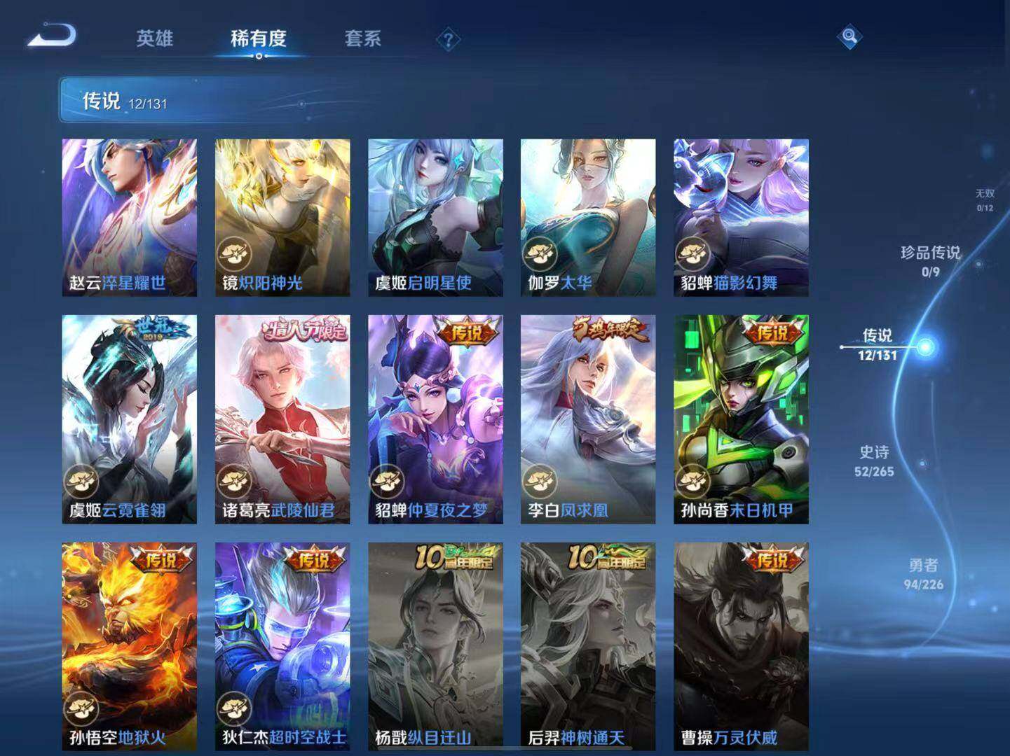 【传说皮肤】:赵云淬星耀世,镜炽阳神光,虞姬启明星使,伽罗太华,貂蝉猫影幻舞,虞姬云霓雀翎,诸葛亮武陵仙君,貂蝉仲夏夜之梦,李白凤求凰,孙尚香末日机甲,孙悟空地狱火,狄仁杰超时空战士