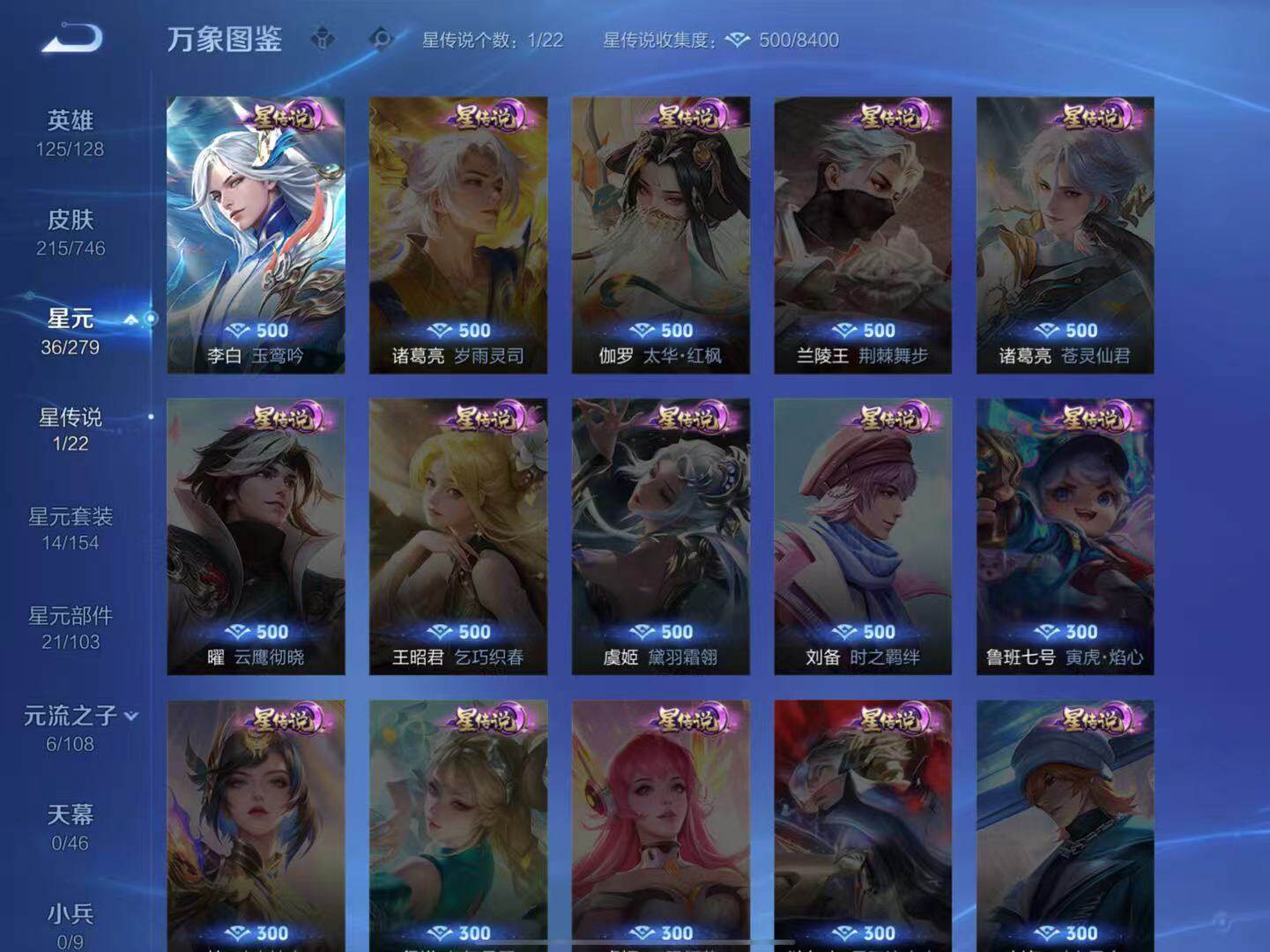 孙膑妖精王,扁鹊炼金王,虞姬凯尔特女王,白起狰,太乙真人饕餮,曹操烛龙,芈月重明,典韦穷奇,狂铁御狮,米莱狄御霄,牛魔御旌,盾山御銮,夏侯惇朔风刀,明世隐疑决卦,老夫子醍醐杖,鬼谷子原初探秘者,狄仁杰万华元夜,程咬金演武夺筹,钟馗驱傩正仪,女娲朔望之晖,钟馗神迹守卫,鲁班七号狮舞东方,沈梦溪星空之诺,李元芳银河之约,马可波罗暗影游猎,蒙犽狂想玩偶喵,弈星混沌棋,达摩沙漠行僧,兰陵王金庭之子,沈梦溪大漠名商,李元芳云中旅人,裴擒虎擒涛扼浪,张良古海寻踪,项羽苍威无极,镜青焰无极