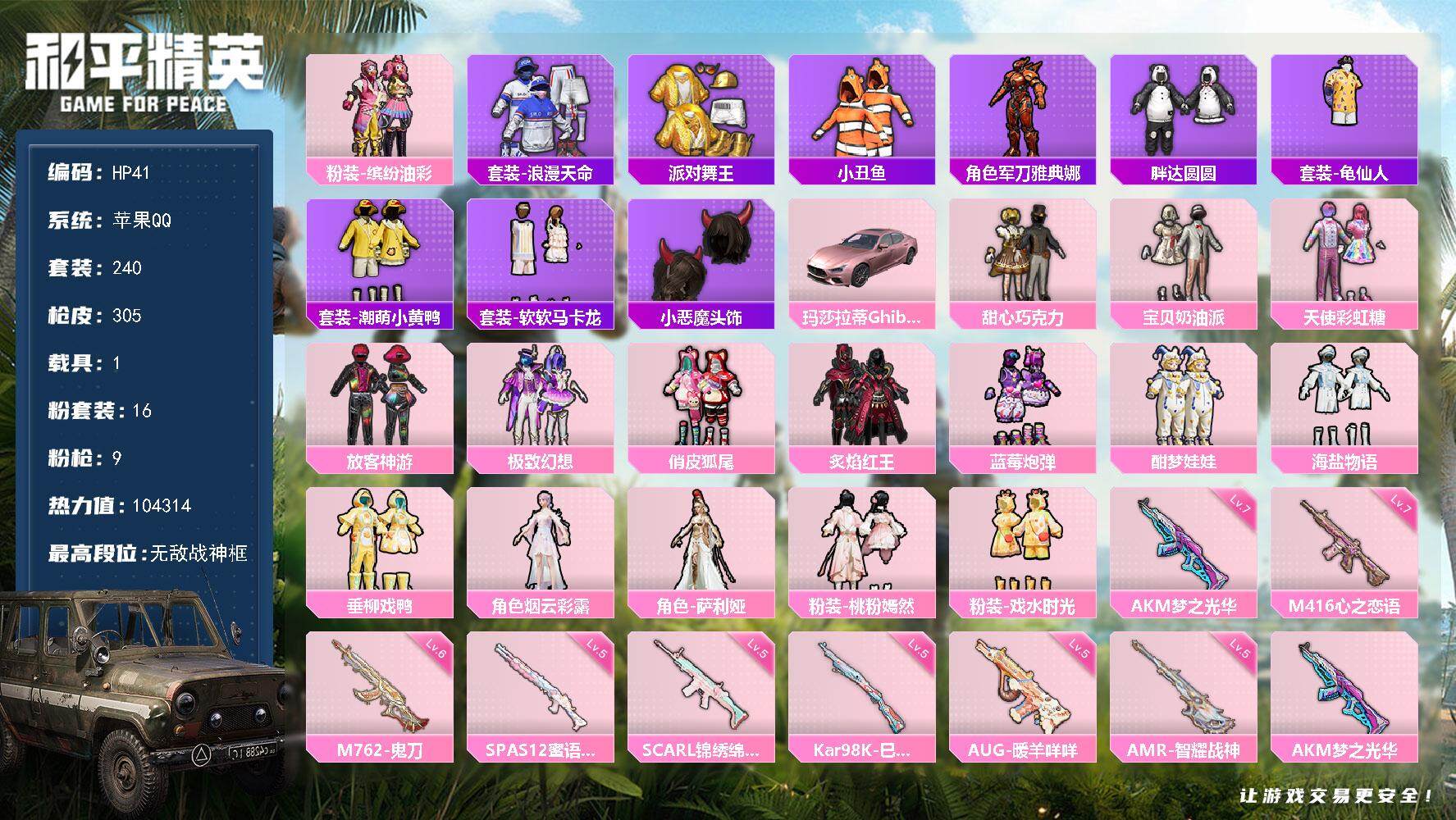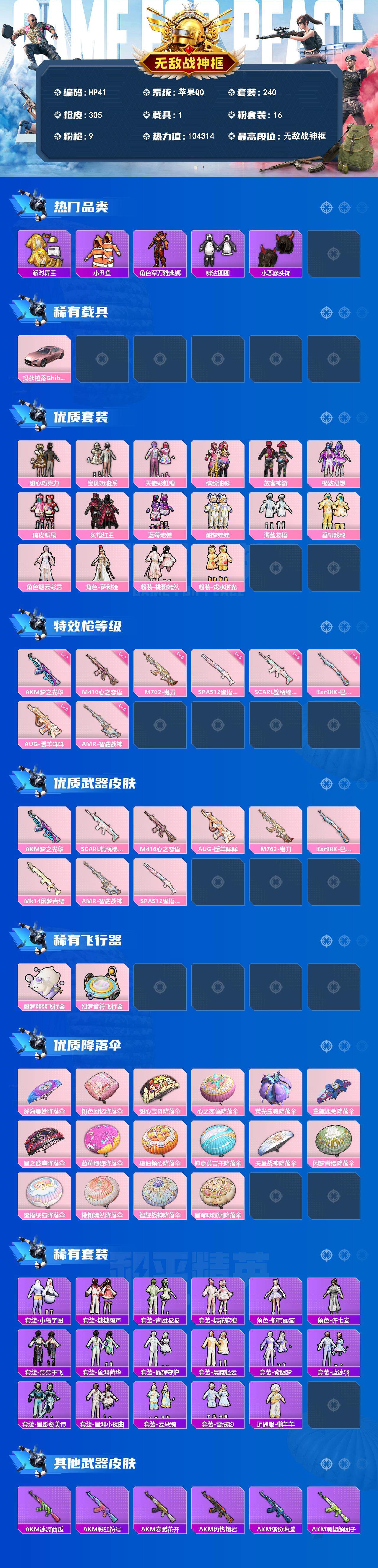 [13868484]苹果 手Q-无敌战神框-16粉装-9特效枪-1载具-2粉色飞行器-104314热力值-21王牌印记-240套装-305枪皮