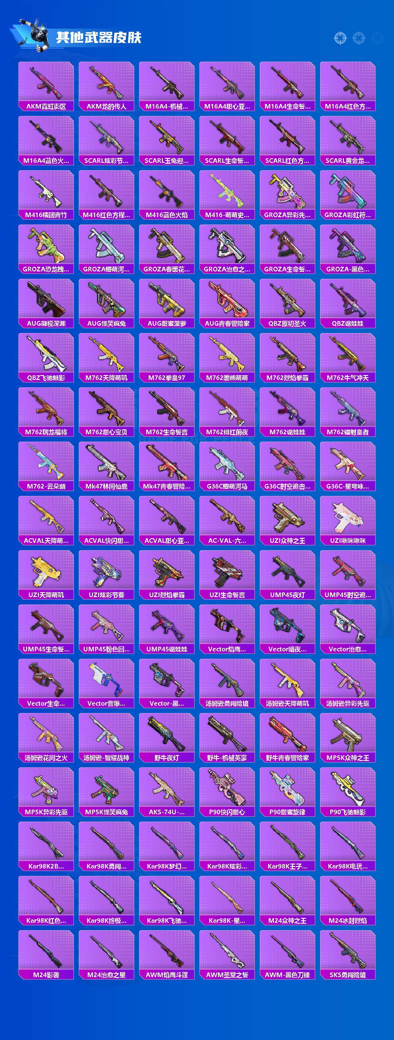 AKM-梦之光华,M416-心之恋语,AUG-暖羊咩咩,M762-鬼刀,Kar98K-巳巳如意,Mk14-闲梦青缨,SPAS-12-蜜语绒猫