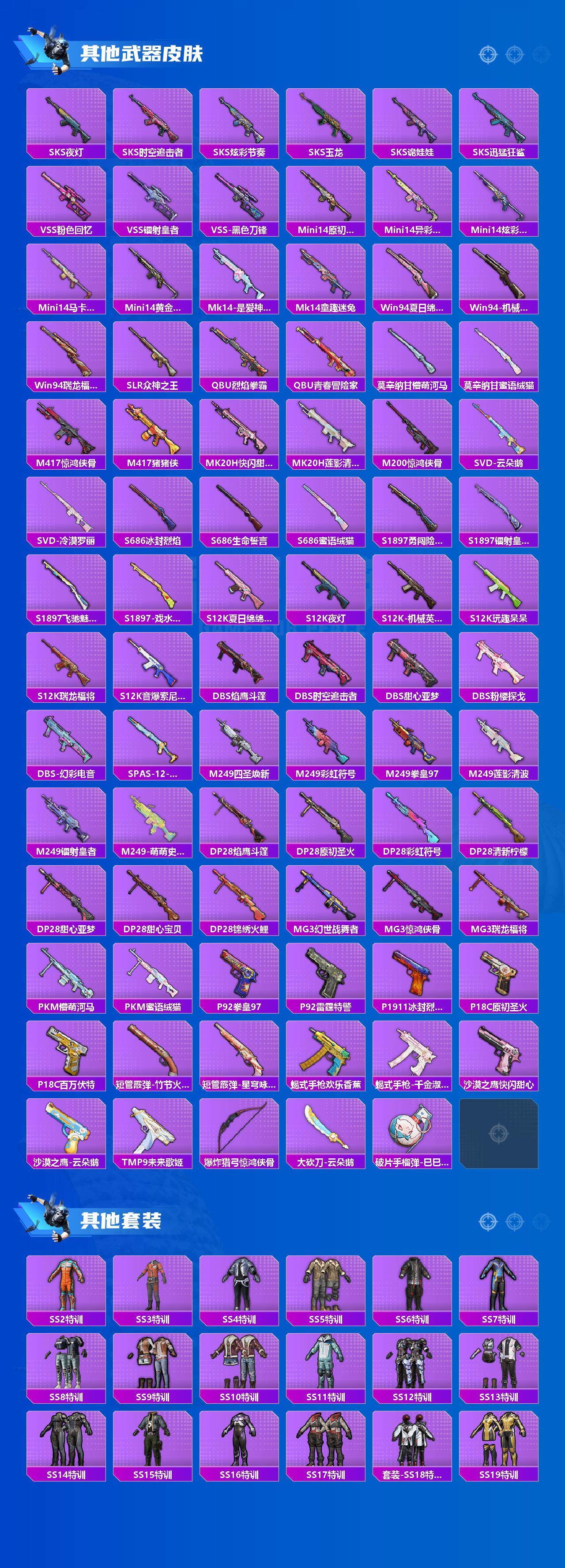 - [12042581]素材身法号/无敌战神框2/绝世印记1【特价急出/详情看图】:安卓 微信-无敌战神框-1神装-28粉装-12特效枪-3载具-6粉色飞行器-17.7w热力值-27王牌印记-396套装-454枪皮【红色神装等级】:圣域龙灵-瑞拉(三级)【热门品类】:粉装-雪国幻梦,粉装-梦幻火箭,绝对防御上衣,套装-浪漫天命,套装-小丑鱼,套装-胖达圆圆,套装-金羽特工,套装-AG战队服,套装-SS1特训,套装-龟仙人,套装-潮萌小黄鸭,套装-暗影哥特,套装-浪漫波比,套装-粉红小猪,套装-萌熊伴侣,角色-六号稻草人,小丑红鼻头,小恶魔头饰,熔岩游骑兵面罩,熔岩游骑兵连帽夹克【粉色载具】:阿斯顿马丁DBS(绿),双人摩托-梦幻火箭,星梦玉骢【粉色套装】:粉装-深海曼妙,粉装-甜心巧克力,粉装-宝贝奶油派,粉装-天使彩虹糖,粉装-雪国幻梦,粉装-蝶舞迷情,粉装-梦幻火箭,粉装-华贵君王,粉装-狩月元帅,粉装-极致幻想,粉装-幻彩马卡龙,粉装-锦绣火鲤,粉装-俏皮狐尾,粉装-冰霜白皇,粉装-暗翼战神,粉装-王牌四分卫,粉装-蜜桃特工,粉装-山涧鹿灵,角色-洛天依,粉装-冰川粉黛,粉装-冰川幽秘,粉装-冰川红玫,粉装-第五大道,粉装-仲夏莫吉托,角色-电波星,角色-守护天翼,角色-初号机 觉醒Ver.,角色-羊梦糖心【粉色枪皮等级】:AKM-炫紫旋律(七级),M416-心之恋语(七级),M762-青锋波束(五级),UZI-绮梦青鸾(七级),UMP45-雪国精灵(七级),Kar98K-巳巳如意(五级),Kar98K-圣域龙灵(三级),Mk14-甜梦熊击(五级),M417-第五大道(七级),MK12-雪月幻音(七级),DP-28-豹影疾电(五级),MG-36-沧焰双生(五级)【粉色飞行器】:深海曼妙飞行器,梦幻火箭飞行器,心之恋语飞行翼,齐天大圣飞行器,星夜魔法师飞行翼,圣域金龙飞行器