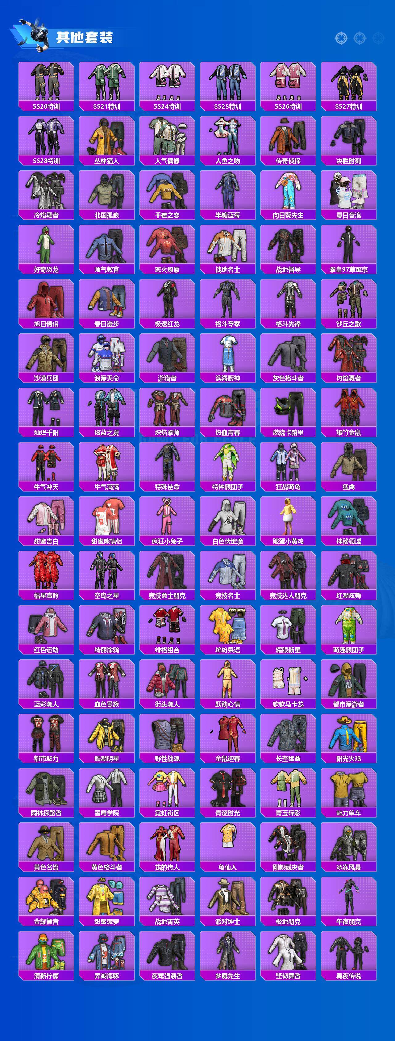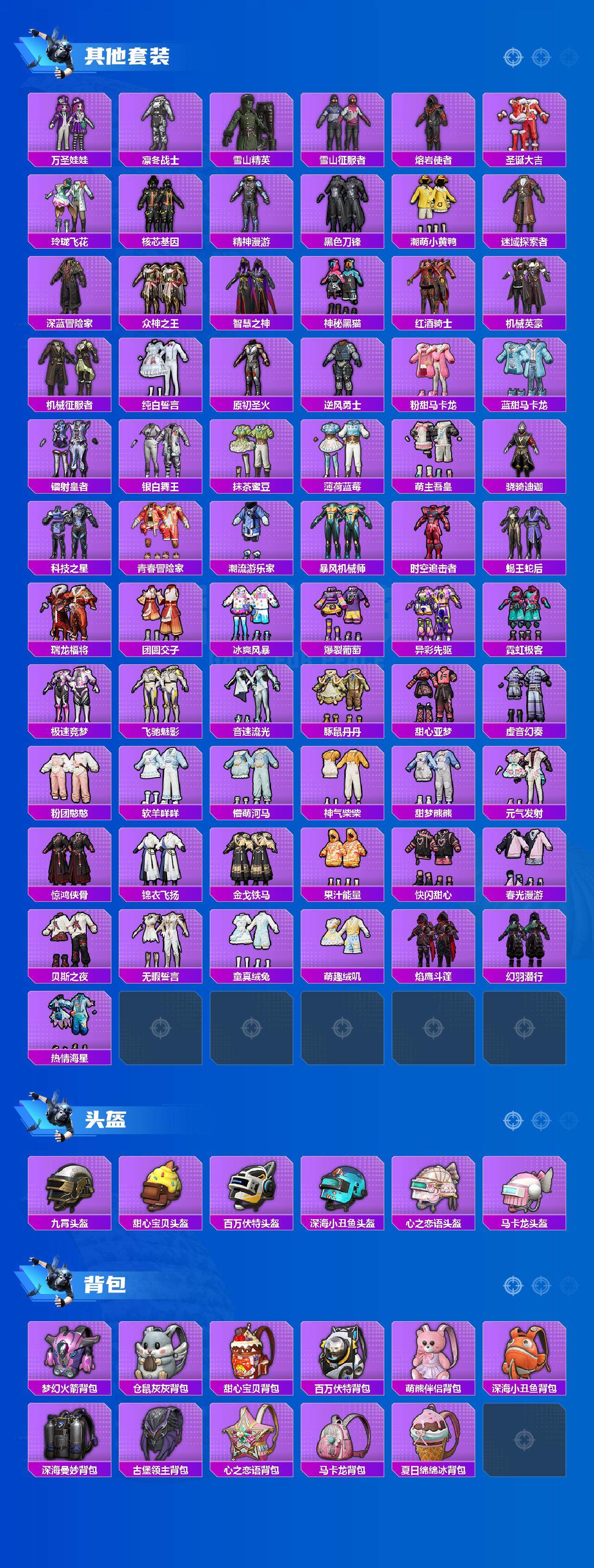 套装-浪漫天命,角色-军刀雅典娜,套装-龟仙人,套装-极速红龙,套装-破蛋小黄鸡,套装-弄潮海豚,套装-雪山精英,套装-黑色刀锋,套装-机械英豪,套装-纯白誓言,粉甜马卡龙套装,套装-蓝甜马卡龙,抹茶蜜豆套装,薄荷蓝莓套装,套装-瑞龙福将,套装-团圆交子,套装-豚鼠丹丹