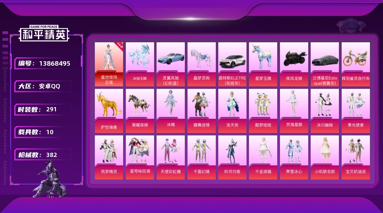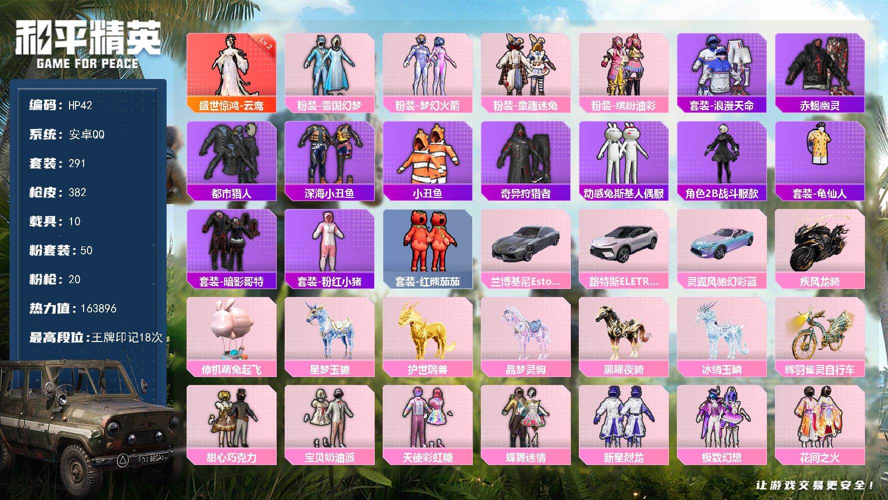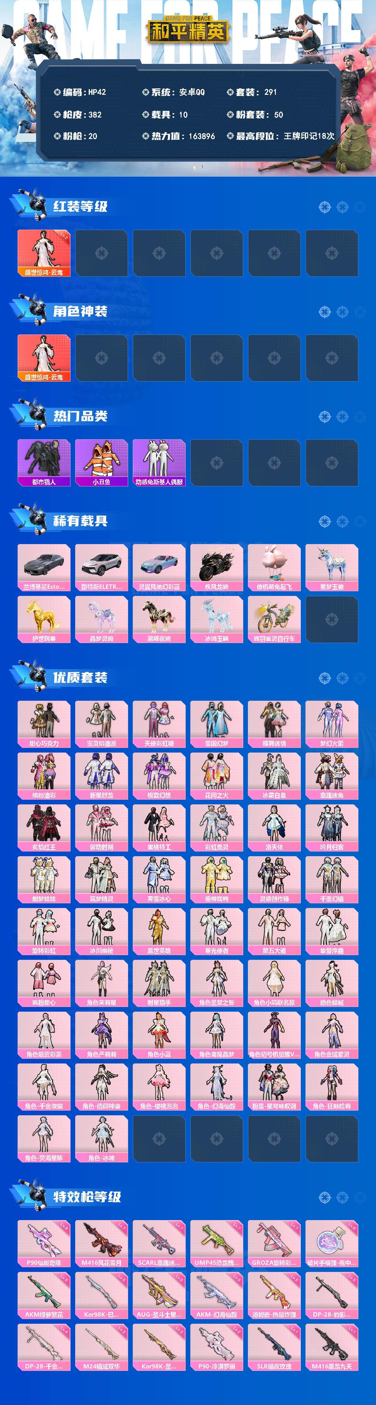 [13868495]安卓 手Q-1神装-50粉装-20特效枪-10载具-28粉色飞行器-163896热力值-18王牌印记-291套装-382枪皮