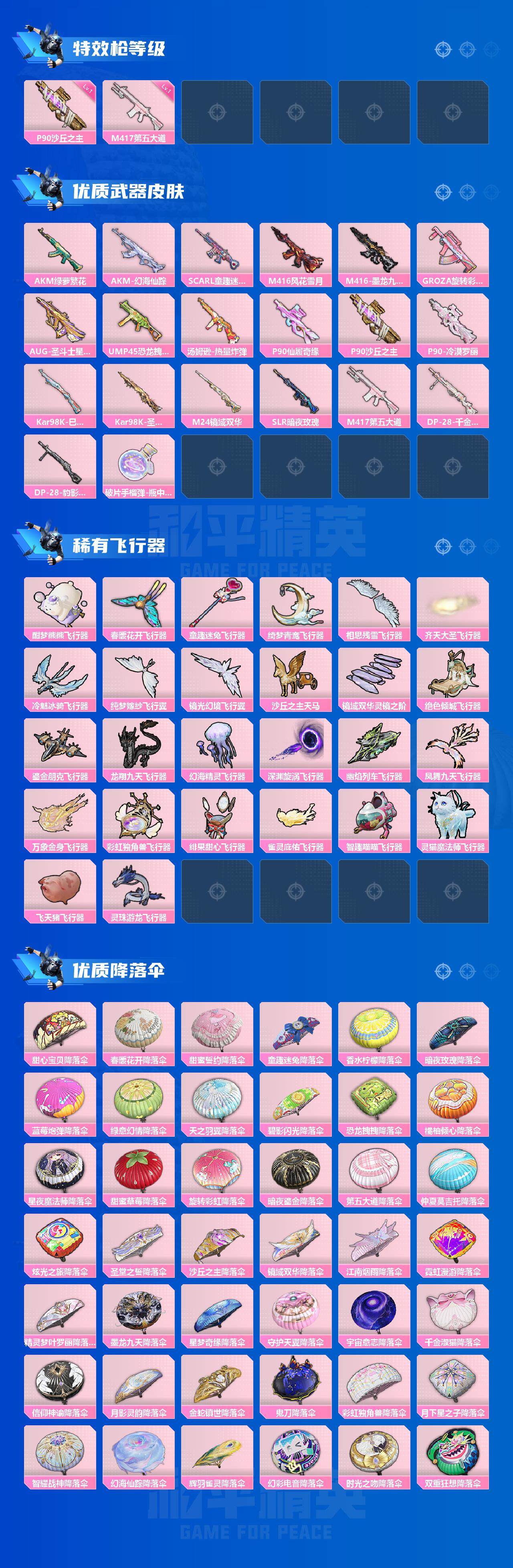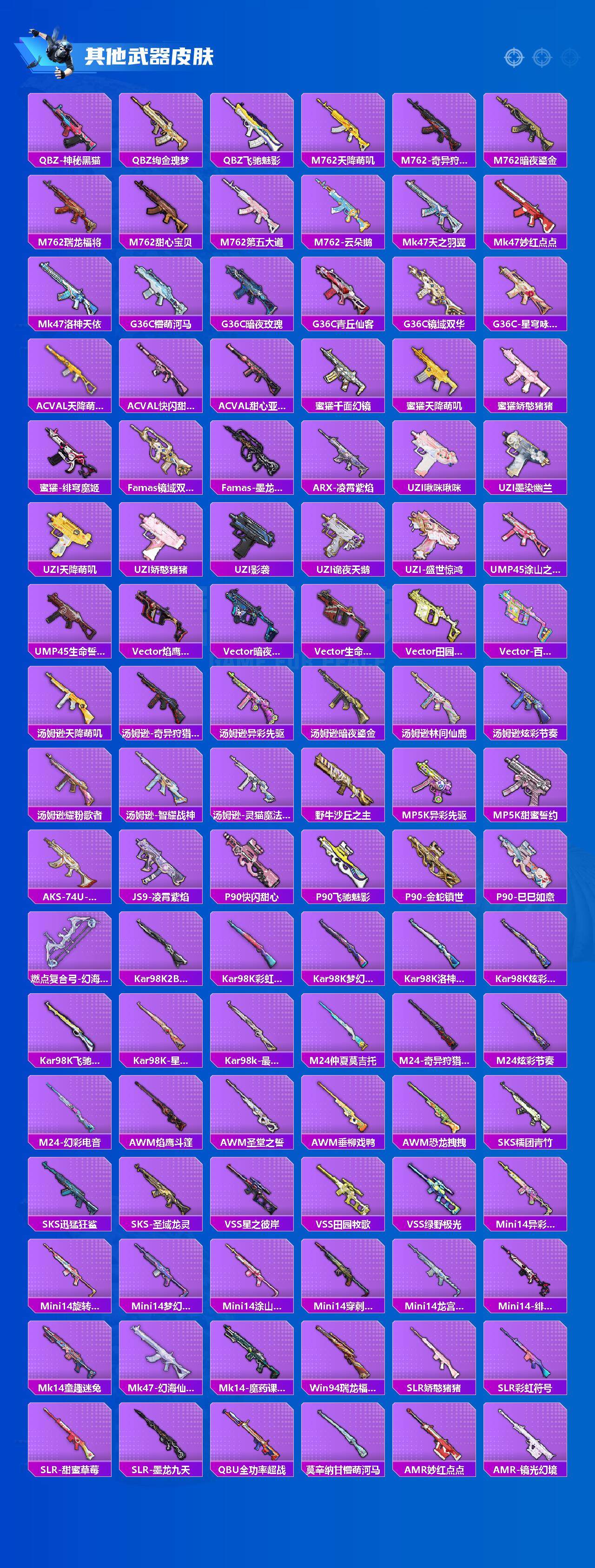 AKM-绿萝繁花,SCAR-L-童趣迷兔,M416-风花雪月,M416-墨龙九天,GROZA-旋转彩虹,UMP45-恐龙拽拽,P90-仙履奇缘,P90-沙丘之主,Kar98K-巳巳如意,Kar98K-圣域龙灵,M24-镜域双华,SLR-暗夜玫瑰,M417-第五大道,DP-28-千金淑猫
