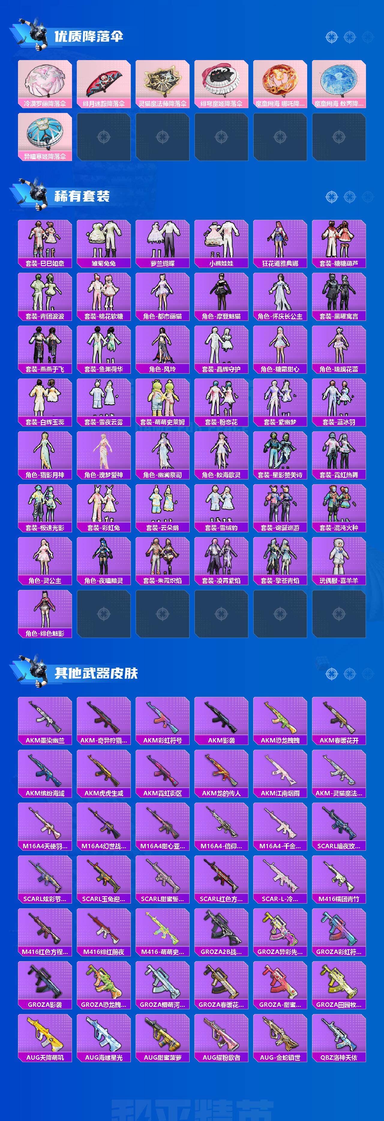 - PX_2088652- 可二次 安卓手Q-2王牌印记-3粉装-4特效枪-0载具-26547热力值-61套装-90枪皮-1卓越印记-1传奇印记, 【3粉装】,幻彩电音,星穹咏叹调,守护天翼, 【4特效枪】,GROZA-镜光银凌-5级,Kar98K-创世·救赎-4级,Kar98K-巳巳如意-5级,Mk14-甜梦熊击-5级, 【3稀有紫装】,Mark.06,暗影哥特,浪漫天命, 【61稀有时装】,蓝冰羽