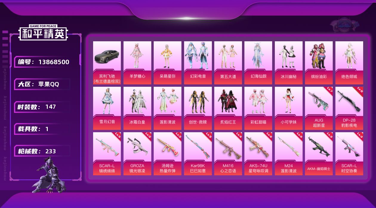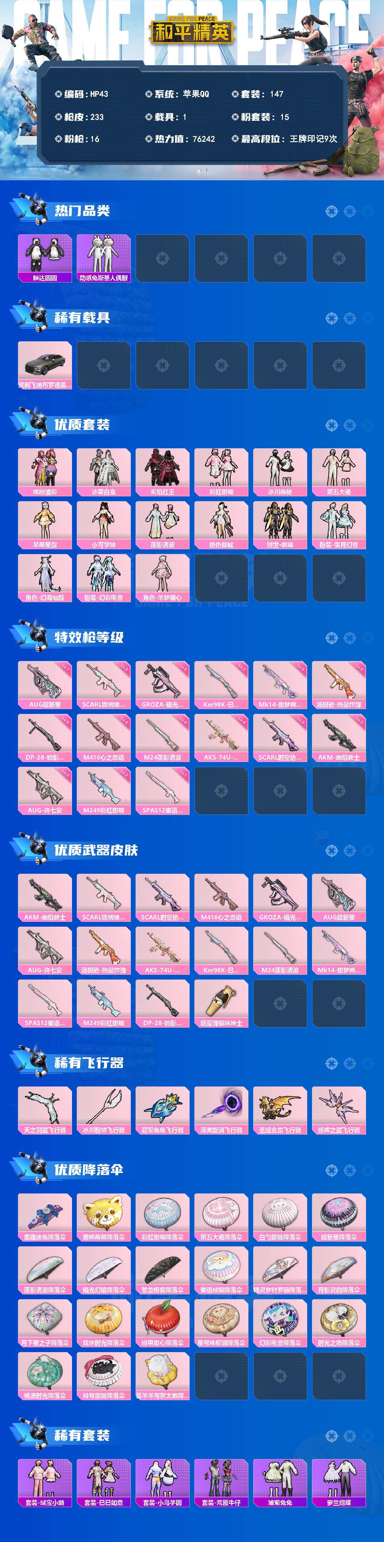 [13868500]苹果 手Q-15粉装-16特效枪-1载具-7粉色飞行器-76242热力值-9王牌印记-147套装-233枪皮 【热门品类】:粉装-缤纷油彩,套装-赤蝎幽灵,套装-胖达圆圆,套装-动感兔斯基人偶服,套装-龟仙人,套装-红熊茄茄 【粉色载具】:宾利飞驰(布罗德盖棕双色) 【粉色套装】:粉装-缤纷油彩,粉装-冰霜白皇,粉装-炙焰红王,粉装-彩虹甜喵,粉装-冰川幽秘,粉装-第五大道,角色-呆萌星弥,角色-小可学妹,粉装-莲影清波,角色-绝色倾城,套装-创世·救赎,粉装-雪月幻音,角色-幻海仙踪,粉装-幻彩电音,角色-羊梦糖心 【粉色枪皮等级】:AKM-幽焰骑士(三级),SCAR-L-锦绣绵绵(五级),SCAR-L-时空协奏(三级),M416-心之恋语(四级),GROZA-镜光银凌(五级),AUG-超新星(七级),AUG-许七安(三级),汤姆逊-热量炸弹(五级),AKS-74U-星穹咏叹调(四级),Kar98K-巳巳如意(五级),M24-莲影清波(四级),Mk14-甜梦熊击(五级),SPAS-12-蜜语绒猫(一级),M249-彩虹甜喵(二级),DP-28-豹影疾电(五级) 【粉色枪皮】:AKM-幽焰骑士,SCAR-L-锦绣绵绵,SCAR-L-时空协奏,M416-心之恋语,GROZA-镜光银凌,AUG-超新星,AUG-许七安,汤姆逊-热量炸弹,AKS-74U-星穹咏叹调,Kar98K-巳巳如意,M24-莲影清波,Mk14-甜梦熊击,SPAS-12-蜜语绒猫,M249-彩虹甜喵,DP-28-豹影疾电,烟雾弹-猫咪绅士 【粉色飞行器】:天之羽翼飞行器,冰川粉黛飞行器,冠军兔兔飞行器,深渊漩涡飞行器,圣域金龙飞行器,终晖之翼飞行器 【粉色降落伞】:童趣迷兔降落伞,暖熊萌萌降落伞,彩虹甜喵降落伞,第五大道降落伞,白勺歌姬降落伞,超新星降落伞,莲影清波降落伞,镜光幻境降落伞,繁龙极客降落伞,蜜语绒猫降落伞,精灵梦叶罗丽降落伞,月影灵韵降落伞,月下星之子降落伞,戏水时光降落伞,绯果甜心降落伞,星穹咏叹调降落伞,幻彩电音降落伞,时光之吻降落伞,桃源时光降落伞,绯穹魔姬降落伞,喜羊羊与灰太狼降落伞 【稀有套装】:套装-龟仙人,套装-绒宝小鹅,套装-巳巳如意,套装-小鸟芋圆,套装-荒原牛仔,套装-雏菊兔兔,套装-萝兰蝴蝶,套装-小熊娃娃,套装-火种守卫者,套装-糖糖葫芦,套装-青团波波,套装-