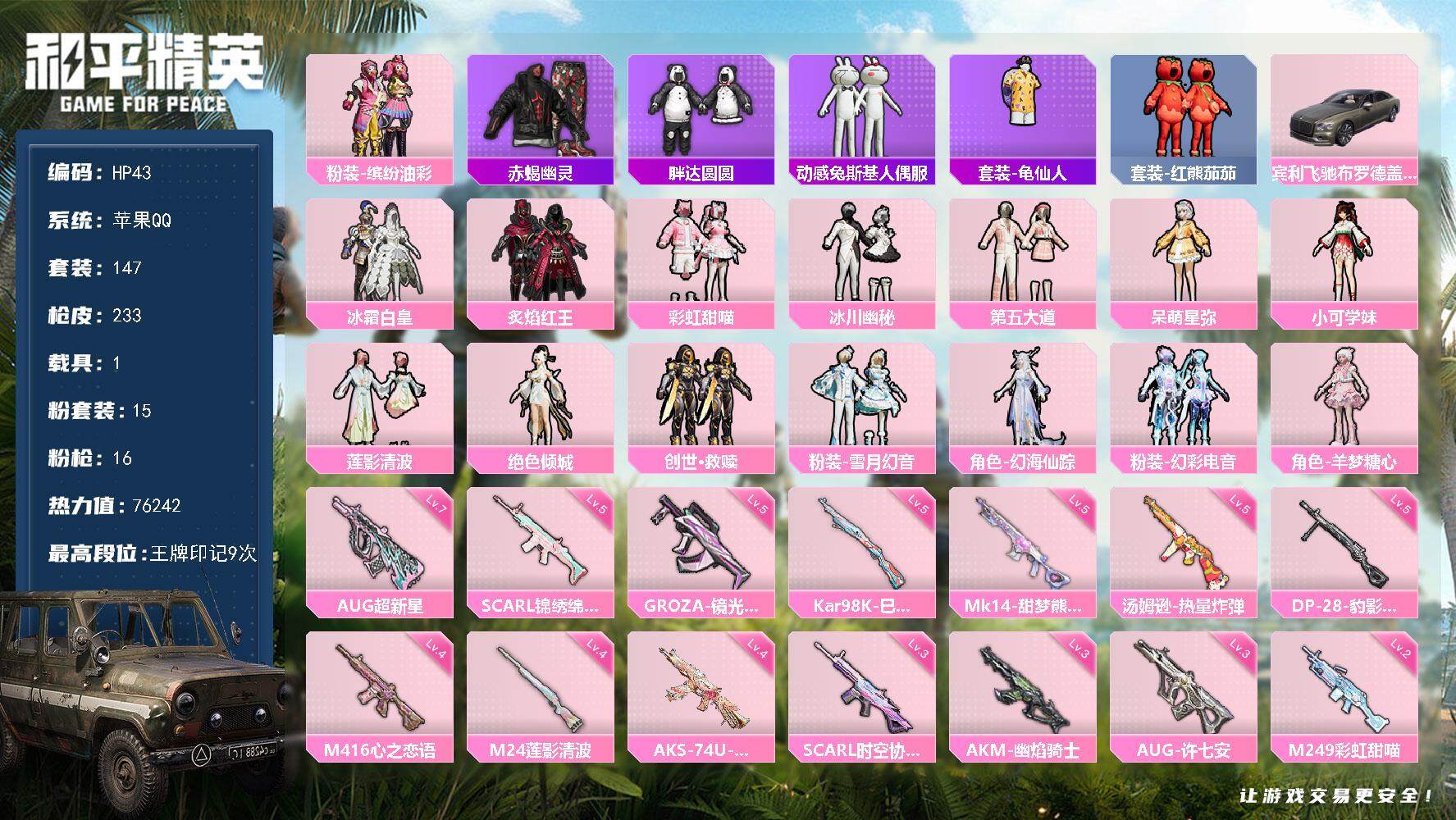 [13868500]苹果 手Q-15粉装-16特效枪-1载具-7粉色飞行器-76242热力值-9王牌印记-147套装-233枪皮