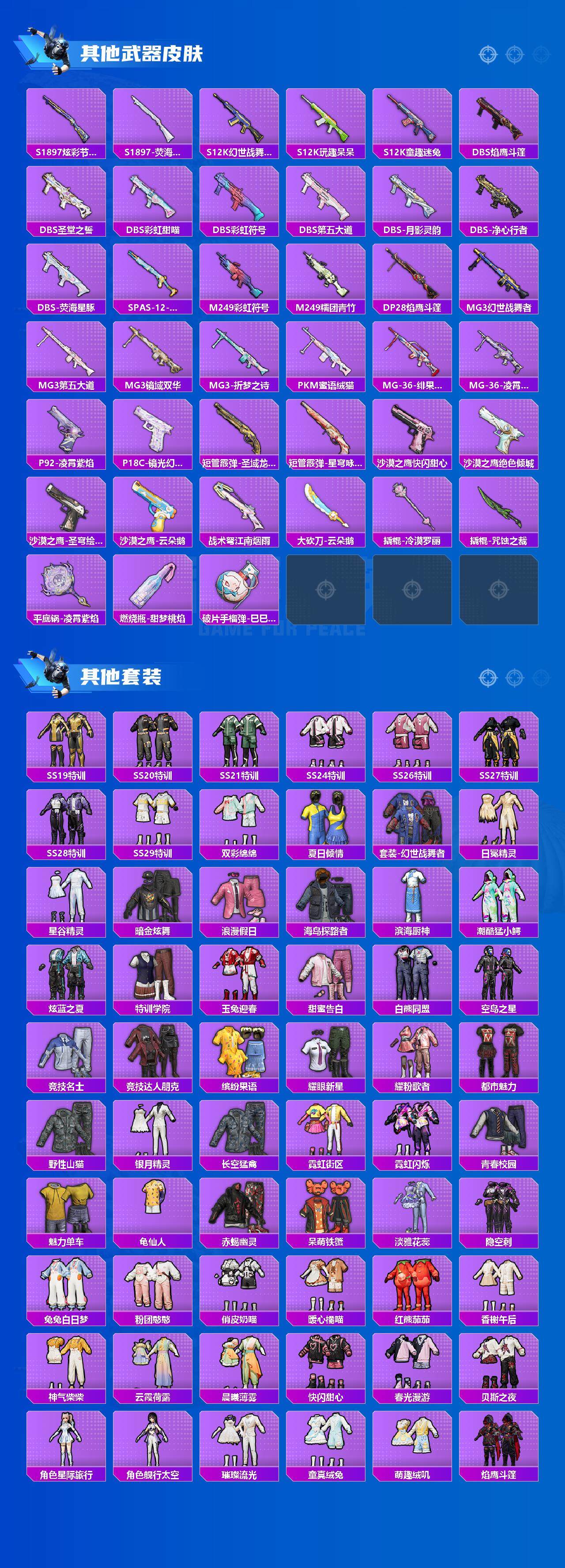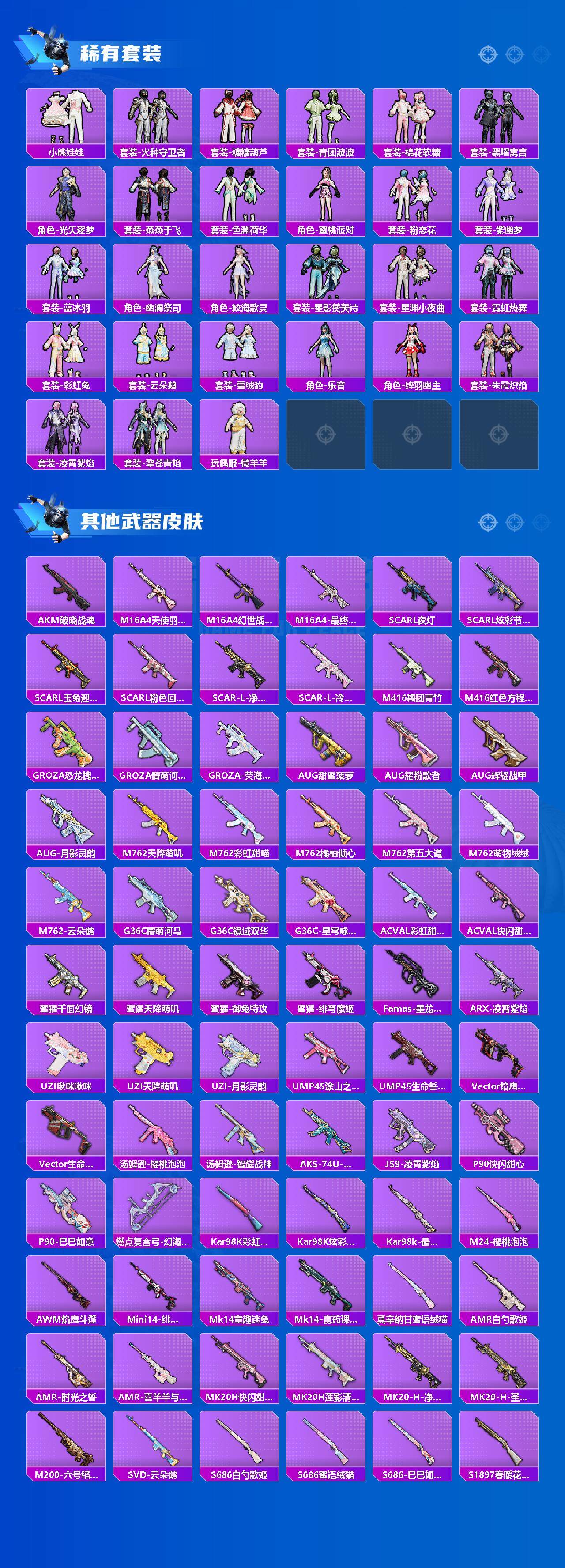 AKM-幽焰骑士,SCAR-L-时空协奏,M416-心之恋语,GROZA-镜光银凌,AUG-超新星,AUG-许七安,Kar98K-巳巳如意,M24-莲影清波,SPAS-12-蜜语绒猫,M249-彩虹甜喵,烟雾弹-猫咪绅士