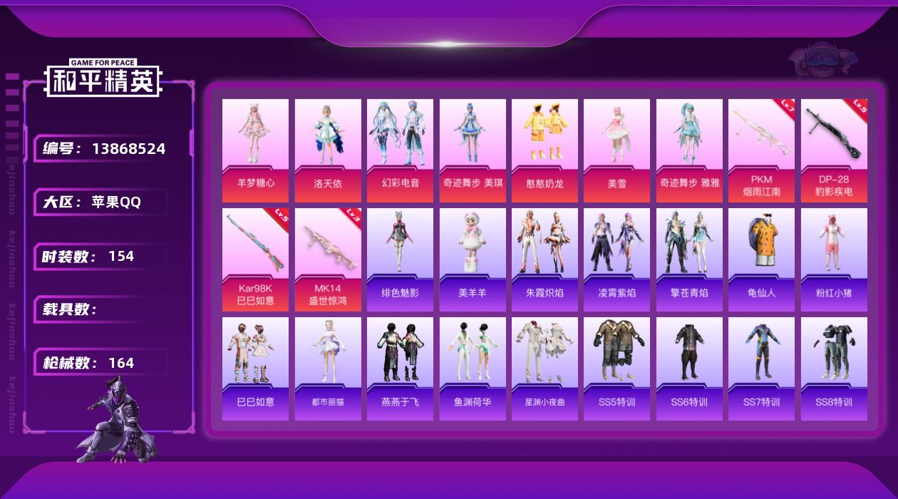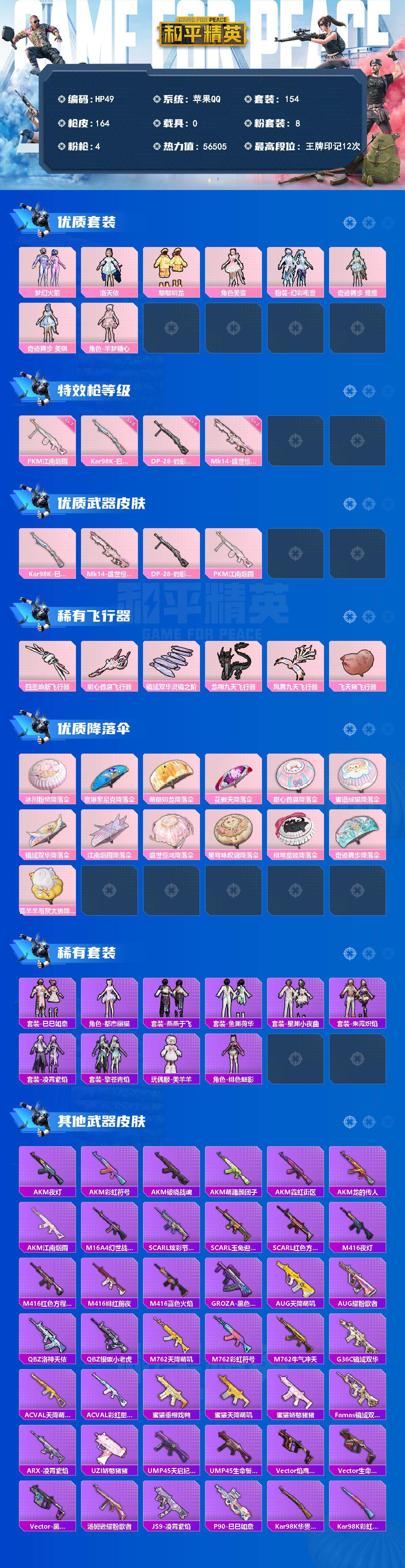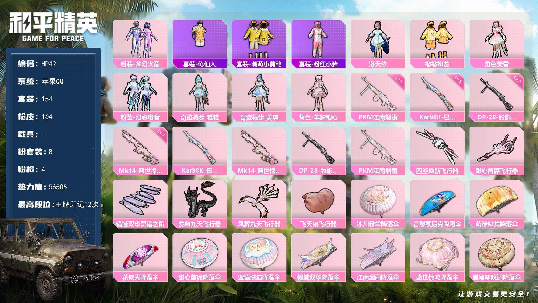 [13868524]苹果 手Q-8粉装-4特效枪-6粉色飞行器-56505热力值-12王牌印记-154套装-164枪皮 【热门品类】:粉装-梦幻火箭,套装-龟仙人,套装-潮萌小黄鸭,套装-粉红小猪 【粉色套装】:粉装-梦幻火箭,角色-洛天依,粉装-憨憨奶龙,角色-美雪,粉装-幻彩电音,角色-奇迹舞步 雅雅,角色-奇迹舞步 美琪,角色-羊梦糖心 【粉色枪皮等级】:Kar98K-巳巳如意(五级),Mk14-盛世惊鸿(三级),DP-28-豹影疾电(五级),PKM-江南烟雨(七级) 【粉色枪皮】:Kar98K-巳巳如意,Mk14-盛世惊鸿,DP-28-豹影疾电,PKM-江南烟雨 【粉色飞行器】:四圣焕新飞行器,甜心首席飞行器,镜域双华-灵镜之阶,龙翔九天飞行器,凤舞九天飞行器,飞天猪飞行器 【粉色降落伞】:冰川粉黛降落伞,音爆索尼克降落伞,萌酷奶龙降落伞,花傲天降落伞,甜心首席降落伞,蜜语绒猫降落伞,镜域双华降落伞,江南烟雨降落伞,盛世惊鸿降落伞,星穹咏叹调降落伞,绯穹魔姬降落伞,奇迹舞步降落伞,喜羊羊与灰太狼降落伞 【稀有套装】:套装-龟仙人,套装-巳巳如意,角色-都市丽猫,套装-燕燕于飞,套装-鱼渊荷华,套装-星渊小夜曲,套装-朱霞炽焰,套装-凌霄紫焰,套装-擎苍青焰,玩偶服-美羊羊,角色-绯色魅影 【稀有枪皮】:AKM-夜灯,AKM-彩虹符号,AKM-江南烟雨,AKM-破晓战魂,AKM-萌趣颜团子,AKM-霓虹街区,AKM-龙的传人,M16A4-幻世战舞者,SCAR-L-炫彩节奏,SCAR-L-玉兔迎春,SCAR-L-红色方程式,M416-夜灯,M416-红色方程式,M416-绯红前夜,M416-蓝色火焰,GROZA-黑色刀锋,AUG-天降萌叽,AUG-耀粉歌者,QBZ-洛神天依,QBZ-银碳小老虎,M762-天降萌叽,M762-彩虹符号,M762-牛气冲天,G36C-镜域双华,AC-VAL-天降萌叽,AC-VAL-彩虹甜喵,蜜獾-垂柳戏鸭,蜜獾-天降萌叽,蜜獾-娇憨猪猪,Famas-镜域双华,ARX-凌霄紫焰,UZI-娇憨猪猪,UMP45-天启纪元,UMP45-生命誓言,Vector-焰鹰斗篷,Vector-生命誓言,Vector-黑色刀锋,汤姆逊-耀粉歌者,JS9-凌霄紫焰,P90-巳巳如意,Kar98K-华贵君王,Kar98K-彩虹符号,Kar98K-梦幻火箭,Kar98K-洛神