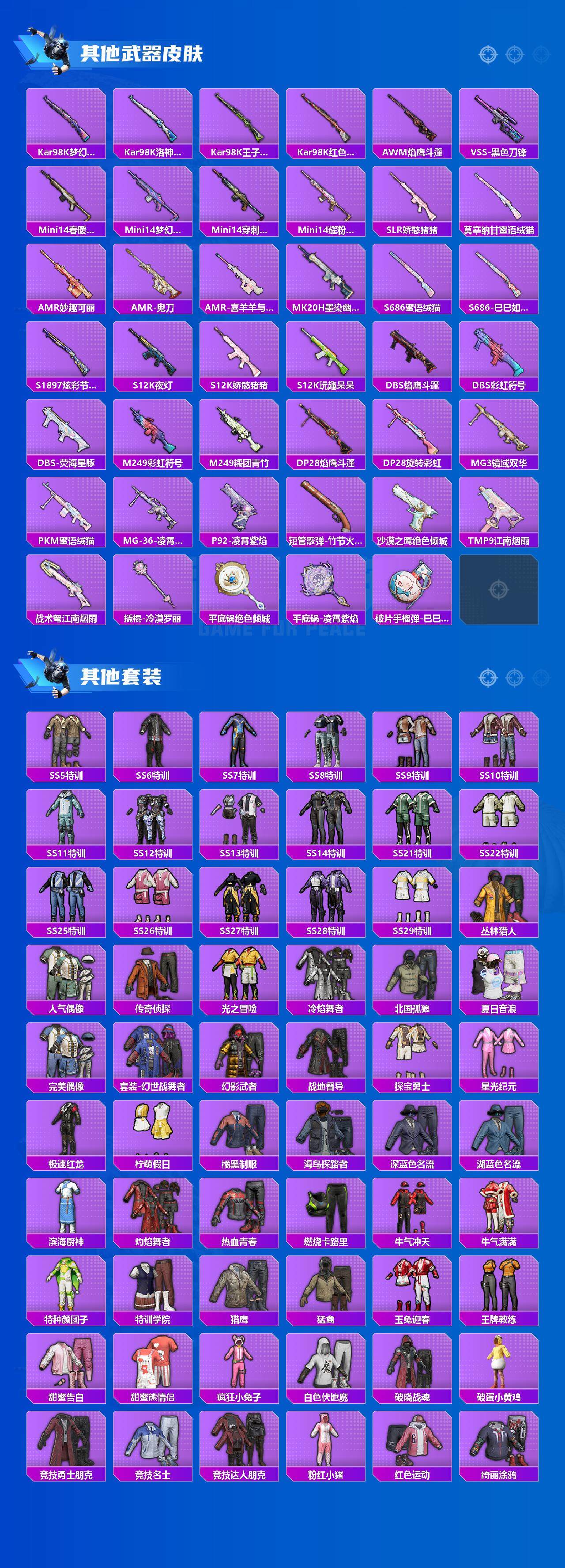 【稀有枪皮】:AKM-夜灯,AKM-彩虹符号,AKM-江南烟雨,AKM-破晓战魂,AKM-萌趣颜团子,AKM-霓虹街区,AKM-龙的传人,M16A4-幻世战舞者,SCAR-L-炫彩节奏,SCAR-L-玉兔迎春,SCAR-L-红色方程式,M416-夜灯,M416-红色方程式,M416-绯红前夜,M416-蓝色火焰,GROZA-黑色刀锋,AUG-天降萌叽,AUG-耀粉歌者,QBZ-洛神天依,QBZ-银碳小老虎,M762-天降萌叽,M762-彩虹符号,M762-牛气冲天,G36C-镜域双华,AC-VAL-天降萌叽,AC-VAL-彩虹甜喵,蜜獾-垂柳戏鸭,蜜獾-天降萌叽,蜜獾-娇憨猪猪,Famas-镜域双华,ARX-凌霄紫焰,UZI-娇憨猪猪,UMP45-天启纪元,UMP45-生命誓言,Vector-焰鹰斗篷,Vector-生命誓言,Vector-黑色刀锋,汤姆逊-耀粉歌者,JS9-凌霄紫焰,P90-巳巳如意,Kar98K-华贵君王,Kar98K-彩虹符号,Kar98K-梦幻火箭,Kar98K-洛神