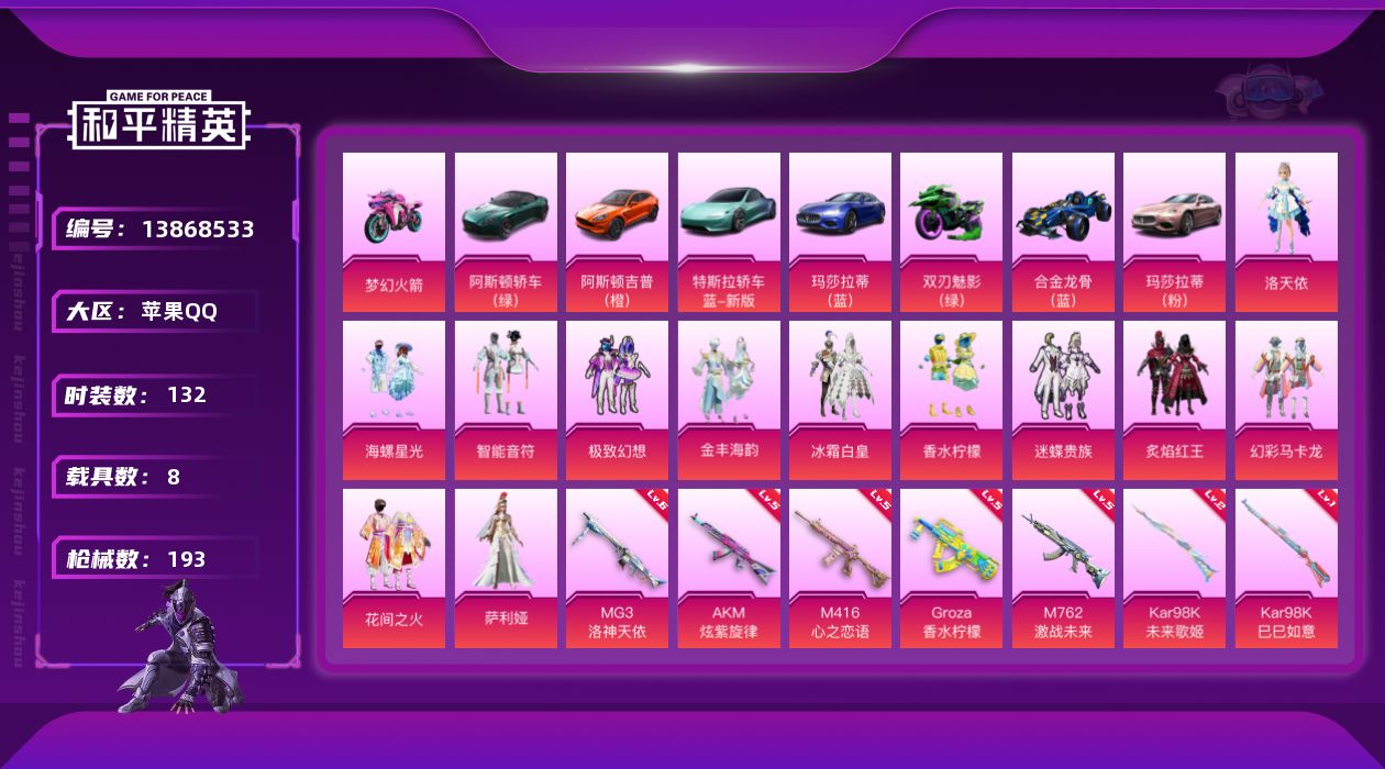 [13868533]苹果 手Q-13粉装-7特效枪-8载具-3粉色飞行器-70746热力值-3王牌印记-132套装-193枪皮