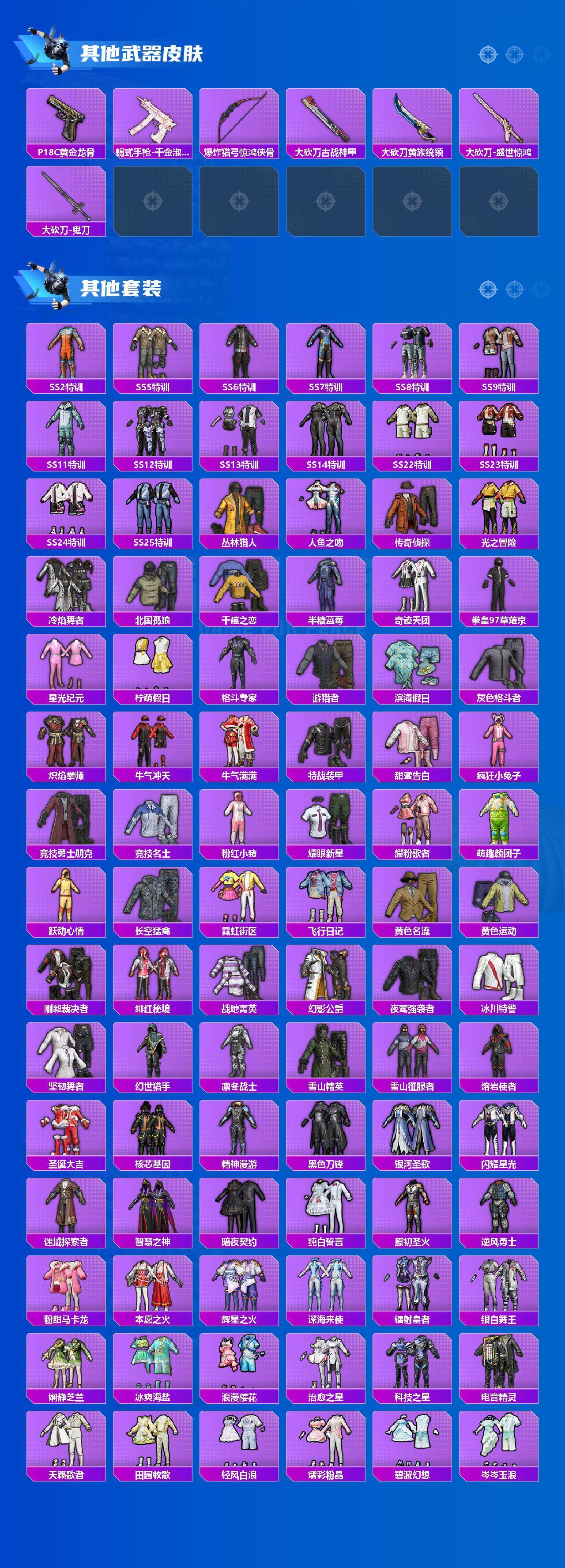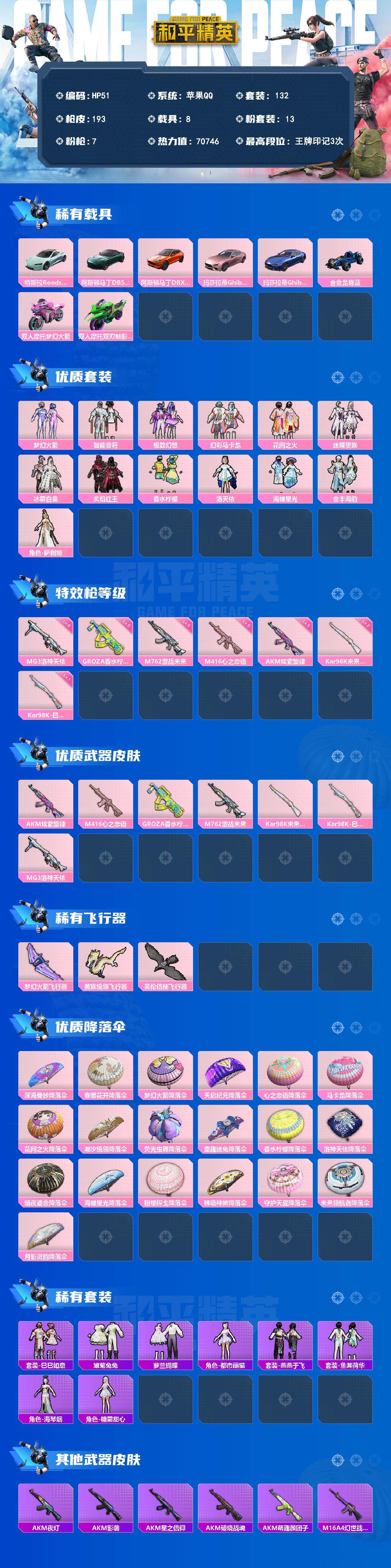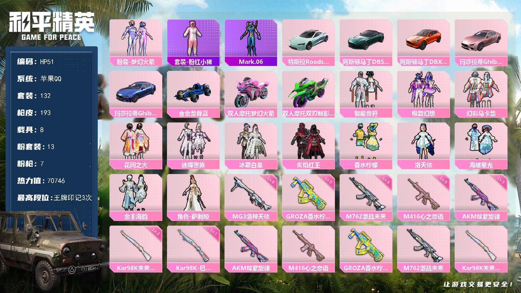 [13868533]苹果 手Q-13粉装-7特效枪-8载具-3粉色飞行器-70746热力值-3王牌印记-132套装-193枪皮 【热门品类】:粉装-梦幻火箭,套装-粉红小猪,角色-Mark.06 【粉色载具】:特斯拉Roadster(水滴蓝),阿斯顿马丁DBS(绿),阿斯顿马丁DBX(橙),玛莎拉蒂Ghibli(粉),玛莎拉蒂Ghibli(蓝),合金龙骨(蓝),双人摩托-梦幻火箭,双人摩托-双刃魅影(绿) 【粉色套装】:粉装-梦幻火箭,粉装-智能音符,粉装-极致幻想,粉装-幻彩马卡龙,粉装-花间之火,粉装-迷蝶贵族,粉装-冰霜白皇,粉装-炙焰红王,粉装-香水柠檬,角色-洛天依,粉装-海螺星光,粉装-金丰海韵,角色-萨利娅 【粉色枪皮等级】:AKM-炫紫旋律(五级),M416-心之恋语(五级),GROZA-香水柠檬(五级),M762-激战未来(五级),Kar98K-未来歌姬(二级),Kar98K-巳巳如意(一级),MG3-洛神天依(六级) 【粉色枪皮】:AKM-炫紫旋律,M416-心之恋语,GROZA-香水柠檬,M762-激战未来,Kar98K-未来歌姬,Kar98K-巳巳如意,MG3-洛神天依 【粉色飞行器】:梦幻火箭飞行器,黄族统领飞行器,英伦信使飞行器 【粉色降落伞】:深海曼妙降落伞,春暖花开降落伞,梦幻火箭降落伞,天启纪元降落伞,心之恋语降落伞,马卡龙降落伞,花间之火降落伞,潮汐统领降落伞,荧光虫舞降落伞,童趣迷兔降落伞,香水柠檬降落伞,洛神天依降落伞,暗夜鎏金降落伞,海螺星光降落伞,粉樱探戈降落伞,拂晓神骑降落伞,守护天翼降落伞,未来领航者降落伞,月影灵韵降落伞 【稀有套装】:套装-巳巳如意,套装-雏菊兔兔,套装-萝兰蝴蝶,角色-都市丽猫,套装-燕燕于飞,套装-鱼渊荷华,角色-海琴烟,角色-糖霜甜心 【稀有枪皮】:AKM-夜灯,AKM-影袭,AKM-星之信仰,AKM-破晓战魂,AKM-萌趣颜团子,M16A4-幻世战舞者,SCAR-L-炫彩节奏,SCAR-L-生命誓言,M416-仓鼠灰灰,M416-糯团青竹,M416-蓝色火焰,GROZA-影袭,GROZA-懵萌河马,GROZA-春暖花开,GROZA-治愈之星,GROZA-田园牧歌,GROZA-银河战甲,GROZA-黑色刀锋,AUG-凝视深渊,AUG-天降萌叽,AUG-海螺星光,QBZ-原初圣火,QBZ-未来歌姬,QBZ-洛神天