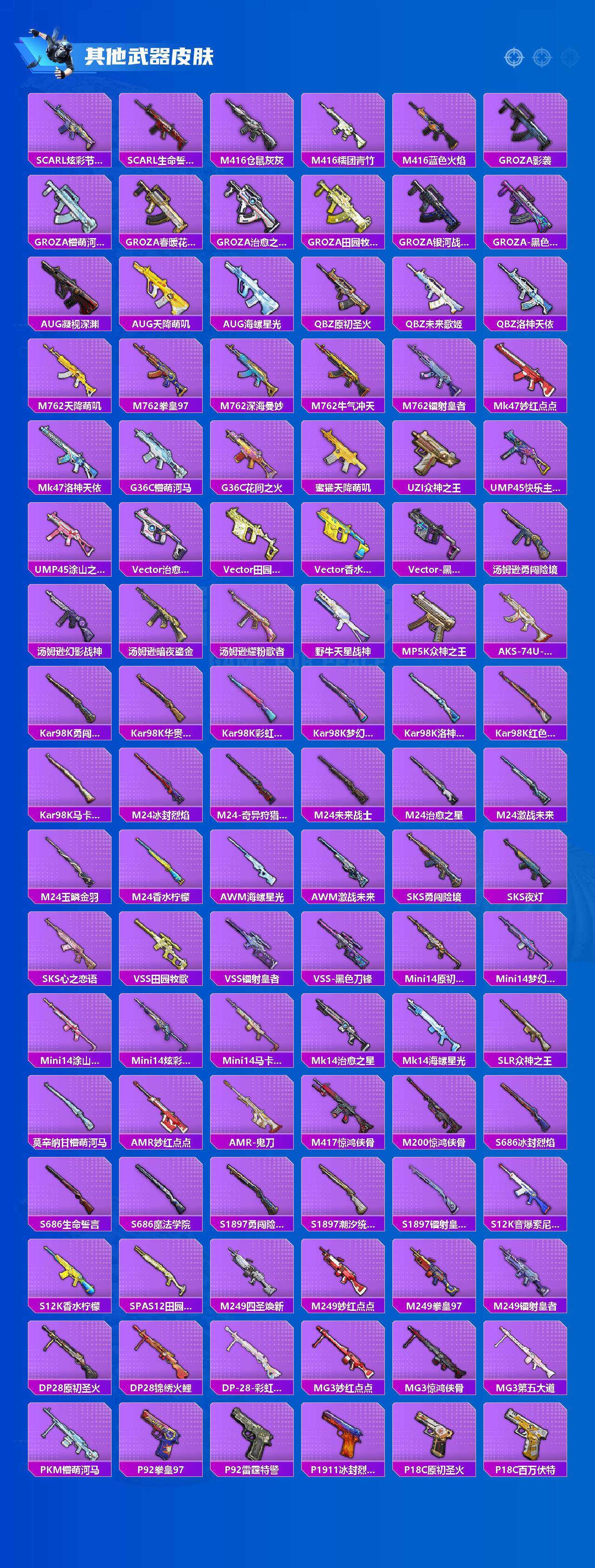 【稀有枪皮】:AKM-夜灯,AKM-影袭,AKM-星之信仰,AKM-破晓战魂,AKM-萌趣颜团子,M16A4-幻世战舞者,SCAR-L-炫彩节奏,SCAR-L-生命誓言,M416-仓鼠灰灰,M416-糯团青竹,M416-蓝色火焰,GROZA-影袭,GROZA-懵萌河马,GROZA-春暖花开,GROZA-治愈之星,GROZA-田园牧歌,GROZA-银河战甲,GROZA-黑色刀锋,AUG-凝视深渊,AUG-天降萌叽,AUG-海螺星光,QBZ-原初圣火,QBZ-未来歌姬,QBZ-洛神天