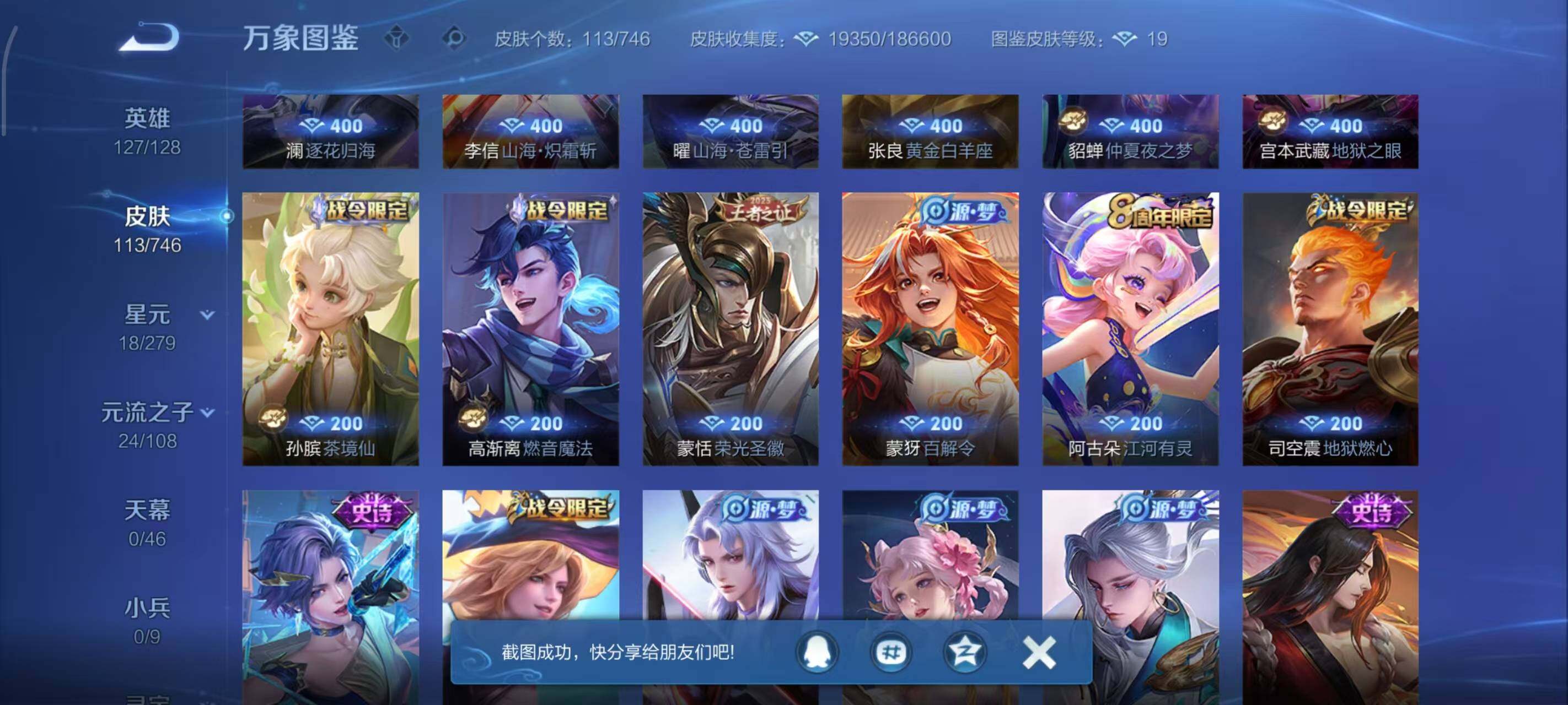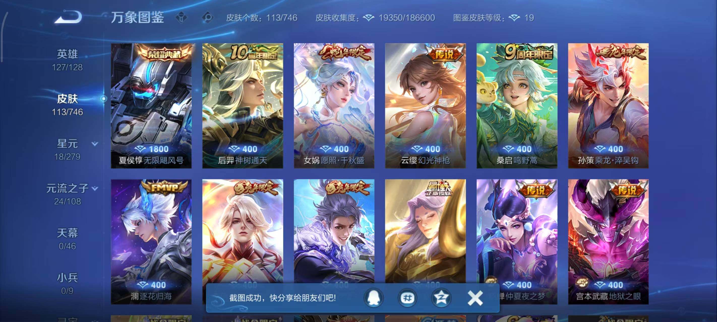 [13868606]安卓Q-V6-113皮肤-1典藏-11传说-38史诗 【英雄全皮】:影全皮 【荣耀典藏】:夏侯惇无限飓风号 【传说皮肤】:后羿神树通天,女娲愿照千秋盛,云缨幻光神枪,桑启鸣野蒿,孙策乘龙淬吴钩,澜逐花归海,曜山海苍雷引,李信山海炽霜斩,张良黄金白羊座,貂蝉仲夏夜之梦,宫本武藏地狱之眼 【限定皮肤】:狄仁杰阴阳师,赵云皇家上将,嬴政优雅恋人,元歌无心,狄仁杰魔术师,项羽海滩派对,李元芳云中旅人,云中君纤云弄巧,李信山海炽霜斩,上官婉儿梁祝,嫦娥拒霜思,曜山海苍雷引,西施玲珑珍味,鲁班大师探海日志,桑启海盐诗旅,戈娅驭风魔法,艾琳流音漫舞,司空震地狱燃心,阿古朵江河有灵,张良古海寻踪,蒙犽百解令,蒙恬荣光圣徽,高渐离燃音魔法,妲己灵卜魔法,鬼谷子天穹祈灯,孙策乘龙淬吴钩 【年限皮肤】:李信山海炽霜斩,曜山海苍雷引,孙策乘龙淬吴钩 【赛季限定】:张良古海寻踪,李元芳云中旅人,鲁班大师探海日志,桑启海盐诗旅,鬼谷子天穹祈灯,蒙恬荣光圣徽 【战令限定】:艾琳流音漫舞,西施玲珑珍味,司空震地狱燃心,戈娅驭风魔法,高渐离燃音魔法,妲己灵卜魔法 【史诗皮肤】:赵云皇家上将,赵云未来纪元,甄姬冰雪圆舞曲,狄仁杰魔术师,廉颇地狱岩魂,孙尚香水果甜心,嬴政优雅恋人,妲己魅力维加斯,妲己女仆咖啡,墨子金属风暴,吕布末日机甲,花木兰水晶猎龙者,小乔缤纷独角兽,诸葛亮黄金分割率,雅典娜冰冠公主,安琪拉心灵骇客,百里守约特工魅影,铠曙光守护者,刘禅天才门将,李元芳逐浪之夏,阿轲节奏热浪,狄仁杰鹰眼统帅,公孙离无限星赏官,上官婉儿梁祝,娜可露露晚萤,不知火舞魅语,橘右京修罗,云中君纤云弄巧,嫦娥拒霜思,元歌无心,戈娅驭风魔法,镜真我赫兹,司空震地狱燃心,阿古朵江河有灵,蒙犽百解令,妲己灵卜魔法,高渐离燃音魔法,蒙恬荣光圣徽,孙膑茶境仙 【其他皮肤】:项羽海滩派对,韩信教廷特使,韩信街头霸王,露娜哥特玫瑰,白起白色死神,扁鹊化身博士,安琪拉玩偶对对碰,妲己少女阿狸,亚瑟死亡骑士,达摩拳王,花木兰兔女郎,张飞五福同心,甄姬花好人间,宫本武藏万象初新,狄仁杰阴阳师,钟无艳海滩丽影,诸葛亮掌控之力,盾山圆桌骑士,狂铁特工战影,程咬金无双福将,李元芳云中旅人,桑启海盐诗旅,太乙真人劲辣红锅,鲁班大师探海日志,西施玲珑珍味,李元芳妄想特派,艾琳流音漫舞,张良古海寻踪,钟无艳聚星闪耀,亚连破局者,曹操决胜大满