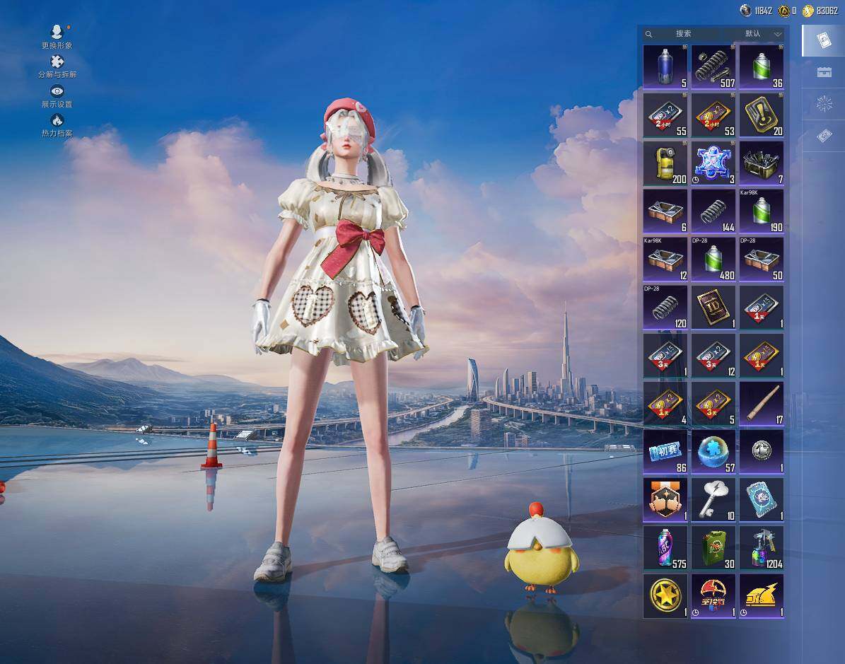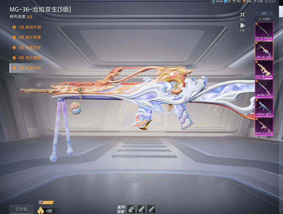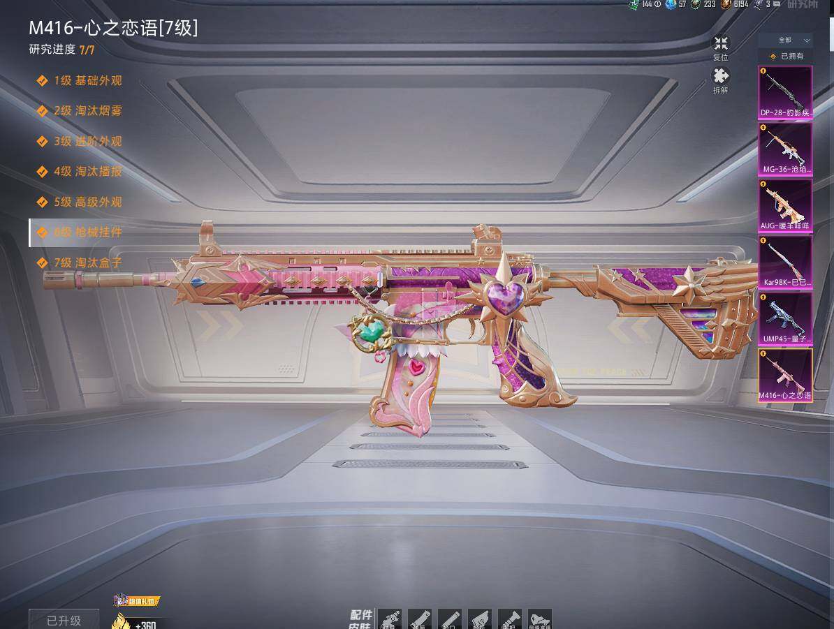 【粉色枪皮等级】:M416-心之恋语(七级),AUG-暖羊咩咩(五级),UMP45-量子极限(五级),Kar98K-巳巳如意(五级),DP-28-豹影疾电(五级),MG-36-沧焰双生(五级)