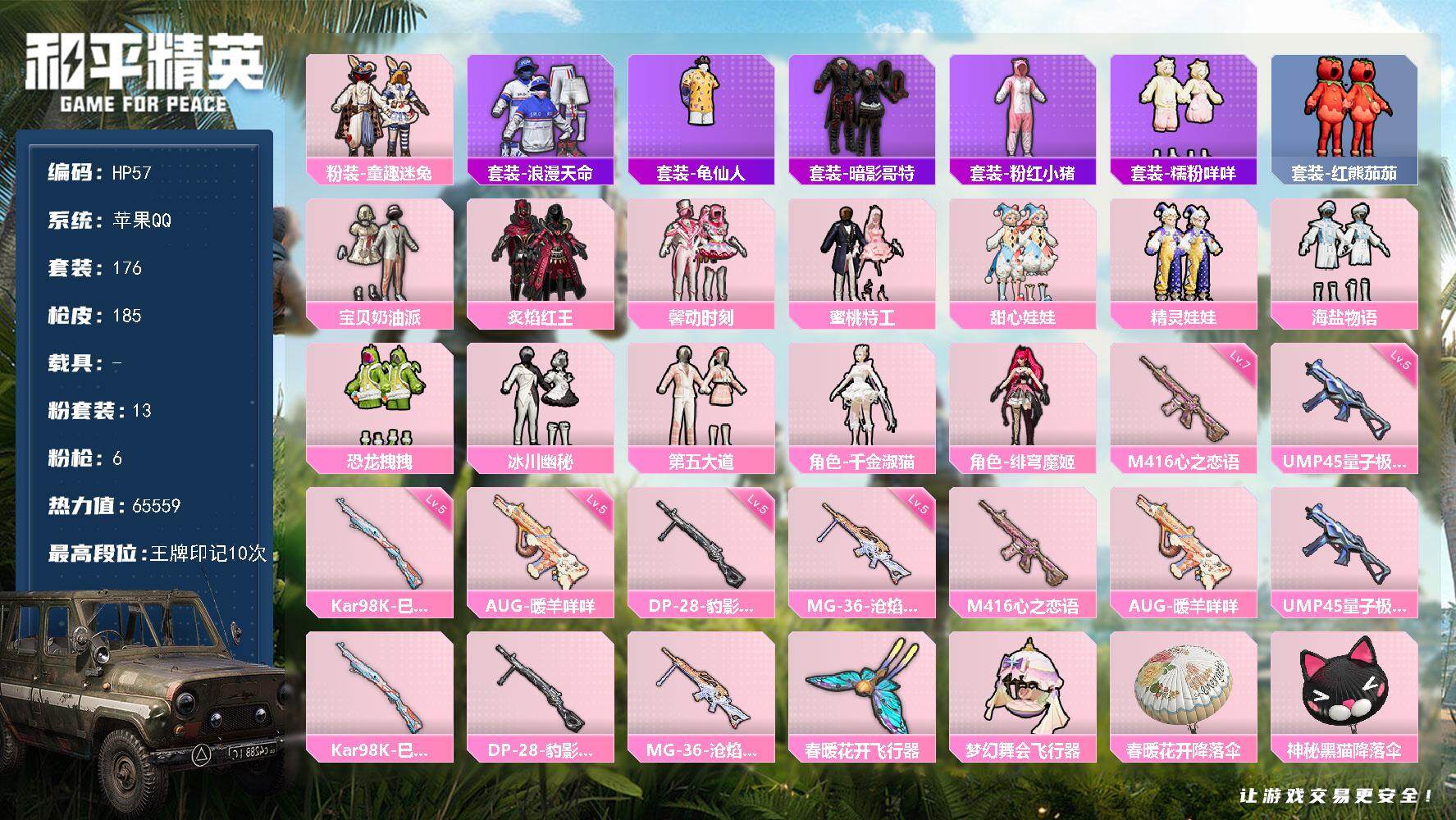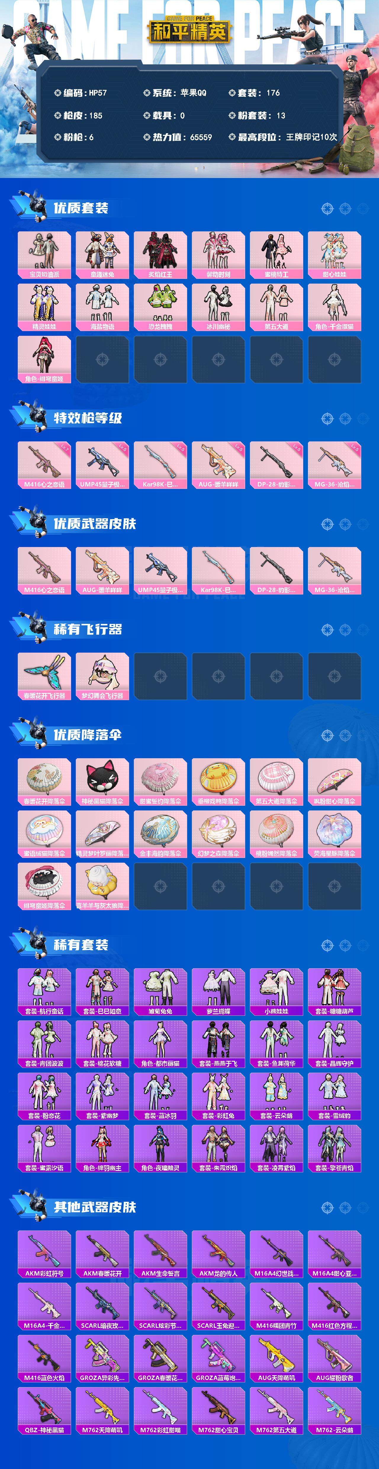 [13868619]苹果 手Q-13粉装-6特效枪-2粉色飞行器-65559热力值-10王牌印记-176套装-185枪皮 【热门品类】:粉装-童趣迷兔,套装-浪漫天命,套装-龟仙人,套装-暗影哥特,套装-粉红小猪,套装-糯粉咩咩,套装-红熊茄茄 【粉色套装】:粉装-宝贝奶油派,粉装-童趣迷兔,粉装-炙焰红王,粉装-馨动时刻,粉装-蜜桃特工,粉装-甜心娃娃,粉装-精灵娃娃,粉装-海盐物语,粉装-恐龙拽拽,粉装-冰川幽秘,粉装-第五大道,角色-千金淑猫,角色-绯穹魔姬 【粉色枪皮等级】:M416-心之恋语(七级),AUG-暖羊咩咩(五级),UMP45-量子极限(五级),Kar98K-巳巳如意(五级),DP-28-豹影疾电(五级),MG-36-沧焰双生(五级) 【粉色枪皮】:M416-心之恋语,AUG-暖羊咩咩,UMP45-量子极限,Kar98K-巳巳如意,DP-28-豹影疾电,MG-36-沧焰双生 【粉色飞行器】:春暖花开飞行器,梦幻舞会飞行器 【粉色降落伞】:春暖花开降落伞,神秘黑猫降落伞,甜蜜誓约降落伞,垂柳戏鸭降落伞,第五大道降落伞,飒粉甜心降落伞,蜜语绒猫降落伞,精灵梦叶罗丽降落伞,金丰海韵降落伞,幻梦之森降落伞,桃粉嫣然降落伞,荧海星豚降落伞,绯穹魔姬降落伞,喜羊羊与灰太狼降落伞 【稀有套装】:套装-龟仙人,套装-航行童话,套装-巳巳如意,套装-雏菊兔兔,套装-萝兰蝴蝶,套装-小熊娃娃,套装-糖糖葫芦,套装-青团波波,套装-棉花软糖,角色-都市丽猫,套装-燕燕于飞,套装-鱼渊荷华,套装-晶辉守护,套装-粉恋花,套装-紫幽梦,套装-蓝冰羽,套装-彩虹兔,套装-云朵鹅,套装-雪绒豹,套装-蜜露汐语,角色-绛羽幽主,角色-夜瞳黯灵,套装-朱霞炽焰,套装-凌霄紫焰,套装-擎苍青焰 【稀有枪皮】:AKM-彩虹符号,AKM-春暖花开,AKM-生命誓言,AKM-龙的传人,M16A4-幻世战舞者,M16A4-甜心亚梦,M16A4-千金淑猫,SCAR-L-暗夜玫瑰,SCAR-L-炫彩节奏,SCAR-L-玉兔迎春,M416-糯团青竹,M416-红色方程式,M416-蓝色火焰,GROZA-异彩先驱,GROZA-春暖花开,GROZA-蓝莓炮弹,AUG-天降萌叽,AUG-耀粉歌者,QBZ-神秘黑猫,M762-天降萌叽,M762-彩虹甜喵,M762-甜心宝贝,M762-第五大道,M762-云朵鹅,Mk47