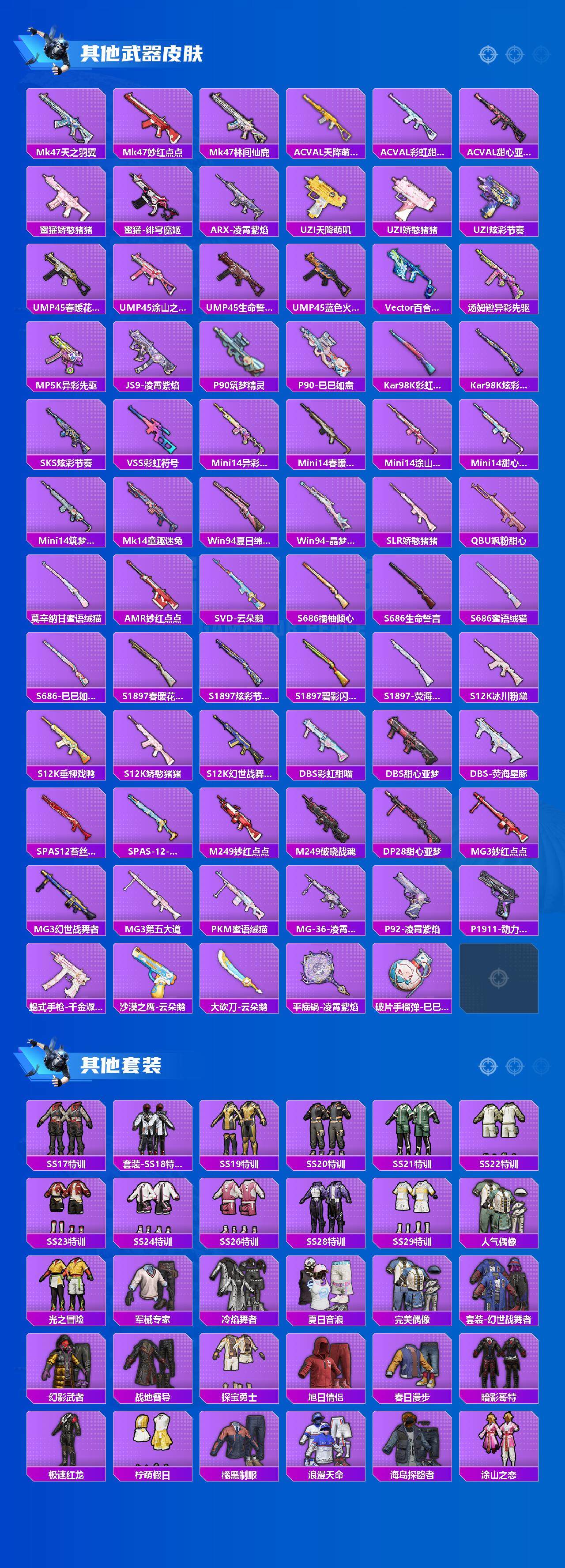 【稀有枪皮】:AKM-彩虹符号,AKM-春暖花开,AKM-生命誓言,AKM-龙的传人,M16A4-幻世战舞者,M16A4-甜心亚梦,M16A4-千金淑猫,SCAR-L-暗夜玫瑰,SCAR-L-炫彩节奏,SCAR-L-玉兔迎春,M416-糯团青竹,M416-红色方程式,M416-蓝色火焰,GROZA-异彩先驱,GROZA-春暖花开,GROZA-蓝莓炮弹,AUG-天降萌叽,AUG-耀粉歌者,QBZ-神秘黑猫,M762-天降萌叽,M762-彩虹甜喵,M762-甜心宝贝,M762-第五大道,M762-云朵鹅,Mk47