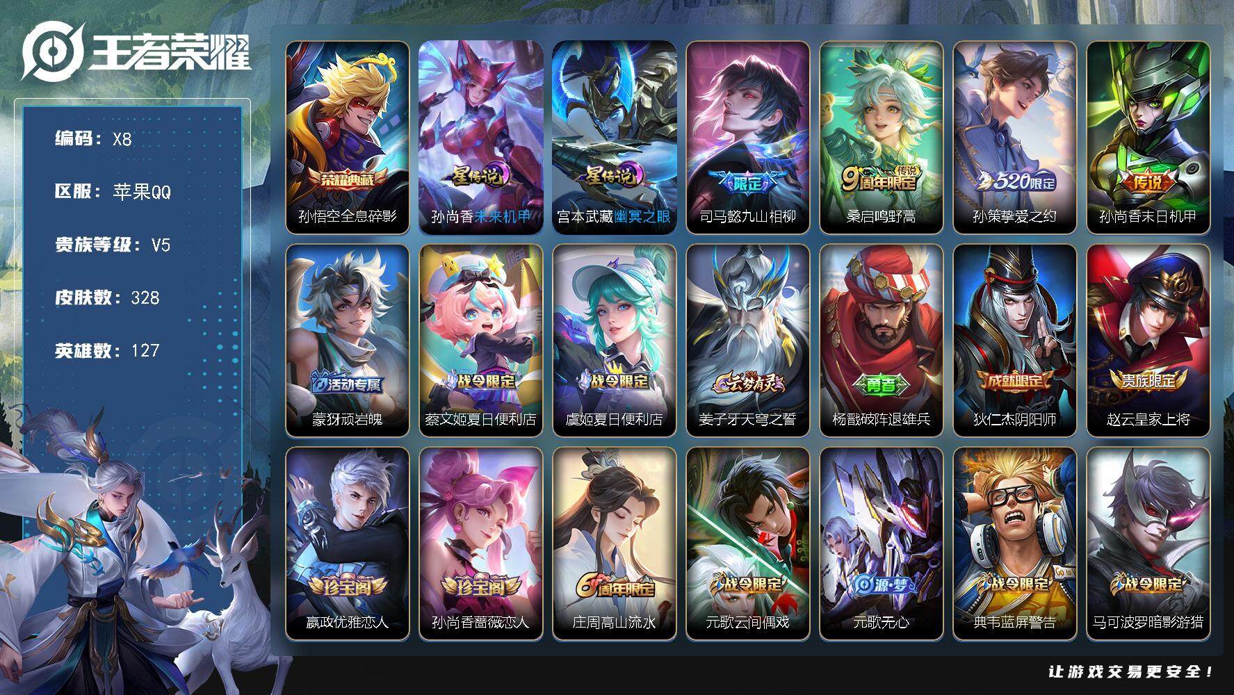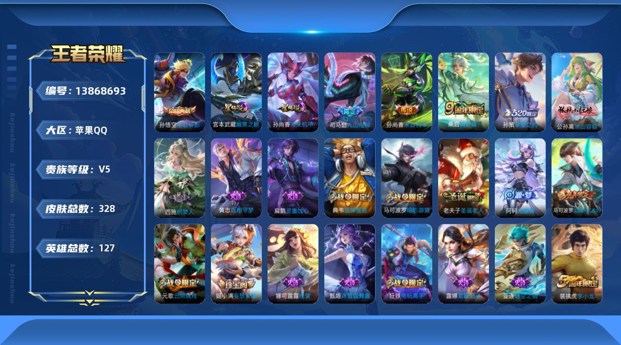 [13868693]苹果Q-V5-127英雄-328皮肤-1典藏-4传说-87史诗