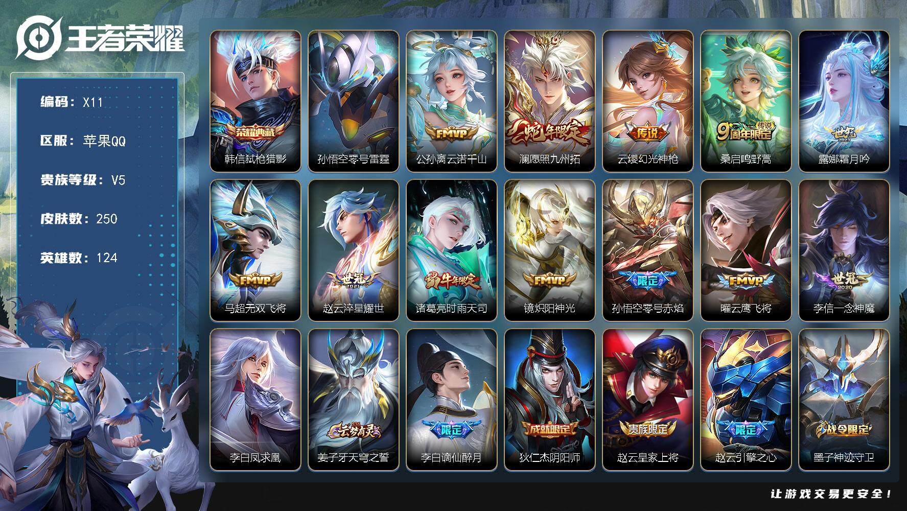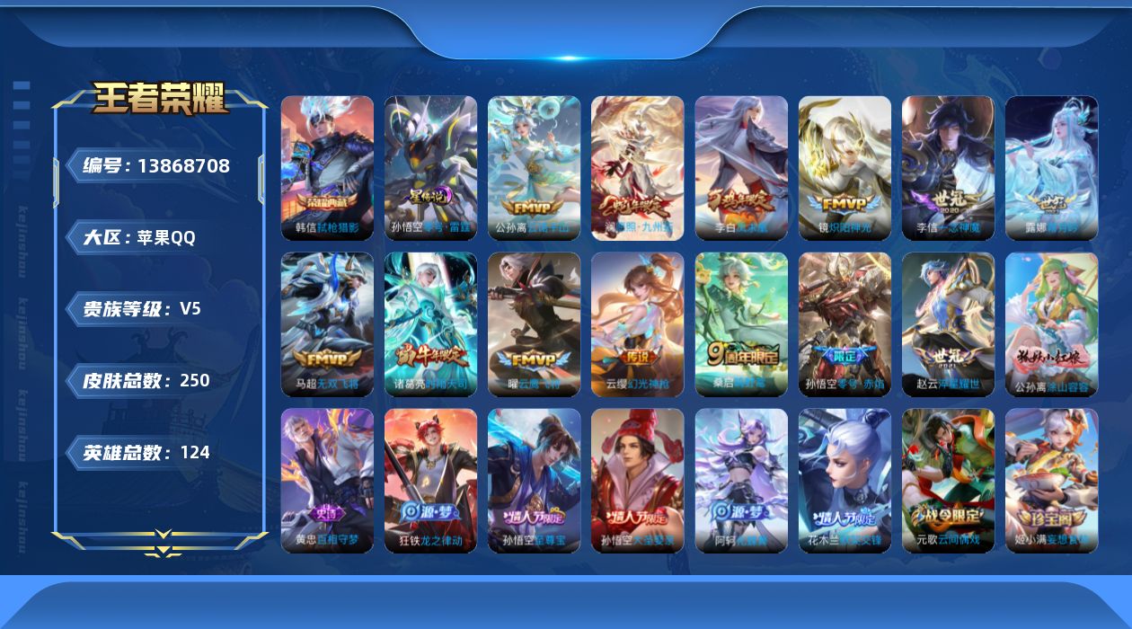 [13868708]苹果Q-V5-最强王者段位-124英雄-250皮肤-1典藏-13传说-61史诗