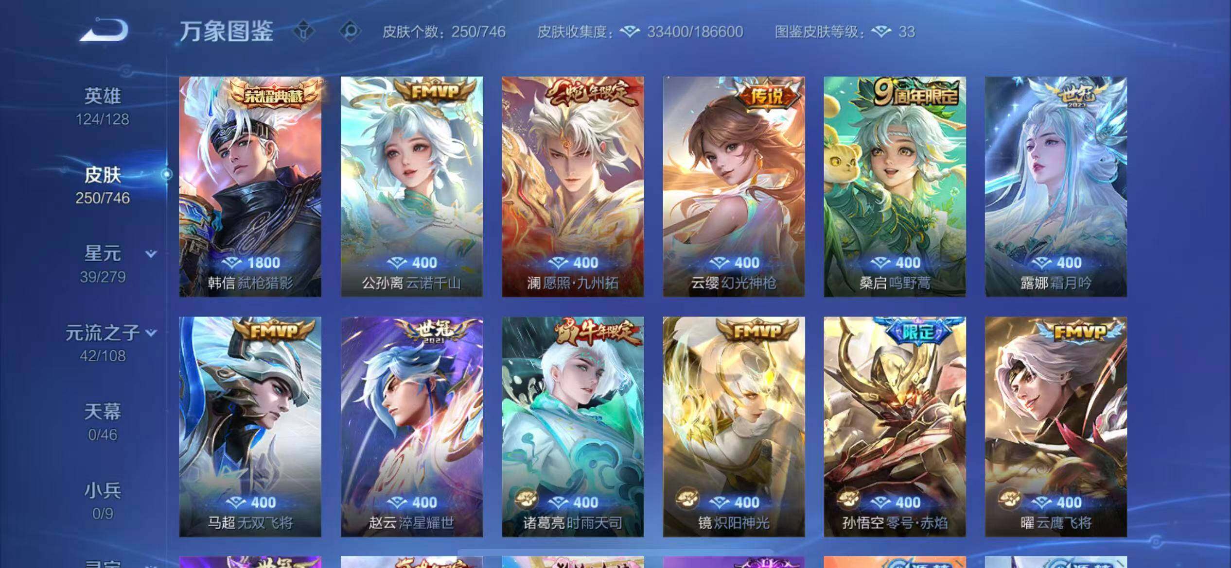 - [12266568]V9 1典藏 4无双 32传说 125英雄 330皮肤 可修改实名 女号 优质装备:幻阙歌(貂蝉典藏),真我赫兹(瑶)(瑶无双),青丘·九尾(妲己无双),韩信群星魔术团(韩信无双),天机白泽,冠军飞将,猫影幻舞,久胜战神,炽阳神光,云霓雀翎,仲夏夜之梦(大飞蛾),地狱之眼,游龙清影(小青龙),挚爱花嫁,碎云,山海·琳琅生(小乔年限),炽翼辉光(娃娃菜牛角包),浮生妄,记忆之芯(机甲兔),青丘·九尾,霜月吟,金乌负日,朵莉亚心动手记,诡秘之主,千山共赴,涂山容容 传说皮:乘龙·问璇玑(孙尚香年限),貂蝉曦玄引,死亡执政官,九山相柳,幻光神枪 珍宝阁皮:妄想食味,优雅恋人,蔷薇恋人 限定皮:愿照·千秋盛(女娲年限),逐霄战戟,鸣野蒿,至尊宝,武陵仙君(小桃花),补天,星穹之声,白鹤梁神女,魔法小厨娘,玄嵩(庄周年限),山海·碧波行(瑶年限),至美·乘鲤谣,降魔,五谷丰年,天狼运算者,游园惊梦,梁祝,天狼溯光者,逐梦之音,天狼绘梦者,李小龙,朱雀志(守约年限),辉光之辰,奇迹圣诞,默契交锋-花木兰,云端筑梦师,热情桑巴,寅虎·心曲(虎婆),时之祈愿-瑶(瑶传限),启示之音,唐三藏,时之奇旅-妲己 史诗皮:器灵·浮梦炉,龙之律动,琥珀纪元伽罗,星界战将,百相守梦-周瑜,茶境仙,乘龙·忆丹青(大乔年限),百相守梦-黄忠,涂山红红,东方月初,蒙犽顽岩魄,芈月浮光幕影,乘龙·聚宝船(安琪拉年限),蔬乡物语(鲁班七号),幻珠鲛人,守夜人,织梦人,紫霞仙子,电玩小子(小书包),黄金分割率,特工魅影,千年之狐,永昼,冰冠公主,江河有灵,百解令(蒙犽),高渐离燃音魔法,蒙恬荣光圣徽,魅语,电玩·爆裂旋风,无限星赏官,晚萤,偶像歌手,银翎春语,龙骑士(小龙虾),末日机甲-吕布,猫狗日记-大乔,时之恋人-孙尚香,乱世虎臣,节奏热浪,女仆咖啡,摇滚巨星,水果甜心,绅士熊喵,天才门将,星夜王子,心灵骇客,时之奇旅-安琪拉,功夫厨神,德古拉伯爵,暗隐猎兽者,幽灵船长,鬼剑武藏,舞动绿茵,诗语江南,拒霜思,缤纷独角兽,乘风破浪,逐浪之夏,月团寄思,水晶猎龙者,曙光守护者,唤灵魅影,金属风暴,原初追逐者,圣诞狂欢,圣诞恋歌,鹰眼统帅,黎明之约,奇遇舞章,千筹问战,无心,