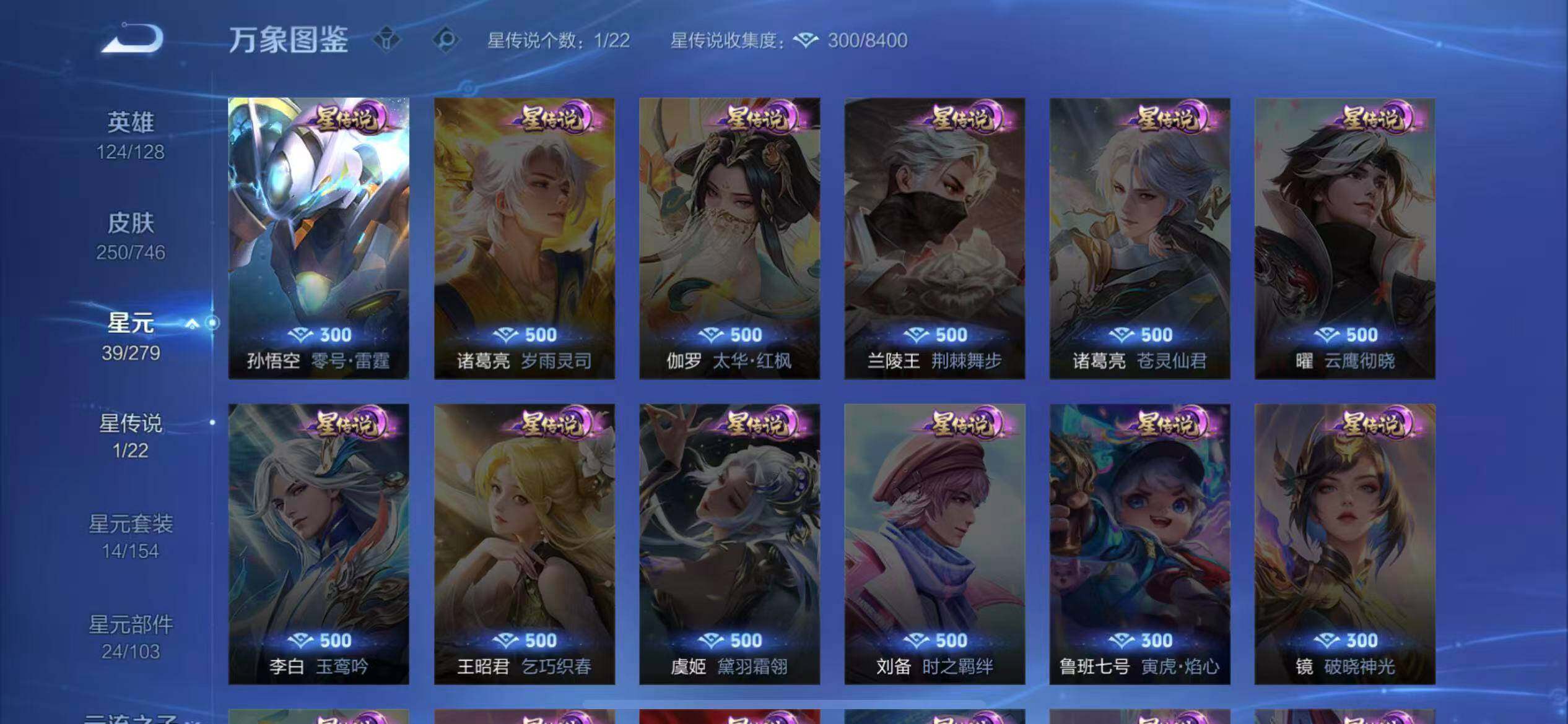 - PX_2107971-Q/至尊星耀/326皮肤/125英雄/1典藏/0珍品无双/2无双/3珍品传说/22传说/111史诗/9稀有英雄 【3 珍品传说】怪盗基德 马可波罗,时之奇旅 孙策,器灵·落星盏 嫦娥, 【1 典藏皮肤】神鉴启示录 虞姬, 【2 无双皮肤】雪境奇遇 甄姬,器灵·螭龙剑 曜, 【22 传说皮肤】启明星使 虞姬,云霓雀翎 虞姬,无双飞将 马超,白虎志 百里玄策,灼幽烈阳 东皇太一,