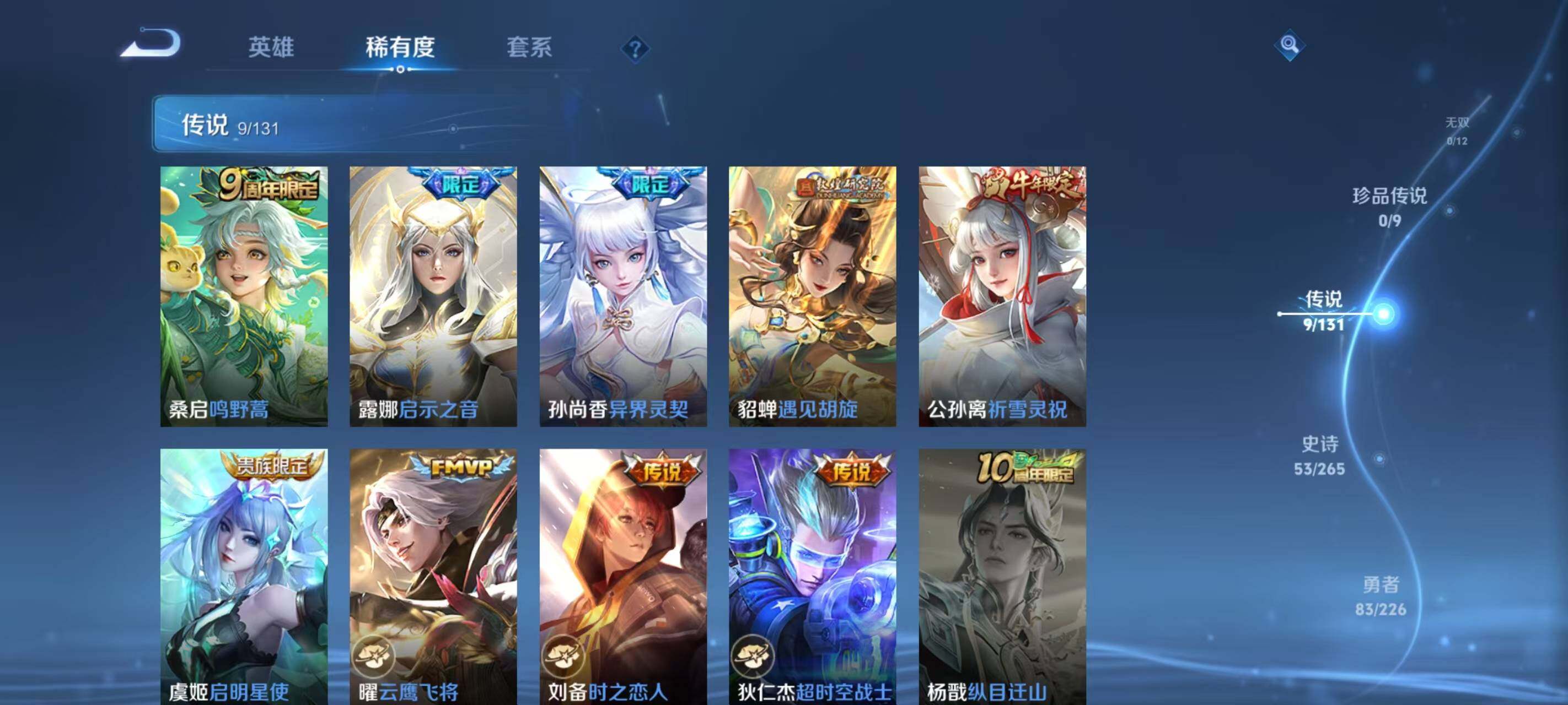 【传说皮肤】:桑启鸣野蒿,露娜启示之音,孙尚香异界灵契,貂蝉遇见胡旋,公孙离祈雪灵祝,虞姬启明星使,曜云鹰飞将,刘备时之恋人,狄仁杰超时空战士
