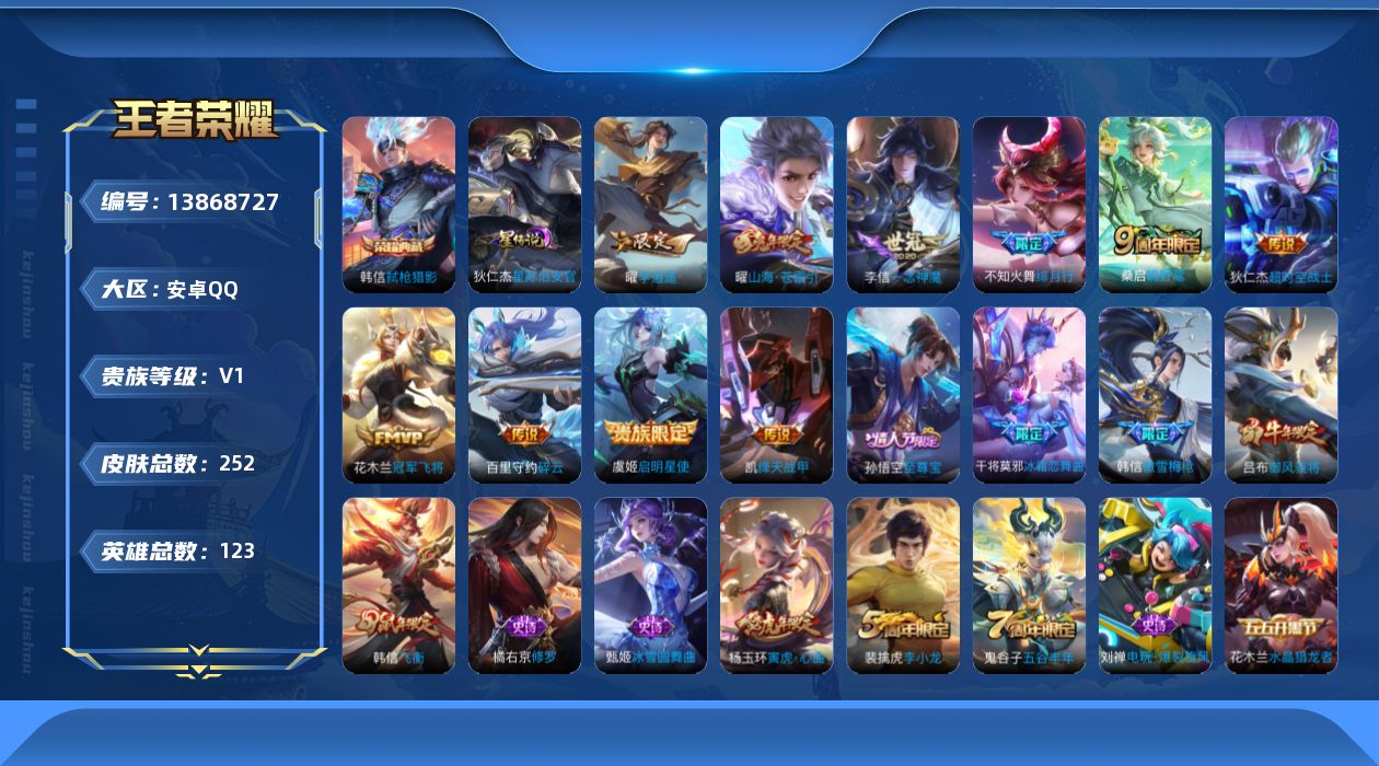 [13868727]安卓Q-123英雄-252皮肤-1典藏-10传说-53史诗