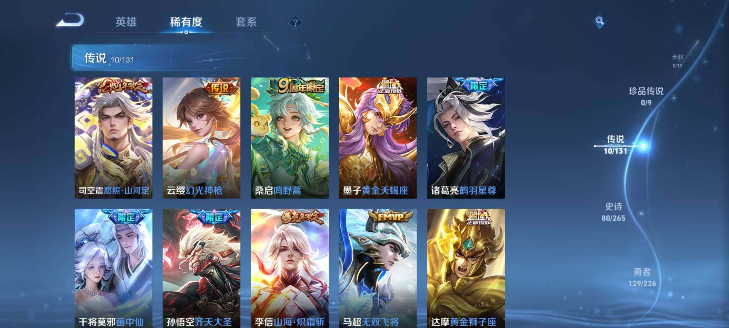 【传说皮肤】:司空震愿照山河定,云缨幻光神枪,桑启鸣野蒿,墨子黄金天蝎座,诸葛亮鹤羽星尊,干将莫邪画中仙,孙悟空齐天大圣,李信山海炽霜斩,马超无双飞将,达摩黄金狮子座