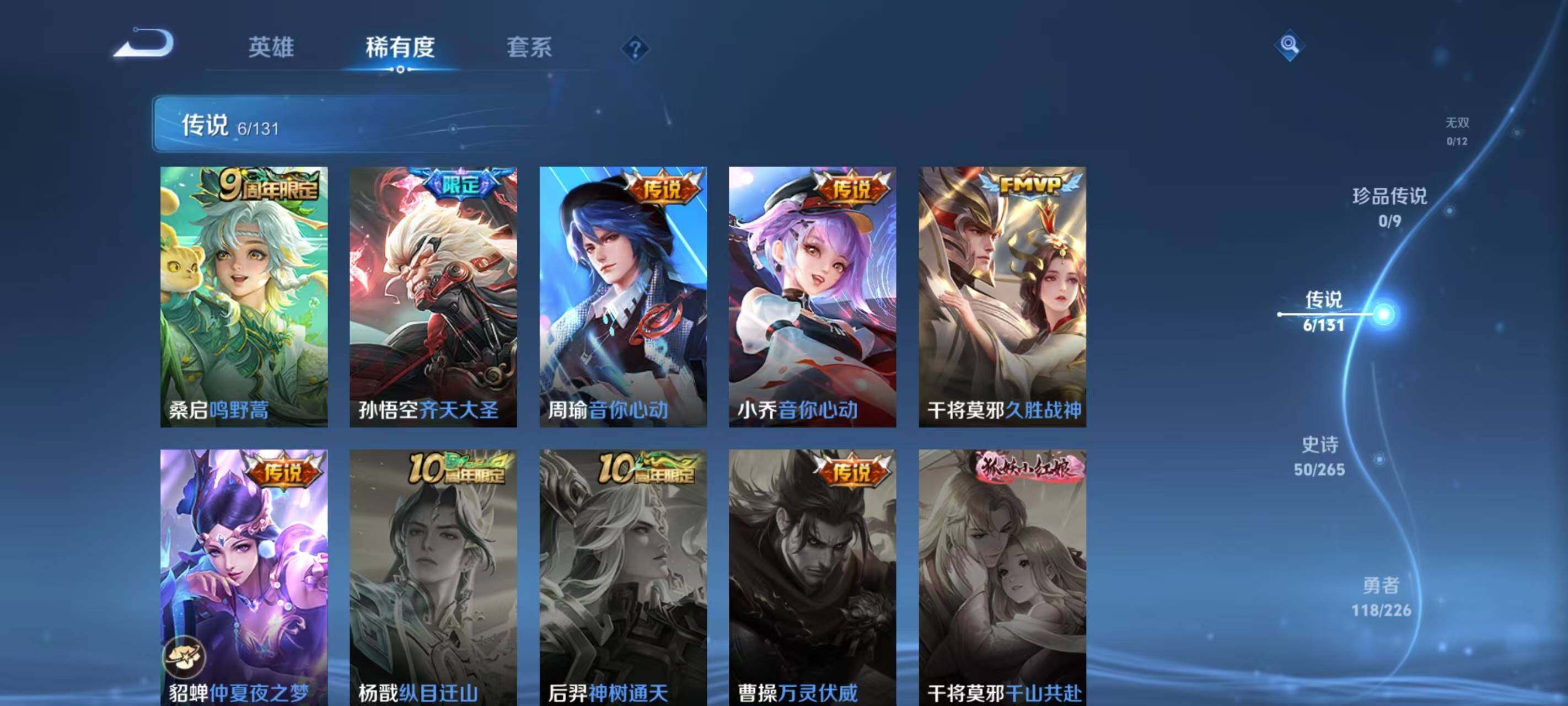【传说皮肤】:桑启鸣野蒿,孙悟空齐天大圣,周瑜音你心动,小乔音你心动,干将莫邪久胜战神,貂蝉仲夏夜之梦
