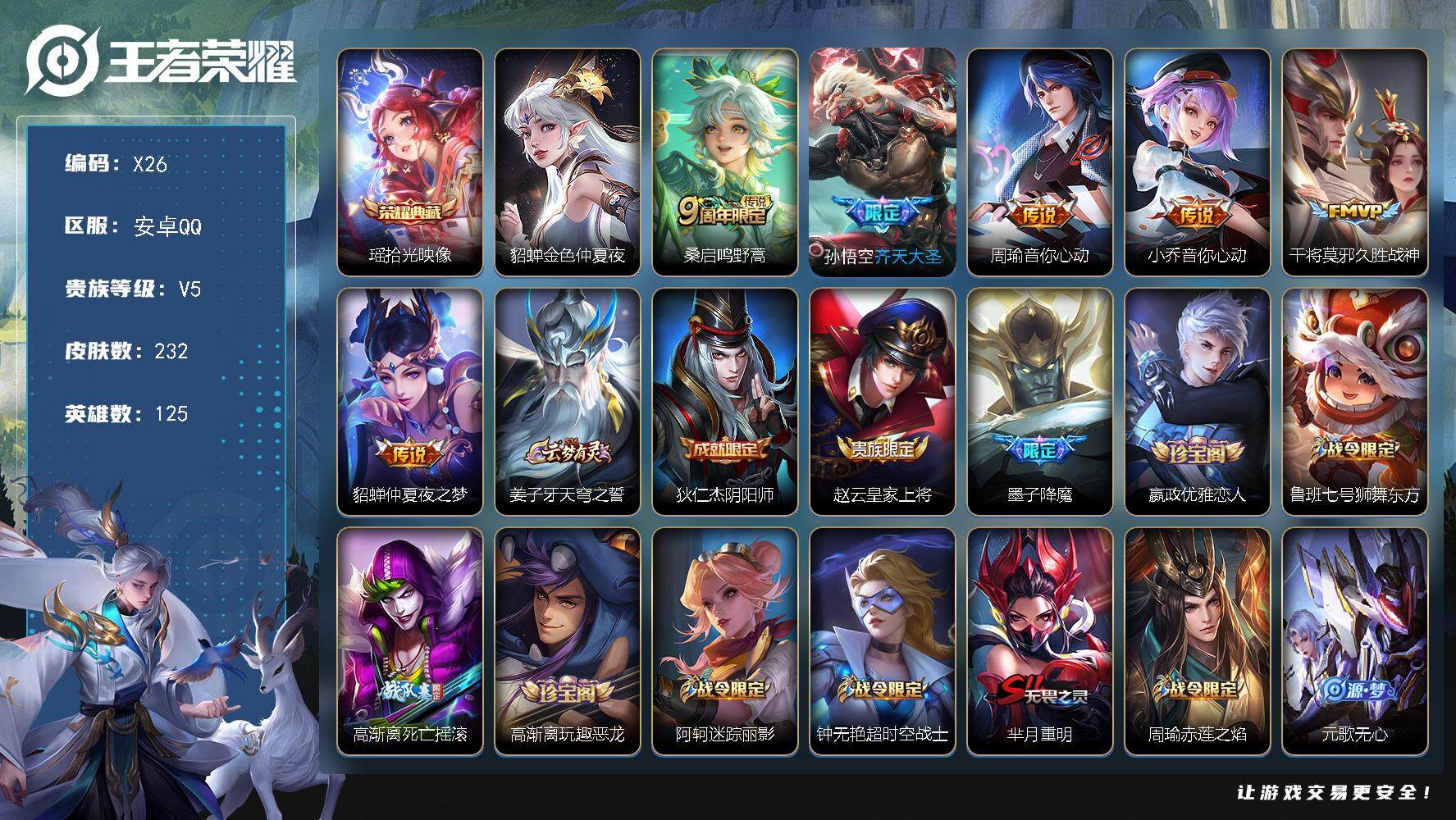 - PX_2089550- 可二次 V7 贵族积分44033 安卓QQ/ 232皮肤/ 123英雄 【1 星传说皮肤】,金色仲夏夜 貂蝉, 【1 典藏皮肤】,杀手不太冷 孙尚香, 【14 传说皮肤】,云霓雀翎 虞姬,无双飞将 马超,李逍遥 曜,零号·赤焰 孙悟空,猫影幻舞 貂蝉,仲夏夜之梦 貂蝉,武陵仙君 诸葛亮,怒海麟威 吕布,末日机甲 孙尚香,山海·炽霜斩 李信,太华 伽罗,冠军飞将 花木兰,