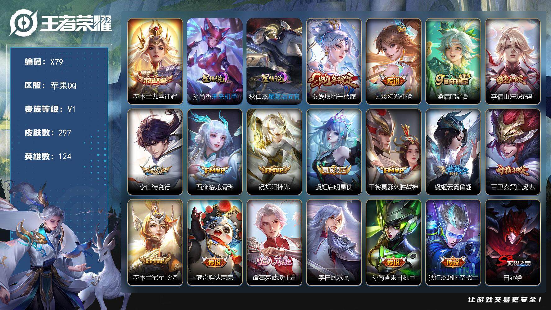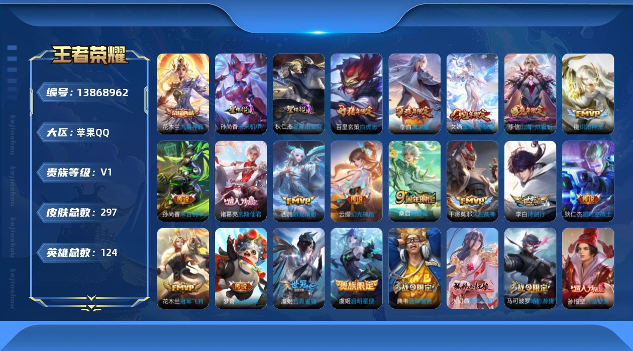 [13868962]苹果Q-297皮肤-1典藏-17传说-86史诗 【荣耀典藏】:花木兰九霄神辉 【传说皮肤】:女娲愿照千秋盛,云缨幻光神枪,桑启鸣野蒿,李信山海炽霜斩,李白诗剑行,西施游龙清影,镜炽阳神光,虞姬启明星使,干将莫邪久胜战神,虞姬云霓雀翎,百里玄策白虎志,花木兰冠军飞将,梦奇胖达荣荣,诸葛亮武陵仙君,李白凤求凰,孙尚香末日机甲,狄仁杰超时空战士 【限定皮肤】:白起狰,姜子牙天穹之誓,杨戬破阵退雄兵,狄仁杰阴阳师,虞姬凯尔特女王,赵云皇家上将,嬴政白昼王子,孙尚香蔷薇恋人,鲁班七号狮舞东方,高渐离死亡摇滚,钟无艳超时空战士,白起夜都怪侠,芈月重明,吕布猎兽之王,周瑜赤莲之焰,元歌无心,夏侯惇朔风刀,甄姬游园惊梦,甄姬落雪兰心,曹操烛龙,典韦穷奇,典韦蓝屏警告,马可波罗暗影游猎,狄仁杰魔术师,狄仁杰万华元夜,达摩沙漠行僧,项羽海滩派对,老夫子醍醐杖,貂蝉逐梦之音,程咬金演武夺筹,韩信飞衡,王昭君凤凰于飞,王昭君午后时光,兰陵王驯魔猎人,兰陵王金庭之子,孙悟空大圣娶亲,牛魔御旌,李元芳银河之约,李元芳云中旅人,虞姬霸王别姬,虞姬启明星使,钟馗神迹守卫,钟馗驱傩正仪,杨玉环遇见飞天,女娲朔望之晖,雅典娜黎明之约,蔡文姬繁星吟游,太乙真人饕餮,太乙真人华丽摇滚,鬼谷子原初探秘者,鬼谷子五谷丰年,诸葛亮武陵仙君,黄忠烈魂,百里玄策白虎志,百里玄策原初追逐者,弈星混沌棋,梦奇顽趣,沈梦溪星空之诺,沈梦溪大漠名商,明世隐疑决卦,明世隐吟游魔法,裴擒虎天狼狩猎者,裴擒虎李小龙,裴擒虎擒涛扼浪,狂铁御狮,狂铁电玩高手,米莱狄御霄,云中君纤云弄巧,李信山海炽霜斩,伽罗天狼溯光者,盾山御銮,猪八戒西部大镖客,上官婉儿梁祝,上官婉儿天狼绘梦者,桑启海盐诗旅,艾琳女武神,张良古海寻踪,鬼谷子天穹祈灯,沈梦溪龙舞盛年,刘邦剑破天穹,镜青焰无极,项羽苍威无极,海诺心动手记,刘备异域游侠,芈月浮光幕影,周瑜熔金海岸 【年限皮肤】:百里玄策白虎志,王昭君凤凰于飞,李白凤求凰,韩信飞衡,黄忠烈魂,李信山海炽霜斩 【赛季限定】:白起狰,芈月重明,夏侯惇朔风刀,曹操烛龙,典韦穷奇,狄仁杰万华元夜,达摩沙漠行僧,老夫子醍醐杖,程咬金演武夺筹,兰陵王金庭之子,张良古海寻踪,牛魔御旌,李元芳云中旅人,虞姬凯尔特女王,钟馗驱傩正仪,雅典娜黎明之约,太乙真人饕餮,鬼谷子原初探秘者,百里玄策原初追逐者,弈星混沌棋,梦奇顽趣