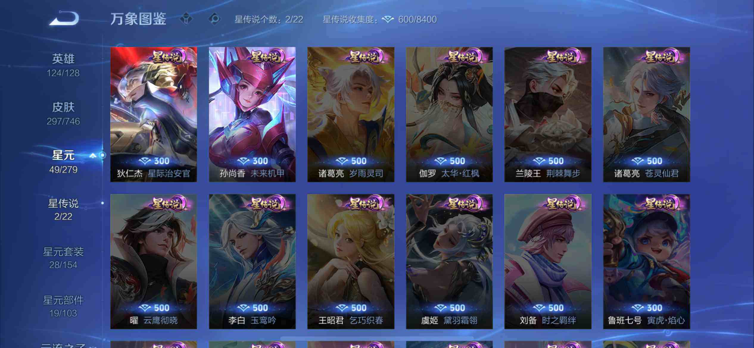 虞姬凯尔特女王,白起狰,太乙真人饕餮,曹操烛龙,芈月重明,典韦穷奇,狂铁御狮,米莱狄御霄,牛魔御旌,盾山御銮,夏侯惇朔风刀,明世隐疑决卦,老夫子醍醐杖,鬼谷子原初探秘者,狄仁杰万华元夜,程咬金演武夺筹,钟馗驱傩正仪,吕布猎兽之王,嬴政白昼王子,女娲朔望之晖,典韦蓝屏警告,钟馗神迹守卫,鲁班七号狮舞东方,沈梦溪星空之诺,李元芳银河之约,马可波罗暗影游猎,弈星混沌棋,达摩沙漠行僧,兰陵王金庭之子,沈梦溪大漠名商,李元芳云中旅人,桑启海盐诗旅,裴擒虎擒涛扼浪,张良古海寻踪,项羽苍威无极,镜青焰无极
