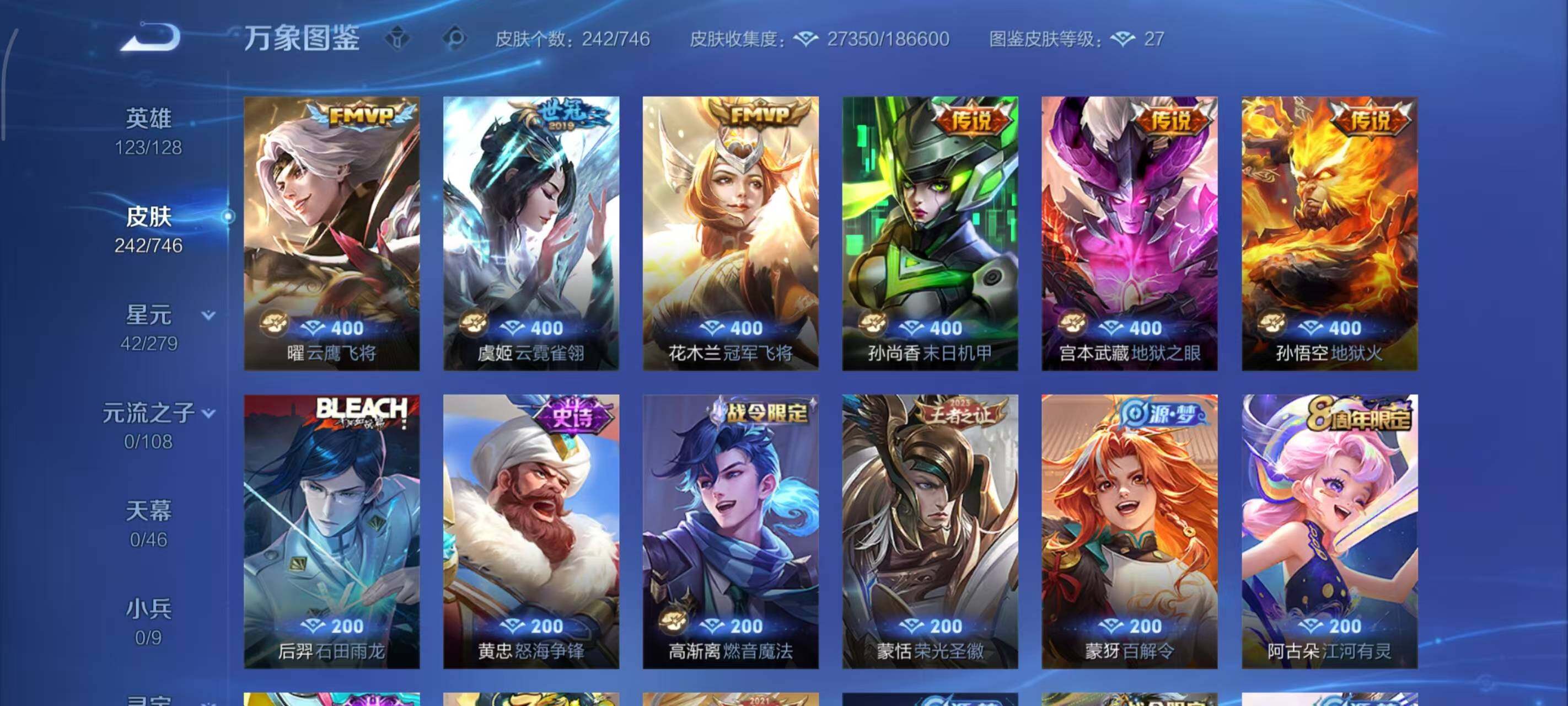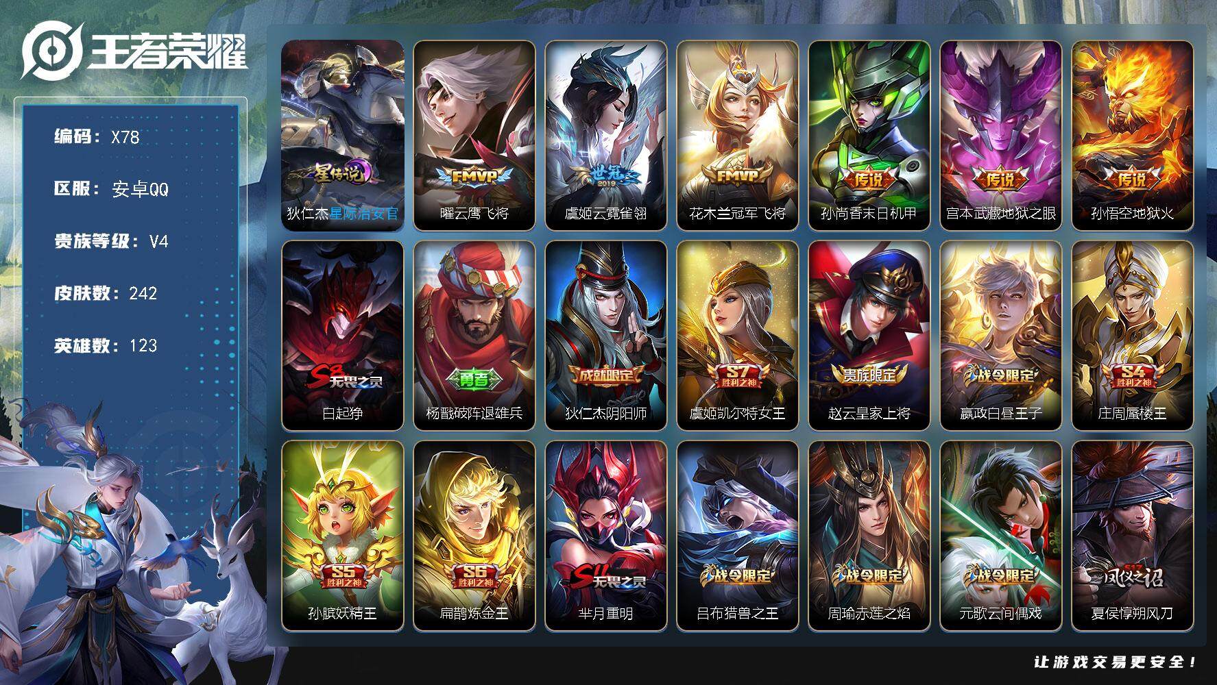 - [12029037]V9 2典藏 1无双 2珍品传说 38传说 125英雄 461皮肤 可修改实名 优质装备:天鹅之梦(小乔典藏),离恨烟(公孙离无双),拾光映像(瑶典藏),大耳狗之梦,黄金狮子座,黄金射手座,猫影幻舞,炽阳神光,一念神魔,云霓雀翎,末日机甲-孙尚香(绿蚂蚱),地狱火,仲夏夜之梦(大飞蛾),地狱之眼,胖达荣荣,李逍遥,游龙清影(小青龙),超时空战士-狄仁杰,遇见胡旋,挚爱之约,挚爱花嫁,山海·炽霜斩(李信年限),山海·琳琅生(小乔年限),山海·苍雷引(电光曜子),记忆之芯(机甲兔),百相守梦(张飞),永恒水手月亮,霜月吟,涂山容容 珍品传说:兔狲·蓬尾 传说皮:云诺千山,幻光神枪 珍宝阁皮:妄想食味,优雅恋人,蔷薇恋人 限定皮:逐霄战戟,陌上桑,鸣野蒿,至尊宝,白虎志(电光耗子),太华(伽罗年限),异界灵契(白毛香),补天,寅虎·展翼(孙膑年限),绯月行,时之彼端,白鹤梁神女,白晶晶,时雨天司(水龙头),神威(电光马子),飞衡(韩信年限),山海·碧波行(瑶年限),遇见飞天,高山流水,无限倾心-虞姬,五谷丰年,冰锋战神,游园惊梦,梁祝,龙胆,天狼溯光者,逐梦之音,祈雪灵祝(雪兔子),李小龙,如梦令-嫦娥,霸王别姬-虞姬,默契交锋-花木兰,孙行者,一生所爱,青春决赛季,冰霜恋舞曲,蜜橘之夏,热情桑巴,神奇女侠,匿光追影者,女儿国国王,寅虎·瑞焰(虎皮蛋子),寅虎·心曲(虎婆),玉兔公主,启示之音,神器·万象笔,山海·玄木吟(马可年限) 史诗皮:鸭鸭历险记-刘禅,化蝶舞,灵蛊蚀心,星界战将,龙之律动,布丁狗之誓,石田雨龙,百相守梦-周瑜,幻珠鲛人,炽弈燎原,破空之剑,涂山红红,东方月初,埋骨钱,琥珀纪元伽罗,上官婉儿群星魔术团,蔬乡物语(鲁班七号),百相守梦-百里守约,百相守梦-黄忠,织梦人,守夜人,遇见神鹿,紫霞仙子,苍穹之光,电玩小子(小书包),黄金分割率,特工魅影,千年之狐,永昼,江河有灵,雪夜绮愿(周瑜),魅语,百解令(蒙犽),高渐离燃音魔法,蒙恬荣光圣徽,无限星赏官,匿光破解者,青蛇,偶像歌手,白蛇,晚萤,电玩·爆裂旋风,暗夜猫娘,银翎春语,龙骑士(小龙虾),末日机甲-吕布,猫狗日记-孙策,猫狗日记-大乔,时之恋人-孙尚香,乱世虎臣,节奏热浪,修罗,女仆咖啡,摇滚巨星,水果甜心,绅士熊喵,天才门将,星夜王子,心灵骇客,时之奇旅-安琪拉,功夫厨神,德古拉伯爵,暗隐