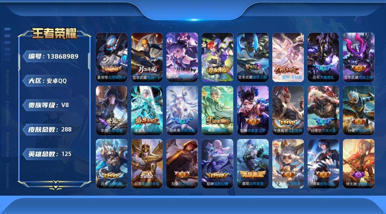 - [12091559]V10 5典藏 1珍品传说 35传说 126英雄 451皮肤 典藏英雄武则天 可修改实名 优质装备:天鹅之梦(小乔典藏),倪克斯神谕(宇宙婆娘),全息碎影(猴子典藏),银白咏叹调(倪克斯侍卫),弑枪猎影(韩信典藏),黄金狮子座,黄金射手座,冠军飞将,黄金白羊座,久胜战神,末日机甲-孙尚香(绿蚂蚱),地狱火,零号·赤焰,地狱之眼,音你心动-周瑜,时之恋人-刘备(电焊工),超时空战士-狄仁杰,山海·炽霜斩(李信年限),山海·琳琅生(小乔年限),山海·苍雷引(电光曜子),燃星之曲,艾琳觅芳踪,涂山容容 珍品传说:兔狲·蓬尾 传说皮:乘龙·淬吴钩(孙策年限),幻光神枪 珍宝阁皮:妄想食味,玩趣恶龙 限定皮:愿照·九州拓(澜年限),愿照·福禄聚(蔡文姬年限),愿照·岁时盈(虞姬年限),愿照·山河定(司空震年限),愿照·众生和(妲己年限),愿照·千秋盛(女娲年限),逐霄战戟,陌上桑,鸣野蒿,至尊宝,凤求凰(白切鸡),凤凰于飞,太华(伽罗年限),武陵仙君(小桃花),时之彼端,神威(电光马子),飞衡(韩信年限),玄嵩(庄周年限),山海·碧波行(瑶年限),无限倾心-项羽,影龙天霄,遇见飞天,无限倾心-虞姬,齐天大圣,五谷丰年,青龙志(铠年限),幽恒(沐浴露),游园惊梦,龙胆,逐梦之星,烈魂,岱宗(典韦年限),虎魄,天狼征服者,天狼绘梦者,李小龙,逐梦之影,朱雀志(守约年限),辉光之辰,大圣娶亲,引擎之心,天魔缭乱,青春决赛季,蜜橘之夏,山海·玄木吟(马可年限) 史诗皮:鸭鸭历险记-刘禅,器灵·浮梦炉,化蝶舞,灵蛊蚀心,星界战将,谪仙醉月,龙之律动,雪豹·霜爪,石田雨龙,百相守梦-周瑜,茶境仙,幻珠鲛人,怒海争锋,撼地雄心,破空之剑,蒙犽顽岩魄,埋骨钱,芈月浮光幕影,琥珀纪元伽罗,蔬乡物语(鲁班七号),百相守梦-百里守约,百相守梦-黄忠,织梦人,紫霞仙子,苍穹之光,电玩小子(小书包),白龙吟,黄金分割率,特工魅影,千年之狐,江河有灵,雪夜绮愿(周瑜),魅语,百解令(蒙犽),高渐离燃音魔法,蒙恬荣光圣徽,无限星赏官,冰冠公主,青蛇,偶像歌手,晚萤,暗夜猫娘,龙骑士(小龙虾),末日机甲-吕布,猫狗日记-孙策,猫狗日记-大乔,时之恋人-孙尚香,乱世虎臣,节奏热浪,修罗,女仆咖啡,摇滚巨星,水果甜心,绅士熊喵,天才门将,星夜王子,心灵骇客,功夫厨神,德古拉伯爵,暗隐猎兽者,幽灵船长,鬼剑武藏