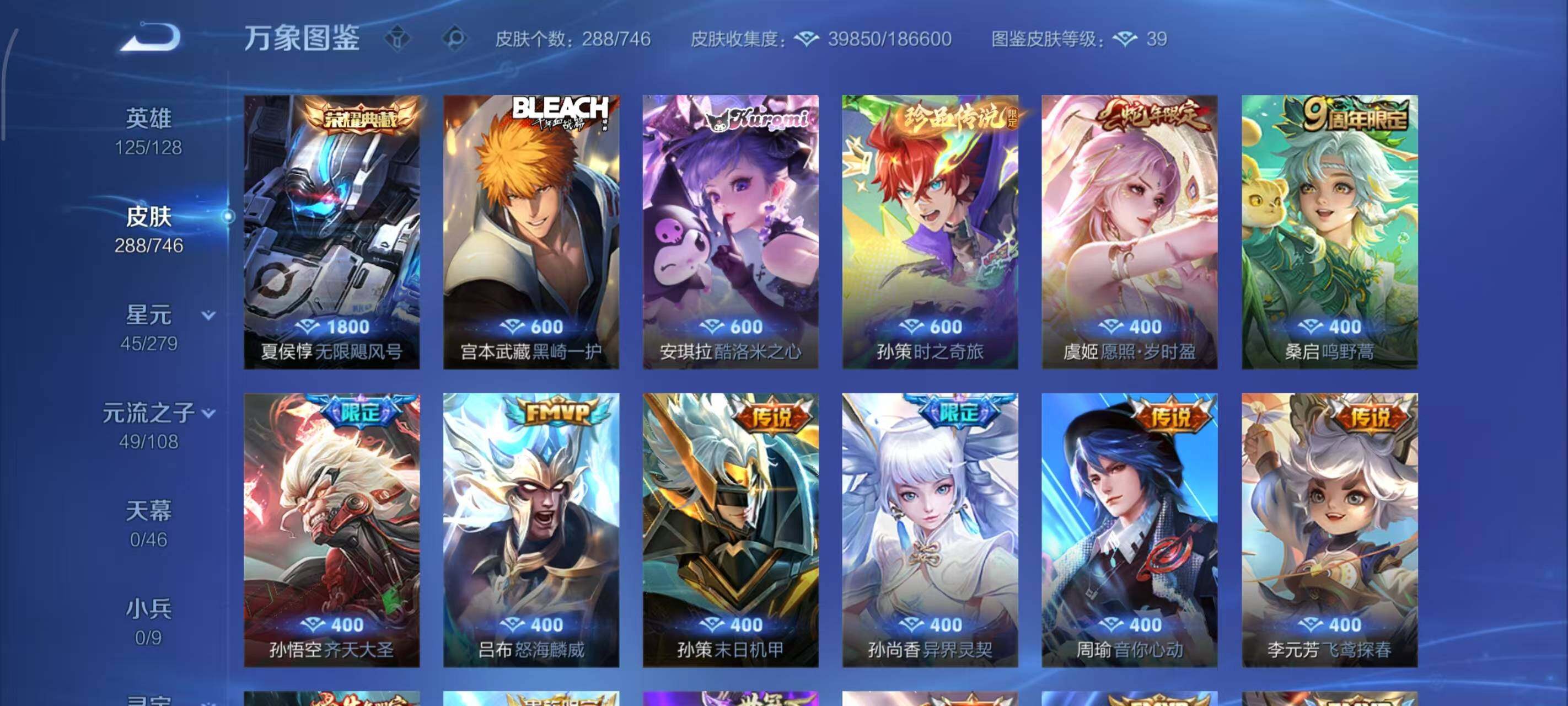 【传说皮肤】:虞姬愿照岁时盈,桑启鸣野蒿,孙悟空齐天大圣,吕布怒海麟威,孙策末日机甲,孙尚香异界灵契,周瑜音你心动,李元芳飞鸢探春,诸葛亮时雨天司,虞姬启明星使,李信一念神魔,刘备时之恋人,貂蝉猫影幻舞,干将莫邪久胜战神,后羿黄金射手座,貂蝉仲夏夜之梦,宫本武藏地狱之眼,吕布天魔缭乱
