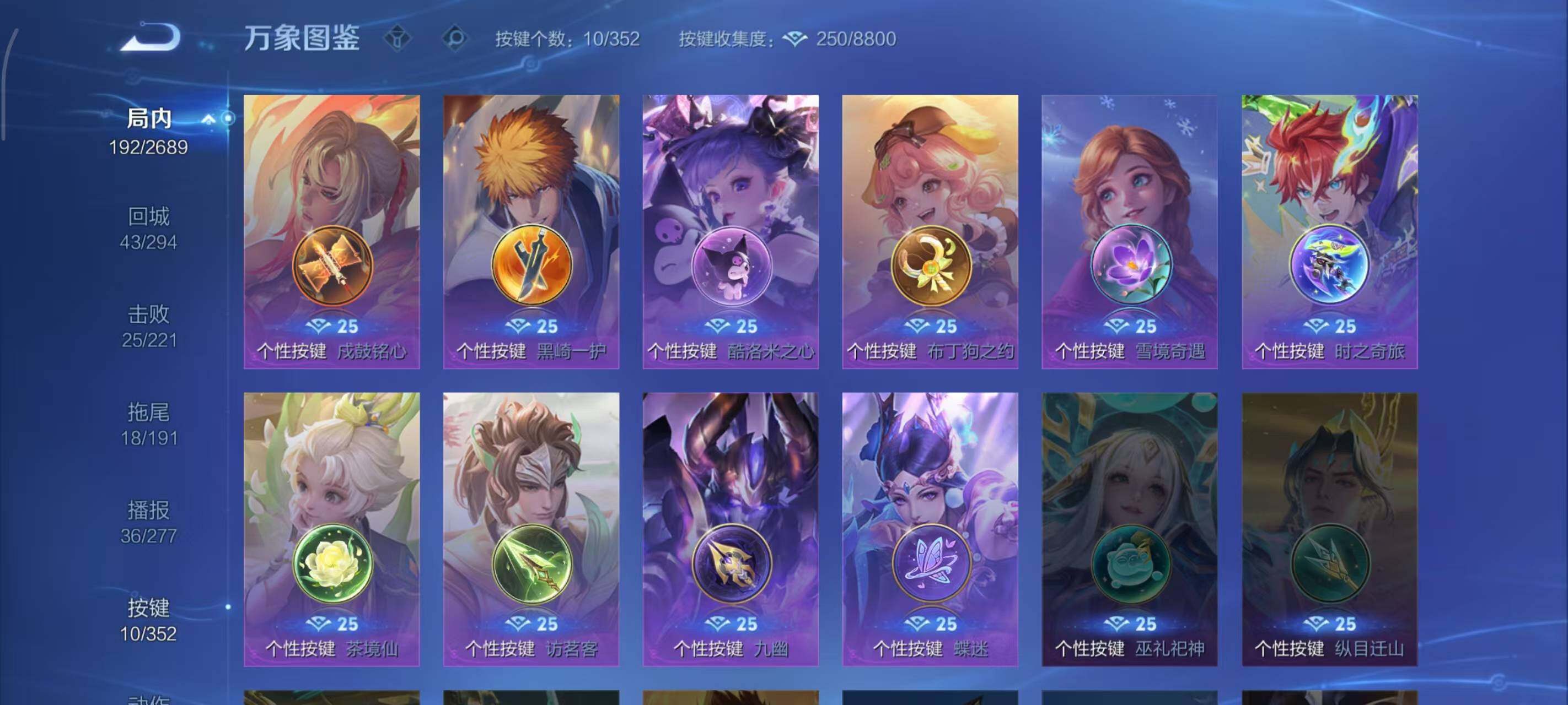 小乔青蛇,伽罗箭羽风息,李元芳逐浪之夏,孙策猫狗日记,诸葛亮黄金分割率,吕布末日机甲,橘右京修罗,刘禅绅士熊喵,白起星夜王子,安琪拉心灵骇客,程咬金功夫厨神,刘邦德古拉伯爵,兰陵王暗隐猎兽者,曹操幽灵船长,宫本武藏鬼剑武藏,亚瑟心灵战警,钟馗乐园奇幻夜,廉颇地狱岩魂,夏侯惇乘风破浪,花木兰水晶猎龙者,铠曙光守护者,墨子金属风暴,吕布圣诞狂欢,貂蝉圣诞恋歌,百里守约特工魅影,嬴政暗夜贵公子,高渐离天秀·音浪,蒙犽百解令,赵怀真器灵·浮梦炉