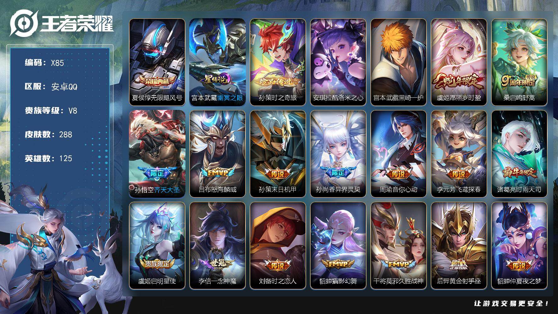 [13868989]金标吕布安卓Q-V8-288皮肤-1典藏-3珍品传说-18传说-65史诗 【英雄全皮】:蒙恬全皮,戈娅全皮,空空儿全皮,影全皮 【荣耀典藏】:夏侯惇无限飓风号 【珍品传说】:孙策时之奇旅,安琪拉酷洛米之心,宫本武藏黑崎一护 【传说皮肤】:虞姬愿照岁时盈,桑启鸣野蒿,孙悟空齐天大圣,吕布怒海麟威,孙策末日机甲,孙尚香异界灵契,周瑜音你心动,李元芳飞鸢探春,诸葛亮时雨天司,虞姬启明星使,李信一念神魔,刘备时之恋人,貂蝉猫影幻舞,干将莫邪久胜战神,后羿黄金射手座,貂蝉仲夏夜之梦,宫本武藏地狱之眼,吕布天魔缭乱 【限定皮肤】:姜子牙天穹之誓,狄仁杰阴阳师,赵云皇家上将,赵云引擎之心,孙尚香蔷薇恋人,孙尚香异界灵契,钟无艳超时空战士,扁鹊奇幻香踪,白起夜都怪侠,芈月幻夜卜梦,吕布天魔缭乱,吕布御风骁将,元歌无心,甄姬落雪兰心,典韦岱宗,马可波罗暗影游猎,马可波罗山海玄木吟,狄仁杰魔术师,达摩沙漠行僧,项羽海滩派对,关羽冰锋战神,韩信飞衡,王昭君午后时光,兰陵王金庭之子,亚瑟潮玩骑士王,孙悟空孙行者,孙悟空齐天大圣,后羿圣弓游侠,李元芳云中旅人,虞姬启明星使,杨戬潮玩骑兵,干将莫邪胡桃夹子,鬼谷子五谷丰年,诸葛亮时雨天司,黄忠火炮绅士,百里守约朱雀志,沈梦溪大漠名商,明世隐吟游魔法,裴擒虎李小龙,裴擒虎擒涛扼浪,狂铁电玩高手,嫦娥暖冬兔眠,西施玲珑珍味,鲁班大师探海日志,桑启海盐诗旅,暃星界游侠,戈娅驭风魔法,艾琳流音漫舞,司空震地狱燃心,阿古朵江河有灵,张良古海寻踪,蒙犽百解令,蒙恬荣光圣徽,鬼谷子天穹祈灯,沈梦溪龙舞盛年,刘邦剑破天穹,程咬金群星魔术团 【年限皮肤】:百里守约朱雀志,吕布御风骁将,诸葛亮时雨天司,韩信飞衡,典韦岱宗,马可波罗山海玄木吟 【赛季限定】:达摩沙漠行僧,兰陵王金庭之子,张良古海寻踪,李元芳云中旅人,沈梦溪大漠名商,裴擒虎擒涛扼浪,鲁班大师探海日志,桑启海盐诗旅,鬼谷子天穹祈灯,蒙恬荣光圣徽,刘邦剑破天穹,姜子牙天穹之誓 【战令限定】:钟无艳超时空战士,扁鹊奇幻香踪,白起夜都怪侠,芈月幻夜卜梦,甄姬落雪兰心,马可波罗暗影游猎,王昭君午后时光,艾琳流音漫舞,亚瑟潮玩骑士王,后羿圣弓游侠,杨戬潮玩骑兵,黄忠火炮绅士,明世隐吟游魔法,狂铁电玩高手,嫦娥暖冬兔眠,西施玲珑珍味,司空震地狱燃心,暃星界游侠,戈娅驭风魔法 【史诗皮肤】:赵云皇家上将,貂蝉圣诞恋
