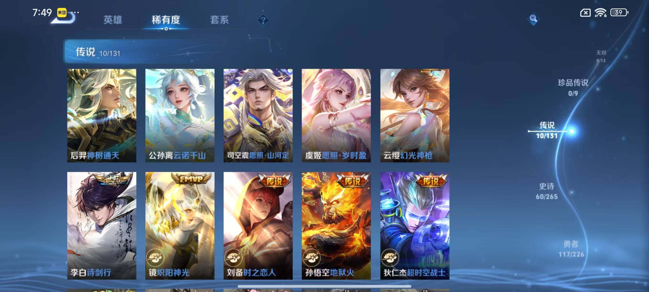 【传说皮肤】:后羿神树通天,公孙离云诺千山,司空震愿照山河定,虞姬愿照岁时盈,云缨幻光神枪,李白诗剑行,镜炽阳神光,刘备时之恋人,孙悟空地狱火,狄仁杰超时空战士