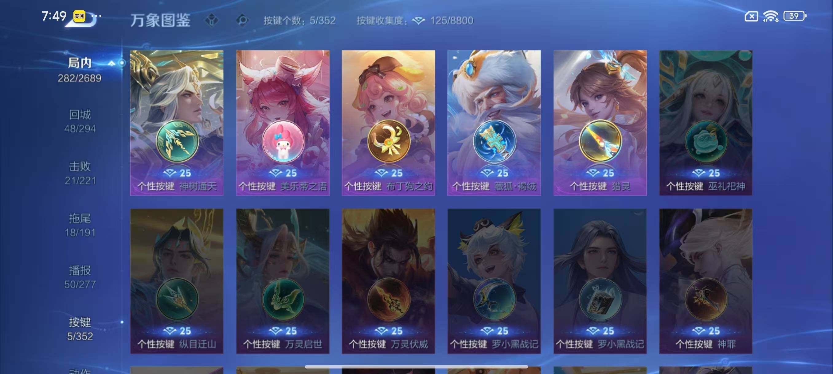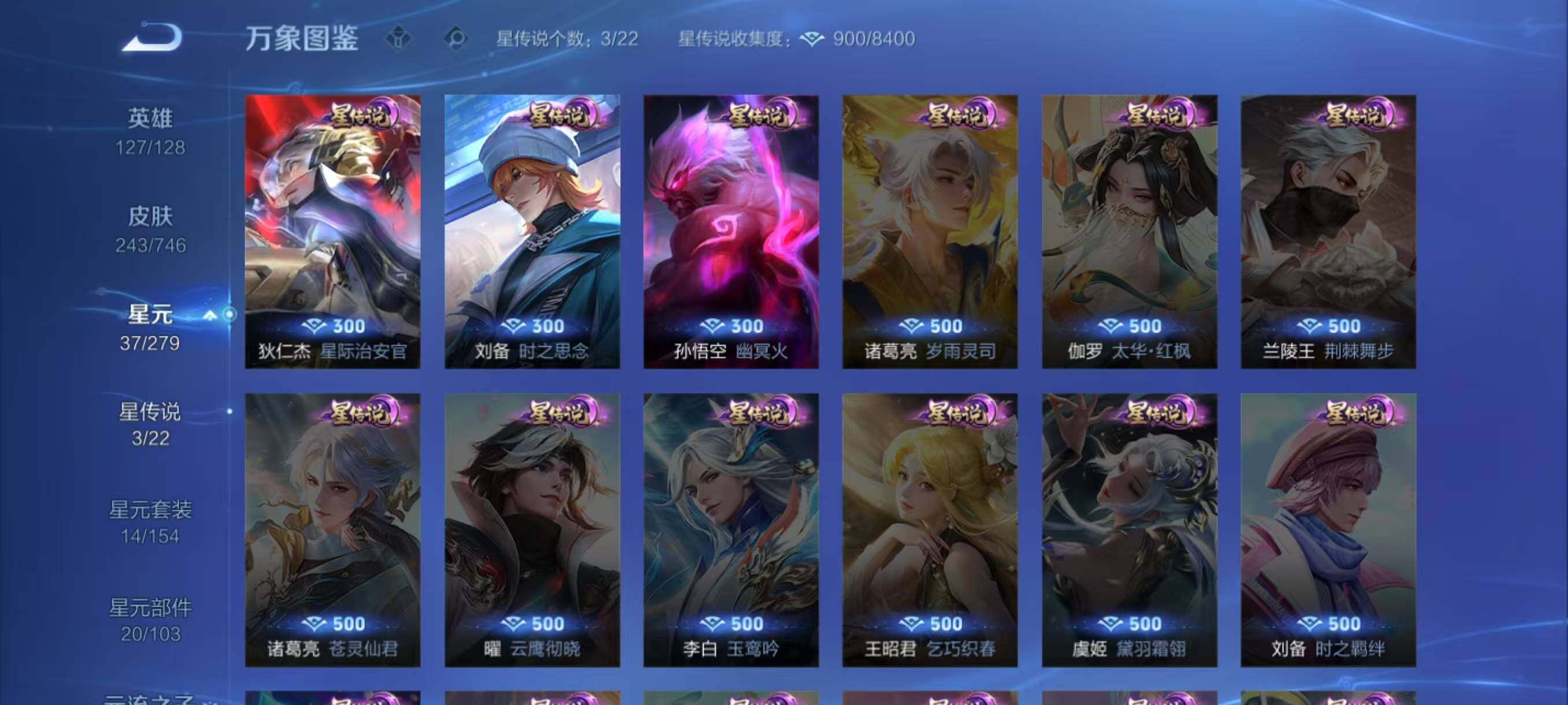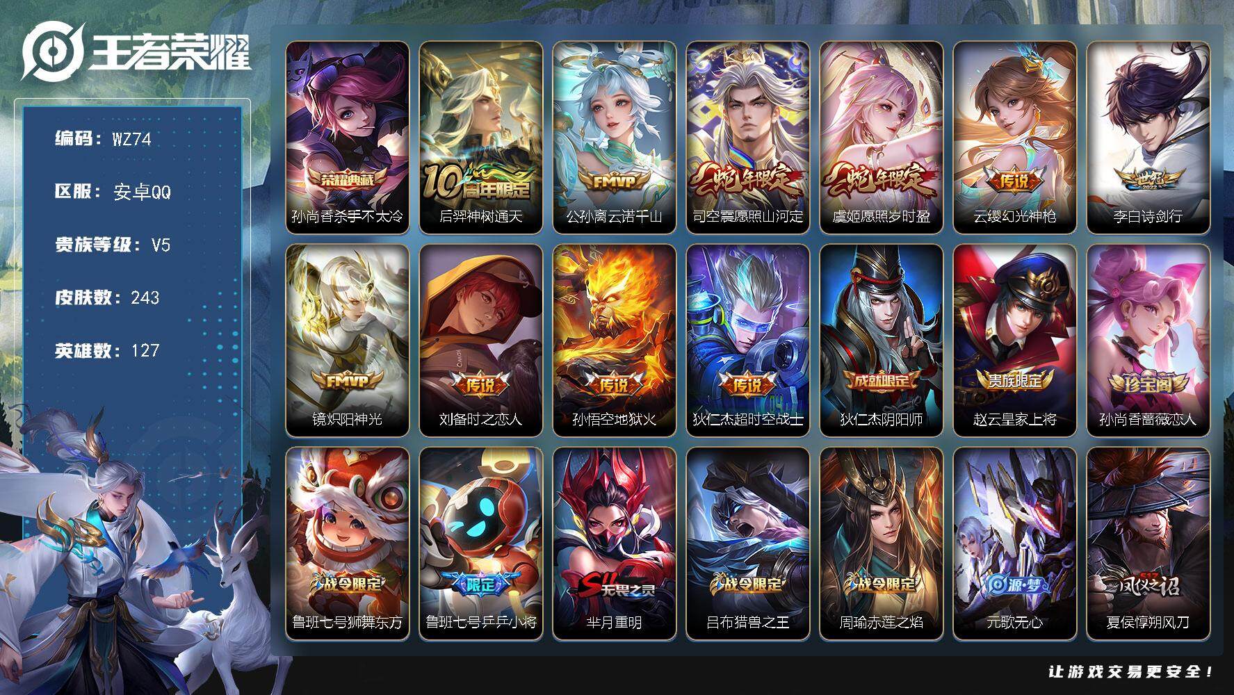 - [12226910]V7 1典藏 2珍品传说 9传说 124英雄 269皮肤 可修改实名 优质装备:鸣剑·曳影,大耳狗之梦,云鹰飞将(小将军),一念神魔,音你闪耀(rap皮),惊梅引,玄雷天君 珍品传说:时之奇旅-孙策 传说皮:幻光神枪 珍宝阁皮:优雅恋人,蔷薇恋人 限定皮:愿照·岁时盈(虞姬年限),逐霄战戟,鸣野蒿,夏侯惇霜北刀,梁祝,天狼溯光者,李小龙,逐梦之影,大圣娶亲 史诗皮:鸭鸭历险记-刘禅,器灵·浮梦炉,化蝶舞,星界战将,龙之律动,石田雨龙,茶境仙,撼地雄心,破空之剑,蒙犽顽岩魄,百相守梦-百里守约,百相守梦-黄忠,紫霞仙子,黄金分割率,特工魅影,千年之狐,银翎春语,蒙恬荣光圣徽,偶像歌手,白蛇,魅语,晚萤,青蛇,末日机甲-吕布,猫狗日记-孙策,猫狗日记-大乔,时之恋人-孙尚香,乱世虎臣,节奏热浪,修罗,女仆咖啡,摇滚巨星,水果甜心,绅士熊喵,天才门将,星夜王子,功夫厨神,暗隐猎兽者,幽灵船长,鬼剑武藏,乐园奇幻夜,天秀·启明,舞动绿茵,地狱岩魂,纤云弄巧,繁星吟游(呼啦呼啦),拒霜思,乘风破浪,水晶猎龙者,热力回旋,箭羽风息,圣诞恋歌,鹰眼统帅,暗夜贵公子,魅力维加斯,黎明之约,赏金猎手,奇遇舞章,天秀·音浪