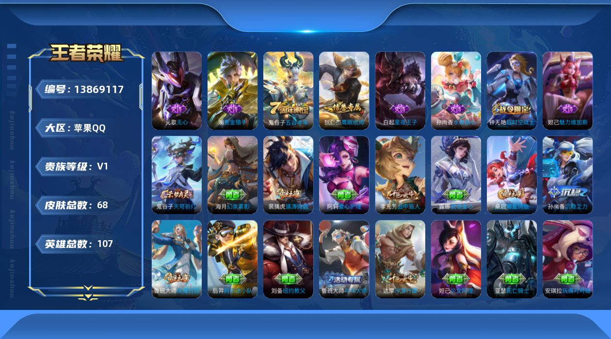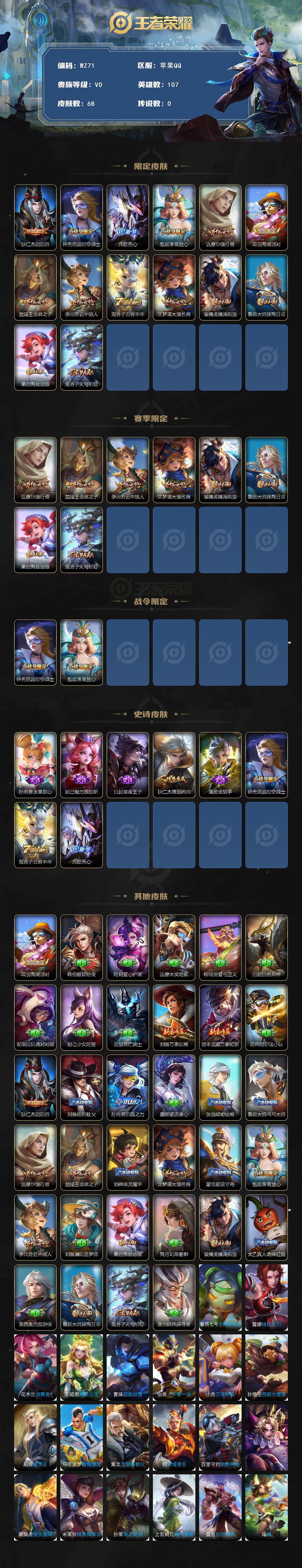[13869117]苹果Q--68皮肤-8史诗 【限定皮肤】:狄仁杰阴阳师,钟无艳超时空战士,元歌无心,甄姬落雪兰心,达摩沙漠行僧,项羽海滩派对,兰陵王金庭之子,李元芳云中旅人,鬼谷子五谷丰年,沈梦溪大漠名商,裴擒虎擒涛扼浪,鲁班大师探海日志,桑启海盐诗旅,鬼谷子天穹祈灯 【赛季限定】:达摩沙漠行僧,兰陵王金庭之子,李元芳云中旅人,沈梦溪大漠名商,裴擒虎擒涛扼浪,鲁班大师探海日志,桑启海盐诗旅,鬼谷子天穹祈灯 【战令限定】:钟无艳超时空战士,甄姬落雪兰心 【史诗皮肤】:孙尚香水果甜心,妲己魅力维加斯,白起星夜王子,狄仁杰鹰眼统帅,澜赏金猎手,钟无艳超时空战士,鬼谷子五谷丰年,元歌无心 【其他皮肤】:项羽海滩派对,韩信教廷特使,阿轲爱心护理,达摩大发明家,程咬金爱与正义,白起白色死神,安琪拉玩偶对对碰,妲己少女阿狸,亚瑟死亡骑士,刘备万事如意,宫本武藏万象初新,后羿阿尔法小队,狄仁杰阴阳师,刘备纽约教父,孙尚香沉稳之力,露娜瓷语鉴心,张良缤纷绘卷,鲁班大师乓乓大师,达摩沙漠行僧,兰陵王金庭之子,刘禅唤灵魔甲,沈梦溪大漠名商,蒙恬蔚蓝守将,甄姬落雪兰心,李元芳云中旅人,刘备潮玩造梦师,桑启海盐诗旅,海月幻泉雾影,裴擒虎擒涛扼浪,太乙真人劲辣红锅,莱西奥西部游侠,鲁班大师探海日志,鬼谷子天穹祈灯,盘古经纬探寻者,鲁班七号木偶奇遇记,露娜绯红之刃,花木兰剑舞者,王昭君精灵公主,曹操超能战警,张良一千零一夜,小乔万圣前夜,孙悟空西部大镖客,后羿精灵王,马可波罗激情绿茵,黄忠芝加哥教父,铠龙域领主,百里守约绝影神枪,百里玄策威尼斯狂欢,裴擒虎街头旋风,米莱狄精准探案法,孙策海之征途,上官婉儿修竹墨客,盘古创世神祝,瑶森,曜归虚梦演,西施归虚梦演,蒙恬秩序猎龙将,澜孤猎,云缨赤焰之缨,桑启画中游 【营地ID】:1703281323
