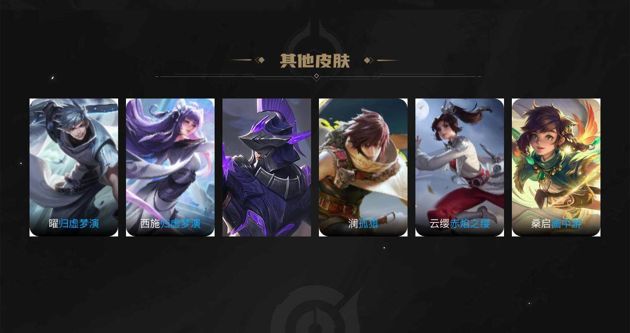 【其他皮肤】:项羽海滩派对,韩信教廷特使,阿轲爱心护理,达摩大发明家,程咬金爱与正义,白起白色死神,安琪拉玩偶对对碰,妲己少女阿狸,亚瑟死亡骑士,刘备万事如意,宫本武藏万象初新,后羿阿尔法小队,狄仁杰阴阳师,刘备纽约教父,孙尚香沉稳之力,露娜瓷语鉴心,张良缤纷绘卷,鲁班大师乓乓大师,达摩沙漠行僧,兰陵王金庭之子,刘禅唤灵魔甲,沈梦溪大漠名商,蒙恬蔚蓝守将,甄姬落雪兰心,李元芳云中旅人,刘备潮玩造梦师,桑启海盐诗旅,海月幻泉雾影,裴擒虎擒涛扼浪,太乙真人劲辣红锅,莱西奥西部游侠,鲁班大师探海日志,鬼谷子天穹祈灯,盘古经纬探寻者,鲁班七号木偶奇遇记,露娜绯红之刃,花木兰剑舞者,王昭君精灵公主,曹操超能战警,张良一千零一夜,小乔万圣前夜,孙悟空西部大镖客,后羿精灵王,马可波罗激情绿茵,黄忠芝加哥教父,铠龙域领主,百里守约绝影神枪,百里玄策威尼斯狂欢,裴擒虎街头旋风,米莱狄精准探案法,孙策海之征途,上官婉儿修竹墨客,盘古创世神祝,瑶森,曜归虚梦演,西施归虚梦演,蒙恬秩序猎龙将,澜孤猎,云缨赤焰之缨,桑启画中游