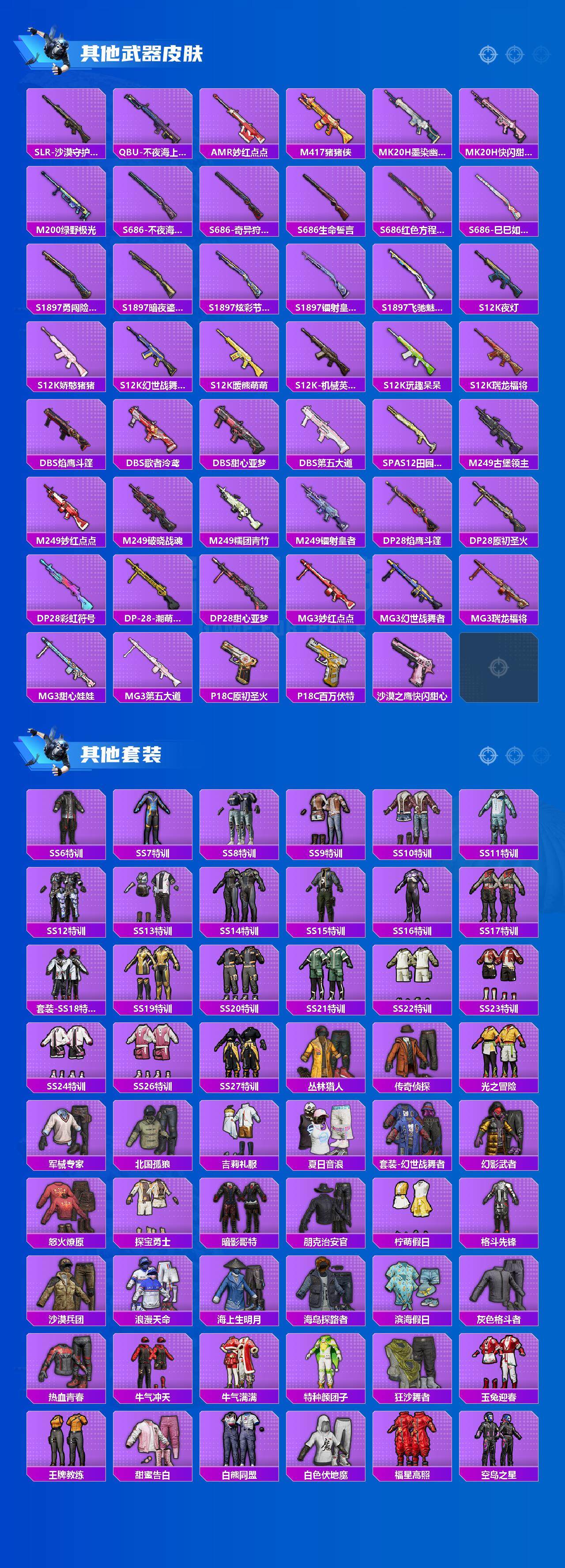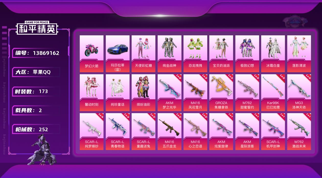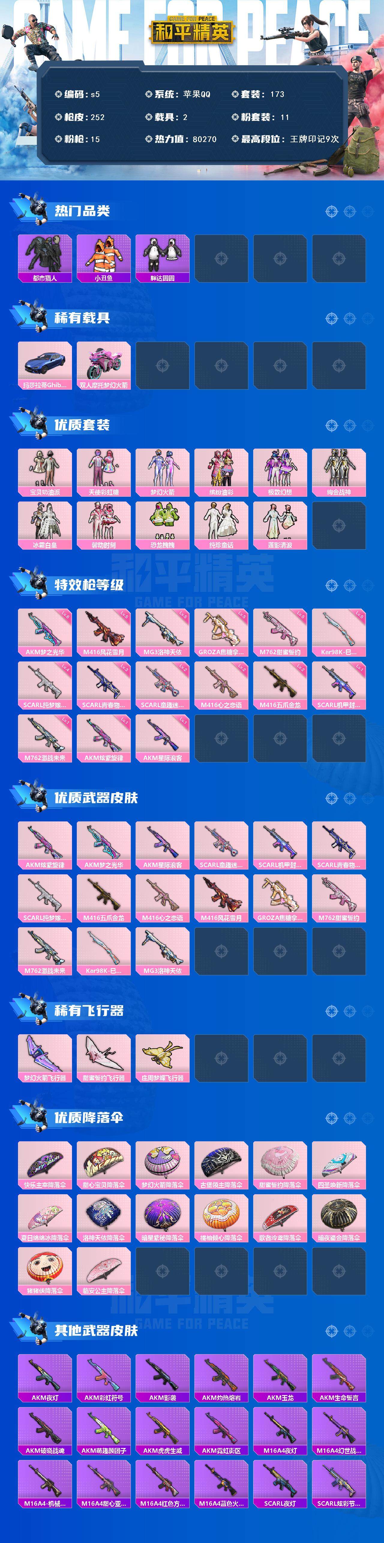 [13869162]苹果 手Q-11粉装-15特效枪-2载具-3粉色飞行器-80270热力值-9王牌印记-173套装-252枪皮 【热门品类】:粉装-梦幻火箭,粉装-缤纷油彩,套装-浪漫天命,套装-都市猎人,套装-小丑鱼,套装-奇异狩猎者,套装-胖达圆圆,套装-潮萌小黄鸭,套装-暗影哥特,套装-浪漫波比 【粉色载具】:玛莎拉蒂Ghibli(蓝),双人摩托-梦幻火箭 【粉色套装】:粉装-宝贝奶油派,粉装-天使彩虹糖,粉装-梦幻火箭,粉装-缤纷油彩,粉装-极致幻想,粉装-绚金战神,粉装-冰霜白皇,粉装-馨动时刻,粉装-恐龙拽拽,粉装-纯珍童话,粉装-莲影清波 【粉色枪皮等级】:AKM-炫紫旋律(一级),AKM-梦之光华(六级),AKM-星际浪客(一级),SCAR-L-童趣迷兔(二级),SCAR-L-机甲封神(一级),SCAR-L-青春物语(三级),SCAR-L-纯梦嫁纱(四级),M416-五爪金龙(二级),M416-心之恋语(二级),M416-风花雪月(五级),GROZA-焦糖拿铁(五级),M762-甜蜜誓约(五级),M762-激战未来(一级),Kar98K-巳巳如意(五级),MG3-洛神天依(五级) 【粉色枪皮】:AKM-炫紫旋律,AKM-梦之光华,AKM-星际浪客,SCAR-L-童趣迷兔,SCAR-L-机甲封神,SCAR-L-青春物语,SCAR-L-纯梦嫁纱,M416-五爪金龙,M416-心之恋语,M416-风花雪月,GROZA-焦糖拿铁,M762-甜蜜誓约,M762-激战未来,Kar98K-巳巳如意,MG3-洛神天依 【粉色飞行器】:梦幻火箭飞行器,甜蜜誓约飞行器,庄周梦蝶飞行器 【粉色降落伞】:快乐主宰降落伞,甜心宝贝降落伞,梦幻火箭降落伞,古堡领主降落伞,甜蜜誓约降落伞,四圣焕新降落伞,夏日绵绵冰降落伞,洛神天依降落伞,暗星紫秘降落伞,橘柚倾心降落伞,歌者泠鸢降落伞,暗夜鎏金降落伞,猪猪侠降落伞,临安公主降落伞 【稀有枪皮】:AKM-夜灯,AKM-彩虹符号,AKM-影袭,AKM-灼热熔岩,AKM-玉龙,AKM-生命誓言,AKM-破晓战魂,AKM-萌趣颜团子,AKM-虎虎生威,AKM-霓虹街区,M16A4-夜灯,M16A4-幻世战舞者,M16A4-机械英豪,M16A4-甜心亚梦,M16A4-红色方程式,M16A4-蓝色火焰,SCAR-L-夜灯,SCAR-L-炫彩节奏,SCAR-L