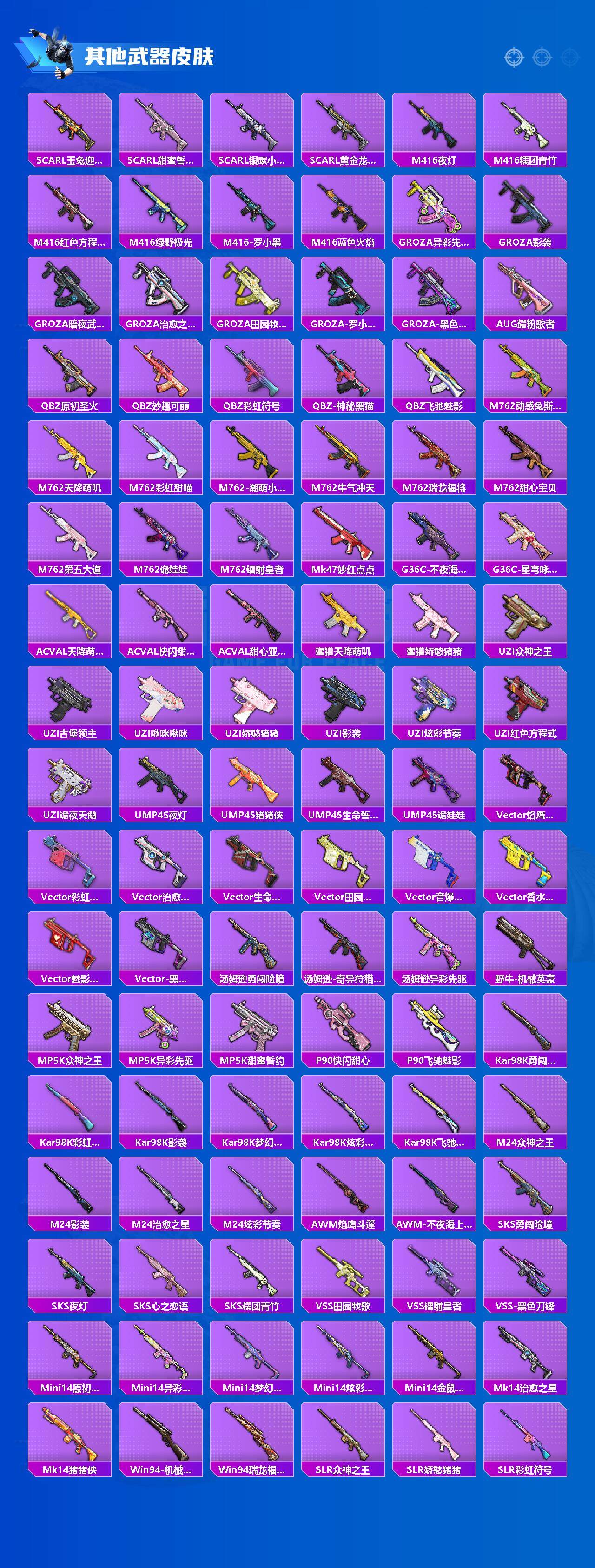 AKM-炫紫旋律,AKM-梦之光华,AKM-星际浪客,SCAR-L-童趣迷兔,SCAR-L-机甲封神,SCAR-L-青春物语,SCAR-L-纯梦嫁纱,M416-五爪金龙,M416-心之恋语,M416-风花雪月,GROZA-焦糖拿铁,M762-甜蜜誓约,M762-激战未来,Kar98K-巳巳如意,MG3-洛神天依