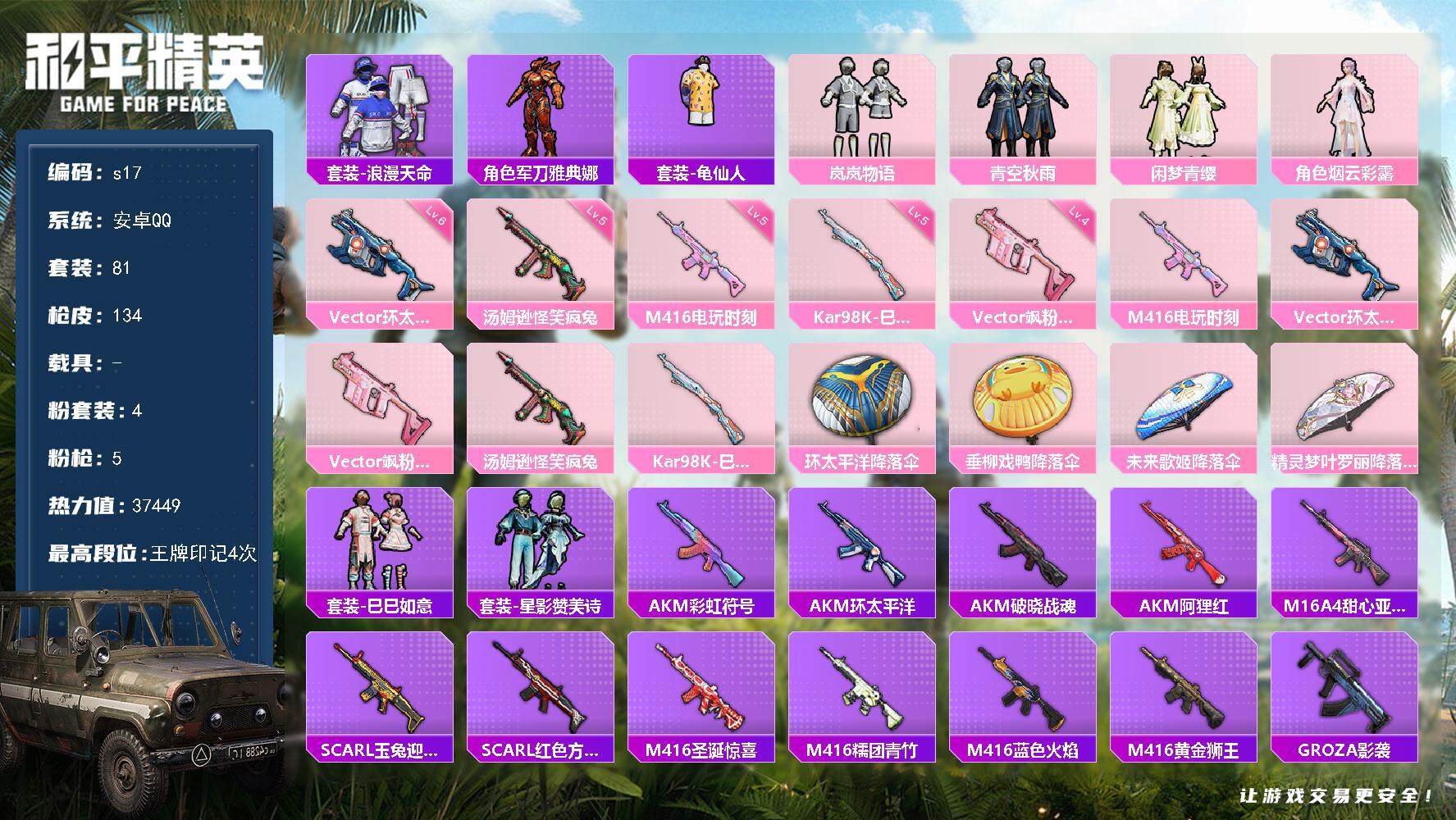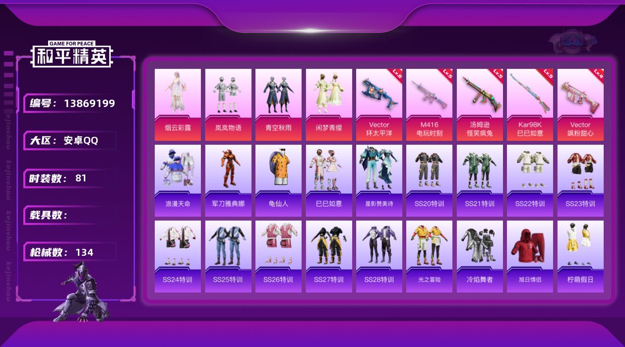 [13869199]安卓 手Q-4粉装-5特效枪-0载具-0粉色飞行器-37449热力值-4王牌印记-81套装-134枪皮