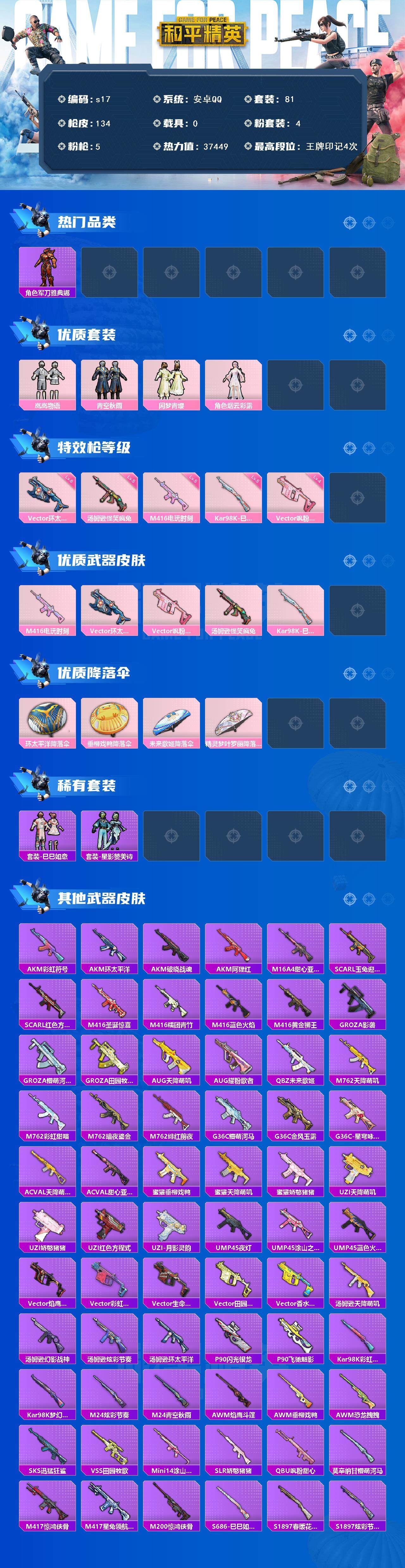 [13869199]安卓 手Q-4粉装-5特效枪-0载具-0粉色飞行器-37449热力值-4王牌印记-81套装-134枪皮 【热门品类】:套装-浪漫天命,角色-军刀雅典娜,套装-龟仙人 【粉色套装】:粉装-岚岚物语,粉装-青空秋雨,粉装-闲梦青缨,角色-烟云彩露 【粉色枪皮等级】:M416-电玩时刻(五级),Vector-环太平洋(六级),Vector-飒粉甜心(四级),汤姆逊-怪笑疯兔(五级),Kar98K-巳巳如意(五级) 【粉色枪皮】:M416-电玩时刻,Vector-环太平洋,Vector-飒粉甜心,汤姆逊-怪笑疯兔,Kar98K-巳巳如意 【粉色降落伞】:环太平洋降落伞,垂柳戏鸭降落伞,未来歌姬降落伞,精灵梦叶罗丽降落伞 【稀有套装】:套装-龟仙人,套装-巳巳如意,套装-星影赞美诗 【稀有枪皮】:AKM-彩虹符号,AKM-环太平洋,AKM-破晓战魂,AKM-阿狸红,M16A4-甜心亚梦,SCAR-L-玉兔迎春,SCAR-L-红色方程式,M416-圣诞惊喜,M416-糯团青竹,M416-蓝色火焰,M416-黄金狮王,GROZA-影袭,GROZA-懵萌河马,GROZA-田园牧歌,AUG-天降萌叽,AUG-耀粉歌者,QBZ-未来歌姬,M762-天降萌叽,M762-彩虹甜喵,M762-暗夜鎏金,M762-绯红前夜,G36C-懵萌河马,G36C-金风玉露,G36C-星穹咏叹调,AC-VAL-天降萌叽,AC-VAL-甜心亚梦,蜜獾-垂柳戏鸭,蜜獾-天降萌叽,蜜獾-娇憨猪猪,UZI-天降萌叽,UZI-娇憨猪猪,UZI-红色方程式,UZI-月影灵韵,UMP45-夜灯,UMP45-涂山之恋,UMP45-蓝色火焰,Vector-焰鹰斗篷,Vector-彩虹符号,Vector-生命誓言,Vector-田园牧歌,Vector-香水柠檬,汤姆逊-天降萌叽,汤姆逊-幻影战神,汤姆逊-炫彩节奏,汤姆逊-环太平洋,P90-闪光银龙,P90-飞驰魅影,Kar98K-彩虹符号,Kar98K-梦幻火箭,M24-炫彩节奏,M24-青空秋雨,AWM-焰鹰斗篷,AWM-垂柳戏鸭,AWM-恐龙拽拽,SKS-迅猛狂鲨,VSS-田园牧歌,Mini14-涂山之恋,SLR-娇憨猪猪,QBU-飒粉甜心,莫辛纳甘-懵萌河马,M417-惊鸿侠骨,M417-星兔领航员,M200-惊鸿侠骨,S686-巳巳如意,S1897-春暖花开,S1