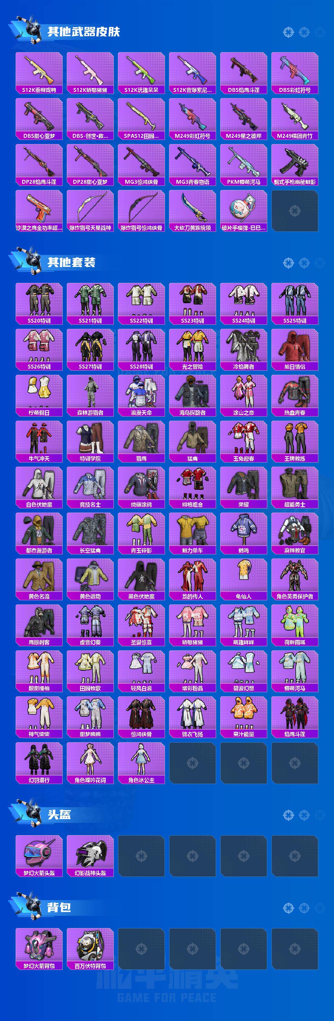 【稀有枪皮】:AKM-彩虹符号,AKM-环太平洋,AKM-破晓战魂,AKM-阿狸红,M16A4-甜心亚梦,SCAR-L-玉兔迎春,SCAR-L-红色方程式,M416-圣诞惊喜,M416-糯团青竹,M416-蓝色火焰,M416-黄金狮王,GROZA-影袭,GROZA-懵萌河马,GROZA-田园牧歌,AUG-天降萌叽,AUG-耀粉歌者,QBZ-未来歌姬,M762-天降萌叽,M762-彩虹甜喵,M762-暗夜鎏金,M762-绯红前夜,G36C-懵萌河马,G36C-金风玉露,G36C-星穹咏叹调,AC-VAL-天降萌叽,AC-VAL-甜心亚梦,蜜獾-垂柳戏鸭,蜜獾-天降萌叽,蜜獾-娇憨猪猪,UZI-天降萌叽,UZI-娇憨猪猪,UZI-红色方程式,UZI-月影灵韵,UMP45-夜灯,UMP45-涂山之恋,UMP45-蓝色火焰,Vector-焰鹰斗篷,Vector-彩虹符号,Vector-生命誓言,Vector-田园牧歌,Vector-香水柠檬,汤姆逊-天降萌叽,汤姆逊-幻影战神,汤姆逊-炫彩节奏,汤姆逊-环太平洋,P90-闪光银龙,P90-飞驰魅影,Kar98K-彩虹符号,Kar98K-梦幻火箭,M24-炫彩节奏,M24-青空秋雨,AWM-焰鹰斗篷,AWM-垂柳戏鸭,AWM-恐龙拽拽,SKS-迅猛狂鲨,VSS-田园牧歌,Mini14-涂山之恋,SLR-娇憨猪猪,QBU-飒粉甜心,莫辛纳甘-懵萌河马,M417-惊鸿侠骨,M417-星兔领航员,M200-惊鸿侠骨,S686-巳巳如意,S1897-春暖花开,S1