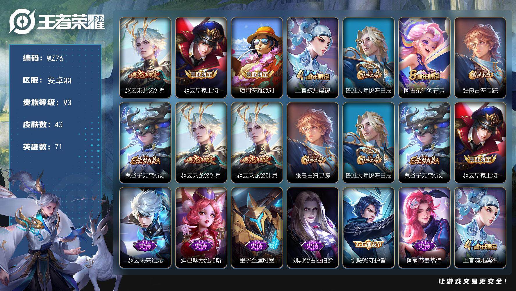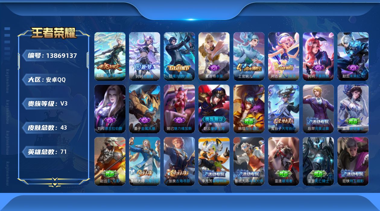 [13869137]安卓Q-V3-43皮肤说-1传说-11史诗 【传说皮肤】:赵云乘龙铭钟鼎 【限定皮肤】:赵云皇家上将,项羽海滩派对,上官婉儿梁祝,鲁班大师探海日志,阿古朵江河有灵,张良古海寻踪,鬼谷子天穹祈灯,赵云乘龙铭钟鼎 【年限皮肤】:赵云乘龙铭钟鼎 【赛季限定】:张良古海寻踪,鲁班大师探海日志,鬼谷子天穹祈灯 【史诗皮肤】:赵云皇家上将,赵云未来纪元,妲己魅力维加斯,墨子金属风暴,刘邦德古拉伯爵,铠曙光守护者,阿轲节奏热浪,上官婉儿梁祝,夏洛特永昼,阿古朵江河有灵,阿轲化蝶舞 【其他皮肤】:项羽海滩派对,韩信教廷特使,韩信街头霸王,露娜哥特玫瑰,赵云忍炎影,白起白色死神,安琪拉玩偶对对碰,亚瑟死亡骑士,花木兰兔女郎,王昭君幻想奇妙夜,诸葛亮掌控之力,苏烈坚韧之力,狂铁特工战影,露娜瓷语鉴心,鲁班大师乓乓大师,鲁班大师探海日志,李元芳妄想特派,张良古海寻踪,亚连破局者,兰陵王幻夜行动,后羿完美运算,鬼谷子天穹祈灯,曹操超能战警,孙悟空西部大镖客,李白范海辛,马可波罗激情绿茵,铠龙域领主,孙策海之征途,李信灼热之刃,曜归虚梦演,澜孤猎 【内测皮肤】:狂铁特工战影 【营地ID】:1673620964